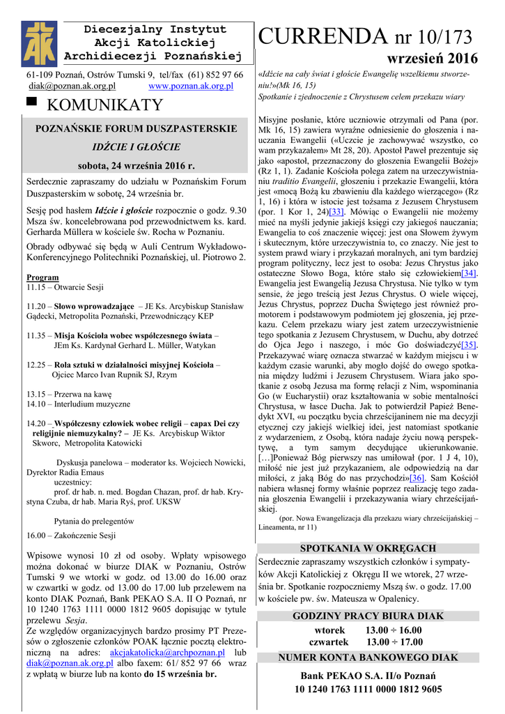 Diecezjalny Instytut Akcji Katolickiej Archidiecezji Poznańskiej 61-109 Poznań, Ostrów Tumski 9, tel/fax (61) 852 97 66 [email protected] www.poznan.ak.org.pl ▀ KOMUNIKATY POZNAŃSKIE FORUM DUSZPASTERSKIE IDŹCIE I GŁOŚCIE sobota, 24 września 2016 r. Serdecznie zapraszamy do udziału w Poznańskim Forum Duszpasterskim w sobotę, 24 września br. Sesję pod hasłem Idźcie i głoście rozpocznie o godz. 9.30 Msza św. koncelebrowana pod przewodnictwem ks. kard. Gerharda Müllera w kościele św. Rocha w Poznaniu. Obrady odbywać się będą w Auli Centrum WykładowoKonferencyjnego Politechniki Poznańskiej, ul. Piotrowo 2. Program 11.15 – Otwarcie Sesji 11.20 – Słowo wprowadzające – JE Ks. Arcybiskup Stanisław Gądecki, Metropolita Poznański, Przewodniczący KEP 11.35 – Misja Kościoła wobec współczesnego świata – JEm Ks. Kardynał Gerhard L. Müller, Watykan 12.25 – Rola sztuki w działalności misyjnej Kościoła – Ojciec Marco Ivan Rupnik SJ, Rzym 13.15 – Przerwa na kawę 14.10 – Interludium muzyczne 14.20 – Współczesny człowiek wobec religii – capax Dei czy religijnie niemuzykalny? – JE Ks. Arcybiskup Wiktor Skworc, Metropolita Katowicki Dyskusja panelowa – moderator ks. Wojciech Nowicki, Dyrektor Radia Emaus uczestnicy: prof. dr hab. n. med. Bogdan Chazan, prof. dr hab. Krystyna Czuba, dr hab. Maria Ryś, prof. UKSW Pytania do prelegentów 16.00 – Zakończenie Sesji Wpisowe wynosi 10 zł od osoby. Wpłaty wpisowego można dokonać w biurze DIAK w Poznaniu, Ostrów Tumski 9 we wtorki w godz. od 13.00 do 16.00 oraz w czwartki w godz. od 13.00 do 17.00 lub przelewem na konto DIAK Poznań, Bank PEKAO S.A. II O Poznań, nr 10 1240 1763 1111 0000 1812 9605 dopisując w tytule przelewu Sesja. Ze względów organizacyjnych bardzo prosimy PT Prezesów o zgłoszenie członków POAK łącznie pocztą elektroniczną na adres: [email protected] lub [email protected] albo faxem: 61/ 852 97 66 wraz z wpłatą w biurze lub na konto do 15 września br. CURRENDA nr 10/173 wrzesień 2016 «Idźcie na cały świat i głoście Ewangelię wszelkiemu stworzeniu!»(Mk 16, 15) Spotkanie i zjednoczenie z Chrystusem celem przekazu wiary Misyjne posłanie, które uczniowie otrzymali od Pana (por. Mk 16, 15) zawiera wyraźne odniesienie do głoszenia i nauczania Ewangelii («Uczcie je zachowywać wszystko, co wam przykazałem» Mt 28, 20). Apostoł Paweł prezentuje się jako «apostoł, przeznaczony do głoszenia Ewangelii Bożej» (Rz 1, 1). Zadanie Kościoła polega zatem na urzeczywistnianiu traditio Evangelii, głoszeniu i przekazie Ewangelii, która jest «mocą Bożą ku zbawieniu dla każdego wierzącego» (Rz 1, 16) i która w istocie jest tożsama z Jezusem Chrystusem (por. 1 Kor 1, 24)[33]. Mówiąc o Ewangelii nie możemy mieć na myśli jedynie jakiejś księgi czy jakiegoś nauczania; Ewangelia to coś znaczenie więcej: jest ona Słowem żywym i skutecznym, które urzeczywistnia to, co znaczy. Nie jest to system prawd wiary i przykazań moralnych, ani tym bardziej program polityczny, lecz jest to osoba: Jezus Chrystus jako ostateczne Słowo Boga, które stało się człowiekiem[34]. Ewangelia jest Ewangelią Jezusa Chrystusa. Nie tylko w tym sensie, że jego treścią jest Jezus Chrystus. O wiele więcej, Jezus Chrystus, poprzez Ducha Świętego jest również promotorem i podstawowym podmiotem jej głoszenia, jej przekazu. Celem przekazu wiary jest zatem urzeczywistnienie tego spotkania z Jezusem Chrystusem, w Duchu, aby dotrzeć do Ojca Jego i naszego, i móc Go doświadczyć[35]. Przekazywać wiarę oznacza stwarzać w każdym miejscu i w każdym czasie warunki, aby mogło dojść do owego spotkania między ludźmi i Jezusem Chrystusem. Wiara jako spotkanie z osobą Jezusa ma formę relacji z Nim, wspominania Go (w Eucharystii) oraz kształtowania w sobie mentalności Chrystusa, w łasce Ducha. Jak to potwierdził Papież Benedykt XVI, «u początku bycia chrześcijaninem nie ma decyzji etycznej czy jakiejś wielkiej idei, jest natomiast spotkanie z wydarzeniem, z Osobą, która nadaje życiu nową perspektywę, a tym samym decydujące ukierunkowanie. […]Ponieważ Bóg pierwszy nas umiłował (por. 1 J 4, 10), miłość nie jest już przykazaniem, ale odpowiedzią na dar miłości, z jaką Bóg do nas przychodzi»[36]. Sam Kościół nabiera własnej formy właśnie poprzez realizację tego zadania głoszenia Ewangelii i przekazywania wiary chrześcijańskiej. (por. Nowa Ewangelizacja dla przekazu wiary chrześcijańskiej – Lineamenta, nr 11) SPOTKANIA W OKRĘGACH Serdecznie zapraszamy wszystkich członków i sympatyków Akcji Katolickiej z Okręgu II we wtorek, 27 września br. Spotkanie rozpoczniemy Mszą św. o godz. 17.00 w kościele pw. św. Mateusza w Opalenicy. GODZINY PRACY BIURA DIAK wtorek 13.00 ÷ 16.00 czwartek 13.00 ÷ 17.00 NUMER KONTA BANKOWEGO DIAK Bank PEKAO S.A. II/o Poznań 10 1240 1763 1111 0000 1812 9605 ks. Tadeusz Borutka, Katecheza IX / 2016: Praca służbą Bogu i ludziom - streszczenie. 1. Z życia wzięte – „Paradoks podwyżki i urlopu” Zabawne, jak mało ważna jest twoja praca, gdy prosisz o podwyżkę, a jak niesamowicie niezbędna dla ludzkości, gdy prosisz o urlop. 2. Służyć pracą Bogu i bliźnim: Współcześnie nastąpił mocny podział pomiędzy bogatymi i biednymi, wzrosło bezrobocie, wzmaga się emigracja zarobkowa, która prowadzi do osłabienia i zakłócenia więzi rodzinnych oraz powstania tzw. sieroctwa migracyjnego. Bezrobocie pozbawia człowieka możliwości tworzenia wartości, przekształcania świata, rozwijania zdolności i służenia innym. Rodzi przekonanie, że człowiek jest bezużyteczny, mniej wartościowy i niedoceniony. Obok bezrobocia mamy także do czynienia z mniej lub bardziej zamaskowanym wyzyskiem pracowniczym, tzw. umowy śmieciowe, naruszające ciągłość pracy i godzące w poczucie bezpieczeństwa, powodujące zaniżanie wynagrodzeń, unikanie świadczeń zdrowotnych