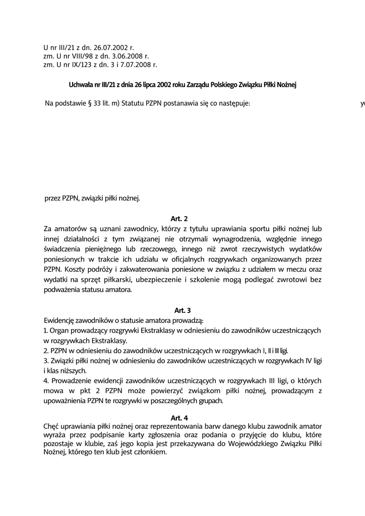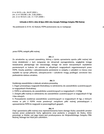 U nr III/21 z dn. 26.07.2002 r. zm. U nr VIII/98 z dn. 3.06.2008 r. zm. U nr IX/123 z dn. 3 i 7.07.2008 r. Uchwała nr III/21 z dnia 26 lipca 2002 roku Zarządu Polskiego Związku Piłki Nożnej Na podstawie § 33 lit. m) Statutu PZPN postanawia się co następuje: przez PZPN, związki piłki nożnej. Art. 2 Za amatorów są uznani zawodnicy, którzy z tytułu uprawiania sportu piłki nożnej lub innej działalności z tym związanej nie otrzymali wynagrodzenia, względnie innego świadczenia pieniężnego lub rzeczowego, innego niż zwrot rzeczywistych wydatków poniesionych w trakcie ich udziału w oficjalnych rozgrywkach organizowanych przez PZPN. Koszty podróży i zakwaterowania poniesione w związku z udziałem w meczu oraz wydatki na sprzęt piłkarski, ubezpieczenie i szkolenie mogą podlegać zwrotowi bez podważenia statusu amatora. Art. 3 Ewidencję zawodników o statusie amatora prowadzą: 1. Organ prowadzący rozgrywki Ekstraklasy w odniesieniu do zawodników uczestniczących w rozgrywkach Ekstraklasy. 2. PZPN w odniesieniu do zawodników uczestniczących w rozgrywkach I, II i III ligi. 3. Związki piłki nożnej w odniesieniu do zawodników uczestniczących w rozgrywkach IV ligi i klas niższych. 4. Prowadzenie ewidencji zawodników uczestniczących w rozgrywkach III ligi, o których mowa w pkt 2 PZPN może powierzyć związkom piłki nożnej, prowadzącym z upoważnienia PZPN te rozgrywki w poszczególnych grupach. Art. 4 Chęć uprawiania piłki nożnej oraz reprezentowania barw danego klubu zawodnik amator wyraża przez podpisanie karty zgłoszenia oraz podania o przyjęcie do klubu, które pozostaje w klubie, zaś jego kopia jest przekazywana do Wojewódzkiego Związku Piłki Nożnej, którego ten klub jest członkiem. yw Art. 5 Do każdego podania o przyjęcie do klubu zawodnik dołącza oświadczenie o treści stanowiącej załącznik nr 1. Postanowienie to dotyczy również zawodników już występujących w danym klubie. Art. 6 1. Zabroniony jest udział zawodnika o statusie amatora w zakładach bukmacherskich, jeżeli klub, który reprezentuje występuje w Ekstraklasie, I, II i III lidze oraz w rozgrywkach pucharowych na szczeblu centralnym. Naruszenie powyższego zakazu pociąga za sobą zastosowanie sankcji regulaminowych i dyscyplinarnych. 2. W przypadku dopuszczenia się przez zawodnika o statusie amatora, biorącego udział w rozgrywkach seniorskich, przekupstwa sportowego stwierdzonego prawomocnym wyrokiem sądu karnego lub prawomocną decyzją dyscyplinarną organu PZPN lub właściwego związku piłki nożnej zawodnik zobowiązany jest wpłacić na konto macierzystego ZPN kwotę 20.000 zł. 3. Zobowiązanie, o którym mowa w ust. 2, sporządzone wg wzoru stanowiącego załącznik nr 1 do niniejszej uchwały dołączane jest do podania, o którym mowa w art. 4 nin. uchwały. 4. Zobowiązania określone w ust. 2 i 3 są składane w klubie, w którym zawodnik występuje przed terminem rozpoczęcia rozgrywek na sezon 2008/2009. Art. 7 Zasady transferu zawodnika o statusie amatora reguluje Uchwała nr II/11 z dnia 19 maja 2002 roku Zarządu Polskiego Związku Piłki Nożnej (z późniejszymi zmianami). Art. 8 1. W stosunku do zawodnika o statusie amatora, który w trakcie sezonu piłkarskiego opuści samowolnie klub, w którym uprawia dobrowolnie sport piłki nożnej na zasadach, o których mowa w art. 5, zastosowana będzie automatycznie 12-miesięczna karencja. 2. W trakcie trwania karencji zawodnik nie może brać udziału w rozgrywkach mistrzowskich w kraju i za granicą. 3. Okresu odbywania kary dyskwalifikacji oraz niezbędnego czasu na leczenie kontuzji przez zawodnika o statusie amatora nie wlicza się do okresu 12 miesięcznej karencji. Art. 9 Klub odstępujący zawodnika amatora w trakcie trwania sezonu piłkarskiego w okresie przewidzianym na dokonywanie zmian przynależności klubowej może żądać od klubu, do którego zawodnik przechodzi, ekwiwalentu za wyszkolenie piłkarza. Art. 10 1. W przypadku, gdy zawodnik o statusie amatora, przechodzi po zakończeniu sezonu piłkarskiego do innego klubu, tenże klub powinien zapłacić poprzedniemu klubowi kwotę ekwiwalentu za wyszkolenie piłkarza, chyba, że właściwe przepisy stanowią inaczej. 2. Do ustalania zasad, o których mowa w art. 9 i art. 10, i ich aktualizacji upoważnia się Zarząd PZPN. Art. 11 Traci moc Uchwała nr III/19 z dnia 8 czerwca 2000 roku Zarządu Polskiego Związku Piłki Nożnej. Art. 12 Uchwała wchodzi w życie z dniem podjęcia. Prezes PZPN Michał Listkiewicz Załącznik do uchwały nr VIII/98 z dnia 3 czerwca 2008 roku Zarządu Polskiego Związku Piłki Nożnej w sprawie deklaracji etyki zawodników o statusie amatora ______________, dnia ___________ (miejscowość) ______________________ (imię i nazwisko) Oświadczenie Jako zawodnik o statusie amatora i członek wielkiej piłkarskiej społeczności zobowiązuję się do respektowania obowiązujących w piłce nożnej zasad i przestrzegania reguł fair play. Wszystkie swoje umiejętności, talent i siłę woli poświęcę osiągnięciu najlepszych wyników sportowych, szanując jednocześnie takie same dążenia przeciwników we współzawodnictwie sportowym. Moim celem zawsze będzie zwycięstwo, ale tylko odniesione w duchu szlachetnej i uczciwej rywalizacji sportowej. ______________________ (podpis zawodnika) ____________________________ (poświadczenie przyjęcia oświadczenia) Załącznik do uchwały nr III/21 z dnia 26 lipca 2002 roku z późn zm. dot. Zasad regulujących stosunki pomiędzy klubem sportowym a zawodnikiem o statusie amatora ____________, dnia ___________ (miejscowość) ____________________ (imię i nazwisko) ____________________ (nazwa klubu) Oświadczenie Jako zawodnik o statusie amatora i członek wielkiej piłkarskiej społeczności zobowiązuję się do respektowania obowiązujących w piłce nożnej zasad i przestrzegania reguł fair play. Wszystkie swoje umiejętności, talent i siłę woli