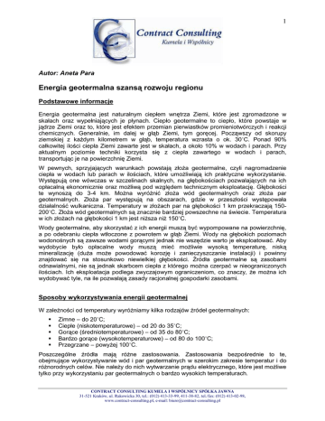 1 Autor: Aneta Para Energia geotermalna szansą rozwoju regionu Podstawowe informacje Energia geotermalna jest naturalnym ciepłem wnętrza Ziemi, które jest zgromadzone w skałach oraz wypełniających je płynach. Ciepło geotermalne to ciepło, które powstaje w jądrze Ziemi oraz to, które jest efektem przemian pierwiastków promieniotwórczych i reakcji chemicznych. Generalnie, im dalej w głąb Ziemi, tym goręcej. Począwszy od skorupy ziemskiej z kaŜdym kilometrem w głąb, temperatura wzrasta o ok. 30˚C. Ponad 90% całkowitej ilości ciepła Ziemi zawarte jest w skałach, a około 10% w wodach i parach. Przy aktualnym poziomie techniki korzysta się z ciepła zawartego w wodach i parach, transportując je na powierzchnię Ziemi. W pewnych, sprzyjających warunkach powstają złoŜa geotermalne, czyli nagromadzenie ciepła w wodach lub parach w ilościach, które umoŜliwiają ich praktyczne wykorzystanie. Występują one wówczas w szczelinach skalnych, na głębokościach pozwalających na ich opłacalną ekonomicznie oraz moŜliwą pod względem technicznym eksploatację. Głębokości te wynoszą do 3-4 km. MoŜna wyróŜnić złoŜa wód geotermalnych oraz złoŜa par geotermalnych. ZłoŜa par występują na obszarach, gdzie w przeszłości występowała działalność wulkaniczna. Temperatury w złoŜach par na głębokości 1 km przekraczają 150200˚C. ZłoŜa wód geotermalnych są znacznie bardziej powszechne na świecie. Temperatura w ich złoŜach na głębokości 1 km jest niŜsza niŜ 150˚C. Wody geotermalne, aby skorzystać z ich energii muszą być wypompowane na powierzchnię, a po odebraniu ciepła wtłoczone z powrotem w głąb Ziemi. Wody na głębokich poziomach wodonośnych są zawsze wodami gorącymi jednak nie wszędzie warto je eksploatować. Aby wydobycie było opłacalne wody muszą mieć moŜliwie wysoką temperaturę, niską mineralizację (duŜa moŜe powodować korozję i zanieczyszczanie instalacji) i powinny znajdować się na stosunkowo niewielkiej głębokości. Źródła geotermalne są zasobami odnawialnymi, nie są jednak skarbcem ciepła z którego moŜna czerpać w nieograniczonych ilościach. Ich eksploatacja podlega zwyczajowym ograniczeniom, co znaczy, Ŝe moŜna ich wydobywać tyle, na ile pozwalają zasady racjonalnej gospodarki zasobami. Sposoby wykorzystywania energii geotermalnej W zaleŜności od temperatury wyróŜniamy kilka rodzajów źródeł geotermalnych: Zimne – do 20˚C; Ciepłe (niskotemperaturowe) – od 20 do 35˚C; Gorące (średniotemperaturowe) – od 35 do 80˚C; Bardzo gorące (wysokotemperaturowe) – od 80 do 100˚C; Przegrzane – powyŜej 100˚C. Poszczególne źródła mają róŜne zastosowania. Zastosowania bezpośrednie to te, obejmujące wykorzystywanie wód i par geotermalnych w szerokim zakresie temperatur i do róŜnorodnych celów. Nie naleŜy do nich wytwarzanie prądu elektrycznego, które jest moŜliwe tylko przy wykorzystaniu par geotermalnych o bardzo wysokich temperaturach. CONTRACT CONSULTING KUMELA I WSPÓLNICY SPÓŁKA JAWNA 31-521 Kraków, ul. Rakowicka 30, tel.: (012) 413-33-99, 411-38-82, tel./fax: (012) 413-02-98, www.contract-consulting.pl, e-mail: [email protected] 2 W przyrodzie obficie występują wody o najniŜszych temperaturach, które wykorzystywane są w rolnictwie: do nawadniania pól, do podgrzewania gleby, do jej wyjaławiania a takŜe w uprawach szklarniowych. Wody zimne i niskotemperaturowe wykorzystywane są teŜ w duŜym zakresie do hodowli ryb (pstrągi - 15˚C, dorsze i krewetki 32˚C). Gorące wody geotermalne wykorzystywane są w przemyśle lekkim, gdzie słuŜą do prania bawełny i barwienia tkanin (temperatura wody 48-79˚C). Wody bardzo gorące stosuje się do ogrzewania pomieszczeń. Energię elektryczną stosuje się z wód przegrzanych o temperaturze powyŜej 150˚C. Tabela 1. Przykłady zastosowań wód geotermalnych Temperatura w stopniach C Przykłady zastosowań 20 hodowla ryb 30 zapewnienie ciepłej wody, niezbędnej do całorocznej pracy kopalni w rejonach o chłodnym klimacie 40 podgrzewanie gleby, pływalnie 50 hodowla grzybów, balneologia 60 hodowla zwierząt, uprawy szklarniowe 70 chłodzenie 80 ogrzewanie budynków i szklarni 90 intensywne odladzanie 100 suszenie wodorostów, trawy, warzyw itp., pranie i suszenie wełny 110 suszenie i utwardzanie płyt cementowych 120 koncentracja roztworu soli 130 odparowywanie w procesie rafinacji cukru 140 konserwacja produktów spoŜywczych 150 wytwarzanie tlenku glinu w procesie Bayera, będącym pierwszym etapem produkcji aluminium 160 suszenie drewna 170 produkcja cięŜkiej wody 180 odparowywanie roztworów o duŜym zagęszczeniu Źródło: www.biomasa.org/edukacja Pompy ciepła Pompy ciepła to urządzenia umoŜliwiające pozyskiwanie i uŜytkowanie ciepła niskotemperaturowego pochodzącego z powietrza, wody czy gleby a takŜe ciepła odpadowego, powstającego w procesach produkcyjnych. UmoŜliwiają one podniesienie, za pomocą energii mechanicznej ciepła niskotemperaturowego do poziomu wyŜszych temperatur uŜytecznych dla celów grzewczych. SłuŜą one do ogrzewania i klimatyzowania budynków a takŜe do przygotowywania ciepłej wody uŜytkowej. Pompy ciepła mogą same CONTRACT CONSULTING KUMELA I WSPÓLNICY SPÓŁKA JAWNA 31-521 Kraków, ul. Rakowicka 30, tel.: (012) 413-33-99, 411-38-82, tel./fax: (012) 413-02-98, www.contract-consulting.pl, e-mail: [email protected] 3 zasilać ogrzewanie budynków czy teŜ podgrzewanie ciepłej wody. Mogą teŜ pracować w kombinacji z innymi urządzeniami grzewczymi. Pompy nie generują ciepła tylko je przekazują i przetwarzają. Ich funkcjonowanie zapewnia dostawa pewnej ilości energii mechanicznej, jednak aŜ 75% energii potrzebnej do celów grzewczych jest pobierana bezpośrednio z otoczenia. Dlatego teŜ stosując pompy ciepła oszczędza się więcej energii niŜ wykorzystując jakikolwiek inny system ogrzewania. We wnętrzu Ziemi pod linią zamarzan