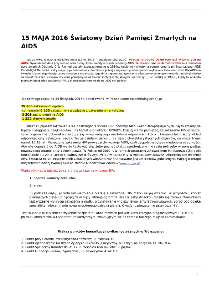 15 MAJA 2016 Światowy Dzień Pamięci Zmarłych na AIDS Jak co roku, w trzecią niedzielę maja (15.05.2016r.) będziemy obchodzić Międzynarodowy Dzień Pamięci o Zmarłych na AIDS. Symboliczna data przypomina nam osoby, które zmarły w wyniku choroby AIDS. To również czas solidarności z bliskimi i rodzinami osób zmarłych.Obchody Dnia Pamięci zostały zapoczątkowane w 1984r.z inicjatywy międzynarodowej organizacji International AIDS Candlelight Memorial. Kultywacja tego dnia nabrała charakteru jednej z największych kampanii zwiększania świadomo ści o HIV/AIDS na świecie. Liczne organizacje i stowarzyszenia organizują tego dnia happeningi, spotkania edukacyjne celem promowania rzetelnej wiedzy na temat zakażeń wirusem HIV oraz przełamywania barier społecznych, którymi naznaczył „HIV” Polskę w 1985r., kiedy to wykryto pierwszy przypadek zakażenia HIV, a pierwsze zachorowanie na AIDS rok później. Od tamtego czasu do 30 listopada 2015r. odnotowano w Polsce (dane epidemiologiczne)[1]: 19 805 zakażonych ogółem co najmniej 6 135 zakażonych w związku z używaniem narkotyków 3 309 zachorowań na AIDS 1 322 chorych zmarło Wraz z upływem lat zmienia się postrzeganie wirusa HIV, choroby AIDS i osób seropozytywnych. Są to zmiany na lepsze i osiągnięte dzięki edukacji na temat profilaktyki HIV/AIDS. Dzisiaj warto pamiętać, że zakażenie HIV oznacza, że w organizmie człowieka znajduje się wirus nabytego niedoboru odporności, który z biegiem lat niszczy układ odpornościowy zakażonej osoby. Wirus działa w ukryciu nie dając charakterystycznych objawów, co może trwać nawet 10-12 lat. Nieleczone zakażenie HIV prowadzi do rozwoju AIDS, czyli zespołu nabytego niedoboru odporności. Aby nie dopuścić do AIDS warto testować się, żeby poznać status serelogiczny i w razie potrzeby w porę podjąć nowoczesną terapię antyretrowirusową. W Polsce od 2001 r. w ramach programu zdrowotnego Ministerstwa Zdrowia funkcjonuje Leczenie antyretrowirusowe osób żyjacych z wirusem HIV w Polsce, które prowadzi zintegrowane leczenie ARV. Oznacza to, że leczenie osób zakażonych wirusem HIV finansowane jest ze środków publicznych. Więcej o terapii antyretrowirusowej zwanej ARV na stronie Ministerstwa Zdrowia (www.mz.gov.pl). Warto również wiedzieć, że są 3 drogi zakażenia wirusem HIV: 1) poprzez kontakty seksualne, 2) krew, 3) podczas ciąży, porodu lub karmienia piersią z zakażonej HIV matki na jej dziecko. W przypadku kobiet planujących ciążę lub będących w ciąży istnieje ogromna szansa żeby dziecko urodziło się zdrowe. Warunkiem jest wczesne wykrycie zakażenia u matki, przyjmowanie w ciąży leków antyretrowirusowych, poród pod opieką specjalisty i niekarmienie nowonarodzonego dziecka piersią. Owady i zwierzęta nie przenoszą HIV. Test w kierunku HIV można wykonać bezpłatnie i anonimowo w punkcie konsultacyjno-diagnostycznym (PKD) lub płatnie i anonimowo w Laboratorium Medycznym, znajdującym się na terenie naszego miejsca zamieszkania. Wykaz punktów konsultacyjno-diagnostycznych w Warszawie: 1. 2. 3. 4. Punkt przy Poradni Profilaktyczno-Leczniczej ul. Wolska 37. Punkt Zjednoczenie Na Rzecz Żyjących HIV/AIDS „Pozytywny w Tęczy”, ul. Targowa 44 lok.1/1A. Punkt Społeczny Komitet ds. AIDS, ul. Wspólna 65A lok. ofic. III piętro. Punkt Fundacja Edukacji Społecznej, ul. Sewerynów 4 lok.100. 1 Zapraszamy do lektury książki załączonej poniżej: „Zakażenie, Rozpoznanie i co dalej…?” [1] Opracowano na podstawie danych NIZP-PZH. Więcej na ten temat www.pzh.gov.pl 2