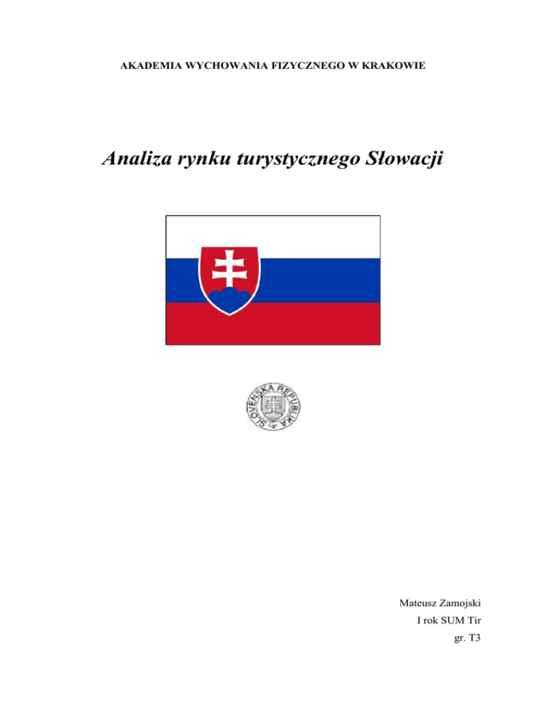 AKADEMIA WYCHOWANIA FIZYCZNEGO W KRAKOWIE Analiza rynku turystycznego Słowacji Mateusz Zamojski I rok SUM Tir gr. T3 1. Wstęp 2 Ryc. 1 MAPA POLITYCZNA EUROPY Źródło: http://www.wsipnet.pl 1. INFORMACJE OGÓLNE Republika słowacka połoŜona jest w Europie Środkowej. Cechą charakterystyczną są stosunkowo wielkie róŜnice wysokości nad poziomem morza. Słowacja środkowa i północna jest raczej górzysta, ciągnie się tam łuk karpacki. Południe i wschód państwa połoŜony jest na nizinach, które stanowią znaczny obszar rolniczy Słowacji. Główną rzeką jest Dunaj łączący stolicę - Bratysławę z dwiema metropoliami Europy – z Wiedniem i Budapesztem.1 1 www.sacr.sk 1. Wstęp 3 Powierzchnia: 49 035 km2 Ludność: 5 379 450 (dane z roku 2001) Zaludnienie: 109,9 osób na 1 km2 Język urzędowy: słowacki Stolica: Bratysława (ludność: 452 288) Ustrój polityczny: republika Typ rządu: demokracja parlamentarna Powstanie państwa: 1 stycznia 1993 Członek UE od: 1 maja 2004 Prezydent: Ivan Gašparovič Waluta: Korona słowacka (Sk) Członkostwo w organizacjach międzynarodowych: OSN, OECD, WTO, V4, NATO, EU Narodowości:Słowacka (85,6%),Węgierska (10,8%), Romów (1,8%), Czeska (1,2%), Rosińska (0,3%), Ukrainska (0,3%), Niemiecka (0,1%), Polska (0,1%), inne (0,2%) Religia:rzymskokatolicka (60,3%), grekokatolicka (3,4%), protestancka (6,2%), ortodoksyjna (0,6%), bez religi (9,7%), brak danych (18,2%)2 Podział administracyjny: Słowacja jest państwem unitarnym. Dzieli się na 8 krajów i 79 powiatów (okresów). Kraje dzielą się na powiaty (słow. okres), a te na gminy (słow. obec) miejskie lub wiejskie. Jednostki administracyjne szczebla krajowego i gminnego są równieŜ jednostkami samorządu terytorialnego.3 2 3 www.sacr.sk www.wikipedia.pl 1. Wstęp 4 Ryc. 2 GRAFICZNE PRZEDSTAWIENIE PODZIAŁU ADMINISTRACYJNEGO SŁOWACJI Źródło: www.wikipedia.pl Tab.I PODZIAŁ ADMINISTRACYJNY SŁOWACJI # nazwa polska nazwa słowacka stolica powierzchnia ludność w tys. (w tys. km²) (2001) 1 Kraj bratysławski Bratislavský kraj Bratysława 2,03 599 2 Kraj trnawski Trnavský kraj Trnawa 4,15 551 3 Kraj trenczyński Trenčiansky kraj Trenczyn 4,5 606 4 Kraj nitrzański Nitriansky kraj Nitra 6,34 713 5 Kraj Ŝyliński Žilinský kraj śylina 6,79 692 Banskobystrický kraj Bańska Bystrzyca 9,46 662 6 Kraj bańskobystrzycki 7 Kraj preszowski Prešovský kraj Preszów 8,99 790 8 Kraj koszycki Košický kraj Koszyce 6,75 766 Źródło: www.wikipedia.pl 1.1 KLIMAT Republika Słowacka połoŜona jest w klimacie umiarkowanym z szczególnymi zmianami pór roku. Najchłodniejszym miesiącem jest styczeń, najcieplejszymi są lipiec i sierpień. W połoŜonych najwyŜej partiach gór śnieg utrzymuje się przeciętnie 130 dni w roku. 1. Wstęp 5 Klimat Słowacji jest górski, piętrowy, na obszarach połoŜonych niŜej – umiarkowany ciepły (przeciętnie 6-10°C, od 16-20°C w lipcu do 0 – –6°C w styczniu). Ilość opadów jest dostateczna (400-1200 mm rocznie), ale na nizinach zdarzają się susze i stosuje się sztuczne nawadnianie. 1.2 DANE GEOGRAFICZNE Słowacja leŜy w Europie Środkowej, po południowej stronie wododziałowego łuku Karpat i – w niewielkiej części – na nizinach naddunajskich. Jest krajem górskim: 61% jej powierzchni zajmują liczne pasma i łańcuchy górskie Karpat Zachodnich (Tatry, Białe Karpaty, Małe Karpaty, NiŜne Tatry, Rudawy Słowackie, Wielka Fatra, Mała Fatra) i Karpat Wschodnich (Bieszczady, Wyhorlat). NajwyŜszy punkt Słowacji stanowi tatrzański szczyt górski Gerlach (2655 m n.p.m.). Góry obfitują w rozległe kotliny śródgórskie, z których największe to Kotlina Koszycka i Kotlina Liptowska. Tereny nizinne zajmują stosunkowo niewielką część powierzchni kraju. Stanowią je trzy niziny: najmniejsza Nizina Zahorska na południowo-zachodnim skraju państwa, największa Nizina Naddunajska nad Dunajem na południu i na południowym wschodzie Nizina Wschodniosłowacka. Lasy, głównie iglaste i mieszane, zajmują około 40% powierzchni kraju, z największymi kompleksami leśnymi w środkowej Słowacji. Na Nizinie Naddunajskiej i na Nizinie Wschodniosłowackiej pierwotnie dominował step i lasostep, ale tereny te juŜ dawno zostały zajęte pod intensywne rolnictwo. Słowacja ma gęstą sieć rzeczną, w 96% naleŜącą do zlewni Dunaju, a tym samym do zlewiska Morza Czarnego (pozostałe 4% stanowi zlewnia Wisły w zlewisku Morza Bałtyckiego). Największe rzeki Słowacji to (poza Dunajem i Cisą) Wag (403 km), Hron (289 km), Ipola (232,5 km), Bodrog (88 km; z rozległym systemem rzecznym), Slaná (229,4 km) i Hornád (286 km). Jeziora są niewielkie i leŜą głównie w wysokich górach, natomiast liczne i duŜe są sztuczne zbiorniki wodne. 4 1.3 GOSPODARKA Główne rośliny rolnicze: pszenica, Ŝyto, kukurydza, ziemniaki, burak cukrowy Hodowla: bydło rogate, świnie, drób, owce, kozy 4 www.wikipedia.pl 1. Wstęp 6 Główne gałęzie przemysłu: przemysł samochodowy, wydobywanie węgla brunatnego, przemysł chemiczny, przetworzenie rudy Ŝelaza, nawozy, masy plastyczne Surowce naturalne: ruda Ŝelazna, rtęć, miedź, ołów, cynk Słowacja jest rozwiniętym krajem rolniczo-przemysłowym. Produkt krajowy brutto wynosi 17700 dolarów amerykańskich na 1 mieszkańca (2006). Następuje powolna kontynuacja reform zapoczątkowanych 1990 w ramach federacji Czech i Słowacji. Podział na Czechy i Słowację pogłębił trudności gospodarcze Słowacji, związane m.in. z niekorzystną dla szybkich przemian rynkowych strukturą przemysłu kraju. Na obszarze Słowacji zlokalizowano w ramach podziału pracy w federacji liczne zakłady przemysłu przetwórczego wytwarzające półprodukty (tworzywa sztuczne, Ŝelazo, stal, miedź) oraz fabryki zbrojeniowe (produkcja broni stanowiła 6,3% ogólnej produkcji przemysłowej republiki-1999). Wprowadzenie zasad gospodarki rynkowej, rozpad RWPG i utrata tradycyjnych rynków zbytu spowod