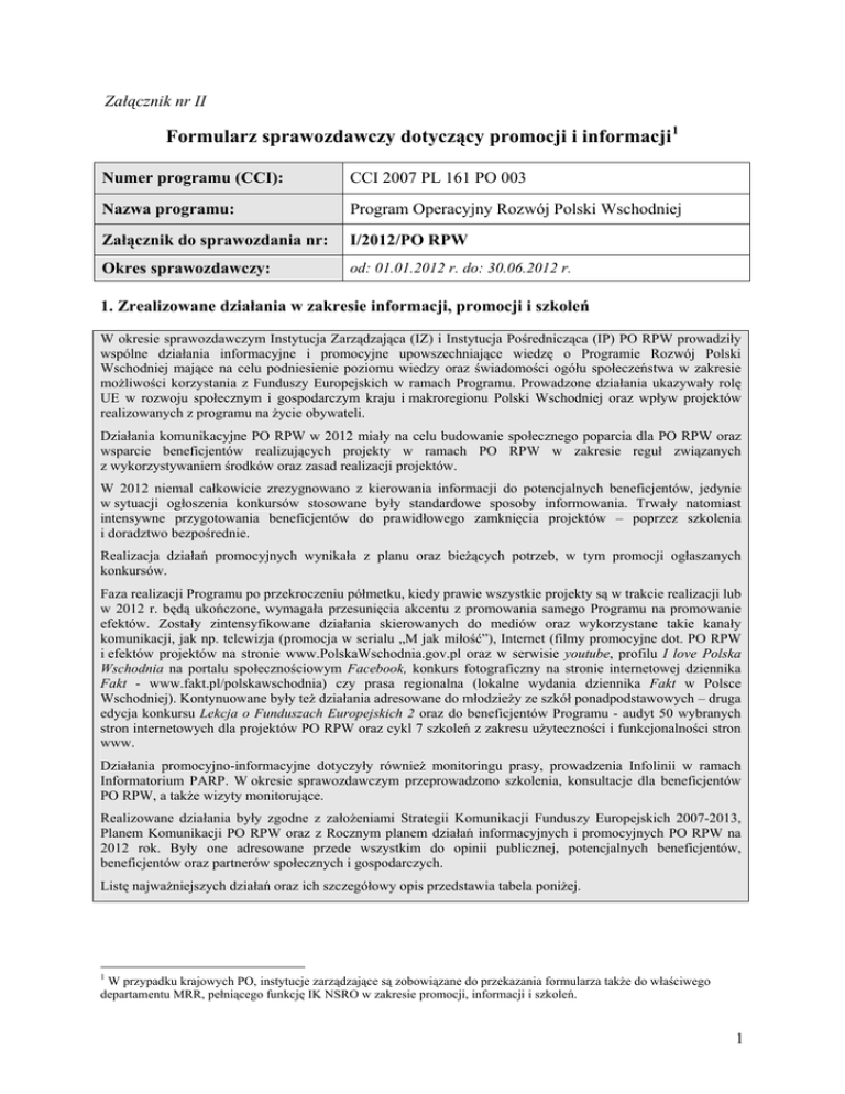 Załącznik nr II Formularz sprawozdawczy dotyczący promocji i informacji 1 Numer programu (CCI): CCI 2007 PL 161 PO 003 Nazwa programu: Program Operacyjny Rozwój Polski Wschodniej Załącznik do sprawozdania nr: I/2012/PO RPW Okres sprawozdawczy: od: 01.01.2012 r. do: 30.06.2012 r. 1. Zrealizowane działania w zakresie informacji, promocji i szkoleń W okresie sprawozdawczym Instytucja Zarządzająca (IZ) i Instytucja Pośrednicząca (IP) PO RPW prowadziły wspólne działania informacyjne i promocyjne upowszechniające wiedzę o Programie Rozwój Polski Wschodniej mające na celu podniesienie poziomu wiedzy oraz świadomości ogółu społeczeństwa w zakresie możliwości korzystania z Funduszy Europejskich w ramach Programu. Prowadzone działania ukazywały rolę UE w rozwoju społecznym i gospodarczym kraju i makroregionu Polski Wschodniej oraz wpływ projektów realizowanych z programu na życie obywateli. Działania komunikacyjne PO RPW w 2012 miały na celu budowanie społecznego poparcia dla PO RPW oraz wsparcie beneficjentów realizujących projekty w ramach PO RPW w zakresie reguł związanych z wykorzystywaniem środków oraz zasad realizacji projektów. W 2012 niemal całkowicie zrezygnowano z kierowania informacji do potencjalnych beneficjentów, jedynie w sytuacji ogłoszenia konkursów stosowane były standardowe sposoby informowania. Trwały natomiast intensywne przygotowania beneficjentów do prawidłowego zamknięcia projektów – poprzez szkolenia i doradztwo bezpośrednie. Realizacja działań promocyjnych wynikała z planu oraz bieżących potrzeb, w tym promocji ogłaszanych konkursów. Faza realizacji Programu po przekroczeniu półmetku, kiedy prawie wszystkie projekty są w trakcie realizacji lub w 2012 r. będą ukończone, wymagała przesunięcia akcentu z promowania samego Programu na promowanie efektów. Zostały zintensyfikowane działania skierowanych do mediów oraz wykorzystane takie kanały komunikacji, jak np. telewizja (promocja w serialu „M jak miłość”), Internet (filmy promocyjne dot. PO RPW i efektów projektów na stronie www.PolskaWschodnia.gov.pl oraz w serwisie youtube, profilu I love Polska Wschodnia na portalu społecznościowym Facebook, konkurs fotograficzny na stronie internetowej dziennika Fakt - www.fakt.pl/polskawschodnia) czy prasa regionalna (lokalne wydania dziennika Fakt w Polsce Wschodniej). Kontynuowane były też działania adresowane do młodzieży ze szkół ponadpodstawowych – druga edycja konkursu Lekcja o Funduszach Europejskich 2 oraz do beneficjentów Programu - audyt 50 wybranych stron internetowych dla projektów PO RPW oraz cykl 7 szkoleń z zakresu użyteczności i funkcjonalności stron www. Działania promocyjno-informacyjne dotyczyły również monitoringu prasy, prowadzenia Infolinii w ramach Informatorium PARP. W okresie sprawozdawczym przeprowadzono szkolenia, konsultacje dla beneficjentów PO RPW, a także wizyty monitorujące. Realizowane działania były zgodne z założeniami Strategii Komunikacji Funduszy Europejskich 2007-2013, Planem Komunikacji PO RPW oraz z Rocznym planem działań informacyjnych i promocyjnych PO RPW na 2012 rok. Były one adresowane przede wszystkim do opinii publicznej, potencjalnych beneficjentów, beneficjentów oraz partnerów społecznych i gospodarczych. Listę najważniejszych działań oraz ich szczegółowy opis przedstawia tabela poniżej. 1 W przypadku krajowych PO, instytucje zarządzające są zobowiązane do przekazania formularza także do właściwego departamentu MRR, pełniącego funkcję IK NSRO w zakresie promocji, informacji i szkoleń. 1 Tabela 1. Zrealizowane działania Lp. Nazwa działania Opis działania Informacja 1 Działanie 1 Centralny Punkt Informacyjny w Warszawie W ramach działalności Infolinii PARP prowadzonej w ramach Informatorium w okresie od 1 stycznia do 30 czerwca 2012 r. odnotowano konsultacje, zapytania telefoniczne oraz zapytania e-mailowe dot. programu PO RPW. Największym zainteresowaniem cieszyło się działanie I.3 Wspieranie innowacji. Dynamika liczby konsultacji oraz ich zakres i tematyka były skorelowane z harmonogramem ogłaszanych konkursów w ramach programu. Ponadto beneficjenci kontaktowali się w celu wyjaśnienia szczegółowych zagadnień dotyczących przeprowadzenia konkursu, jak też wytycznych w zakresie kwalifikowania wydatków w ramach PO RPW 2007- 2013. 2 Działanie 2 Punkty Konsultacyjne w całej Polsce W okresie sprawozdawczym, w ramach zorganizowanej przez PARP sieci Krajowego Systemu Usług dla MSP, funkcjonowały na terenie całej Polski Punkty Konsultacyjne. Liczba PK w stosunku do roku ubiegłego (2011) znacząco zmniejszyła się w wyniku nowych zasad i ogłoszonego naboru na ich prowadzenie. Punkty Konsultacyjne, prowadzone przez podmioty zarejestrowane w KSU dla MSP świadczyły bezpłatne usługi informacyjne dla przedsiębiorców oraz osób zamierzających rozpocząć działalność gospodarczą z zakresu szeroko rozumianego rozwoju przedsiębiorczości oraz dostępnych form wsparcia dla przedsiębiorców, w tym w zakresie PO RPW. W I kwartale 2012 r. w ramach PO RPW z podziałem na województwa oraz formę świadczonych usług odnotowano 17 972 konsultacji, przy czym z uwagi na brak w chwili obecnej narzędzia umożliwiającego określenie szczegółowych danych dotyczących konsultacji w zakresie konkretnych programów operacyjnych, nie jest możliwe pozyskanie wskaźnika dotyczącego zrealizowanych konsultacji dla PO RPW. 3 Działanie 3 Główne Punkty Informacyjne oraz Lokalne Punkty Informacyjne działające w ramach sieci Punktów Informacyjnych Funduszy Europejskich. W okresie sprawozdawczym IZ PO RPW współpracowała z głównym Punktem Informacyjnym oraz Lokalnymi Punktami Informacyjnymi m.in. dostarczając materiały informacyjno-promocyjne o PO RPW. 4 Działanie 4 Kampania informacyjna dot. konkursów ogłaszanych w 2012 r. w ramach PO RPW Emisja ogłoszeń jest każdorazowo ściśle 