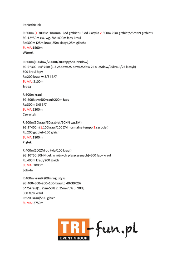 Poniedziałek R:600m (1.300ZM-1norma -2od grzbietu-3 od klasyka 2.300m 25m grzbiet/25mNN grzbiet) ZG:12*50m ćw. wg. ZM+400m łapy kraul RŁ:300m (25m kraul,25m klasyk,25m gilach) SUMA:1500m Wtorek R:800m(100dow/200RR/300łapy/200NNdow) ZG:2*300 ->4*75m (1i3 25dow/25 dow/25dow 2 i 4 25dow/25kraul/25 klasyk) 500 kraul łapy RŁ:200 kraul w 3/5 i 3/7 SUMA: 2100m Środa R:600m kraul ZG:600łapy/600kraul/200m łapy RŁ:300m 3/5 3/7 SUMA:2300m Czwartek R:600m(50kraul/50grzbiet/50NN wg.ZM) ZG:2*400m(1.100kraul/100 ZM normalne tempo 2.szybciej) RŁ:200 grzbiet+200 glaich SUMA:1800m Piątek R:400m(100ZM od tyłu/100 kraul) ZG:10*50(50NN del. w różnych płaszczyznach)+500 łapy kraul RŁ:400m kraul/200 glaich SUMA: 2000m Sobota R:400m kraul+200m wg. stylu ZG:400+300+200+100-kraul(p 40/30/20) 6*75kraul(1. 25m-50% 2. 25m-75% 3. 90%) 300 łapy kraul RŁ:200kraul/200 glaich SUMA: 2750m LEGENDA: Pn (1.300ZM-1norma -2od grzbietu-3 od klasyka) tzn. 300m wg. Stylu zmiennego . Pierwsze 100m w normalnej kolejności , drugie 100m zaczynamy od grzbietu itd. RR- same ręce, NN- same nogi Łapy tzn. wiosełka do pływania ;) Wt RŁ:200 kraul w 3/5 i 3/7 oddech co 3 i 5 ruch itd. Śr Czw Tutaj wszystko jasne(jeśli jest inaczej czekam na komentarze ) 10*50(50NN del. w różnych płaszczyznach) nogi do delfina w różnych płaszczyznach c zyli pierwsze 50 m nogi do delfina z dużą deską w rękach, drugie na plecach nogi do delfina, trzecie na boku czwarte na drugim boku 400+300+200+100-kraul(p 40/30/20) przerwy 40 sekund, 30 s itd. 6*75kraul(1. 25m-50% 2. 25m-75% 3. 90%) kraul na 50% możliwości itd. Pt Sb