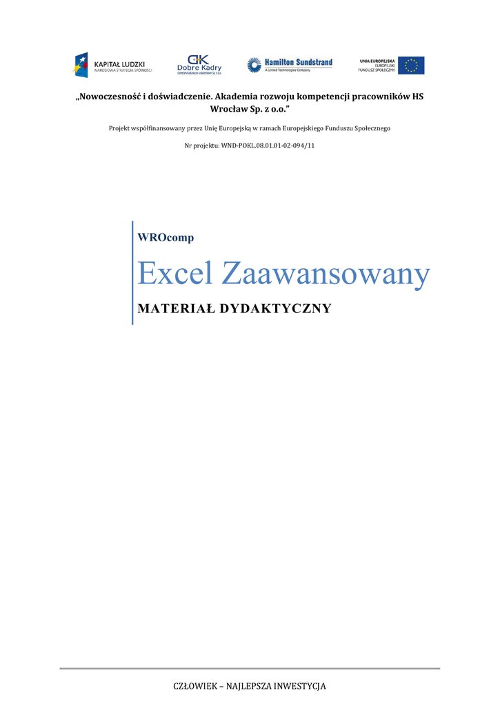 „Nowoczesność i doświadczenie. Akademia rozwoju kompetencji pracowników HS Wrocław Sp. z o.o.” Projekt współfinansowany przez Unię Europejską w ramach Europejskiego Funduszu Społecznego Nr projektu: WND-POKL.08.01.01-02-094/11 WROcomp Excel Zaawansowany MATERIAŁ DYDAKTYCZNY CZŁOWIEK – NAJLEPSZA INWESTYCJA „Nowoczesność i doświadczenie. Akademia rozwoju kompetencji pracowników HS Wrocław Sp. z o.o.” Projekt współfinansowany przez Unię Europejską w ramach Europejskiego Funduszu Społecznego Nr projektu: WND-POKL.08.01.01-02-094/11 Spis treści: II. ARKUSZE KALKULACYJNE, POZIOM ZAAWANSOWANY ................................................................................ 4 1. PRACA Z ARKUSZEM ..................................................................................................................................... 4 1.1.TWORZENIE NOWEGO SKOROSZYTU WEDŁUG DOMYŚLNEGO WZORCA (SZABLONU) ......................................................... 4 1.2. ZAPISYWANIE SKOROSZYTU JAKO PLIKU TYPU: SZABLON, PLIK TEKSTOWY, Z OKREŚLONYM ROZSZERZENIEM, WERSJĄ .............. 5 1.3 USTAWIANIE PODSTAWOWYCH OPCJI/PREFERENCJI W APLIKACJI .................................................................................. 6 1.4. WYŚWIETLANIE, UKRYWANIE WSTĄŻKI .................................................................................................................. 7 2. KOMÓRKI ..................................................................................................................................................... 8 2.1 WPROWADZANIE, ZAZNACZANIE ........................................................................................................................... 8 2.2. WPROWADZENIE LICZBY, DATY, TEKSTU DO KOMÓRKI............................................................................................... 8 2.3. ZAZNACZANIE KOMÓRKI, BLOKU SĄSIEDNICH KOMÓREK, BLOKU DOWOLNYCH KOMÓREK, CAŁEGO ARKUSZA ........................ 9 2.4. SORTOWANIE BLOKU KOMÓREK WEDŁUG JEDNEGO KRYTERIUM, W PORZĄDKU ROSNĄCYM LUB MALEJĄCYM DLA DANYCH LICZBOWYCH LUB TEKSTOWYCH ................................................................................................................................ 10 2.5. AUTOMATYCZNE WYPEŁNIANIE KOMÓREK DANYMI NA PODSTAWIE ZAWARTOŚCI SĄSIEDNICH KOMÓREK ........................... 11 3. ZARZĄDZANIE ARKUSZAMI ......................................................................................................................... 12 3.1. WSTAWIANIE, USUWANIE WIERSZY I KOLUMN....................................................................................................... 12 3.2. ZMIANA SZEROKOŚCI KOLUMN, WYSOKOŚCI WIERSZY O OKREŚLONĄ WIELKOŚĆ LUB O OPTYMALNEJ SZEROKOŚCI I WYSOKOŚCI13 3.3. BLOKOWANIE, ODBLOKOWYWANIE TYTUŁÓW WIERSZY I/LUB KOLUMN ...................................................................... 14 3.4. ZAMIANA POMIĘDZY ARKUSZAMI........................................................................................................................ 15 4. REGUŁY I FUNKCJE ...................................................................................................................................... 16 4.1. STOSOWANIE DOBRYCH PRAKTYK W TWORZENIU REGUŁ: KIEROWANIE SIĘ ODWOŁANIAMI DO KOMÓREK W MIEJSCE WPISYWANIA LICZB DO REGUŁ................................................................................................................................... 16 4.2. TWORZENIE REGUŁ PRZY UŻYCIU ODWOŁAŃ DO KOMÓREK I OPERATORÓW ARYTMETYCZNYCH (DODAWANIA, ODEJMOWANIA, MNOŻENIA, DZIELENIA) ........................................................................................................................................... 17 4.3. ROZPOZNAWANIE I WŁAŚCIWA INTERPRETACJA PODSTAWOWYCH BŁĘDÓW ZWIĄZANYCH Z UŻYCIEM REGUŁ: #NAME?, #DIV/0, #REF! .................................................................................................................................................... 18 4.4. ZNAJOMOŚĆ ADRESOWANIA WZGLĘDNEGO I BEZWZGLĘDNEGO (ABSOLUTNEGO) PRZY TWORZENIU REGUŁ ........................ 19 5. FUNKCJE ..................................................................................................................................................... 20 5.1. UŻYWANIE FUNKCJI SUMOWANIA, OBLICZANIA ŚREDNIEJ, WYZNACZANIA MINIMUM, MAKSIMUM, ZLICZANIA, LICZENIA NIEPUSTYCH, ZAOKRĄGLANIA.................................................................................................................................... 20 5.2. UŻYWANIE FUNKCJI LOGICZNEJ IF (JEŻELI) WYBIERAJĄCEJ JEDNĄ Z DWÓCH MOŻLIWYCH WARTOŚCI, Z OPERATOREM PORÓWNAWCZYM =, >, < ....................................................................................................................................... 23 5.3. FORMATOWANIE KOMÓREK ZAWIERAJĄCYCH LICZBY: WYŚWIETLANIE OKREŚLONEJ LICZBY MIEJSC DZIESIĘTNYCH, WPROWADZENIE LUB POMINIĘCIE SEPARATORA GRUP TYSIĘCY......................................................................................... 24 5.4. FORMATOWANIE KOMÓREK ZAWIERAJĄCYCH DATY: KOLEJNOŚĆ I SPOSÓB WYŚWIETLANIA DNI, MIESIĘCY I LAT, FORMATOWANIE KOMÓREK ZAWIERAJĄCYCH LICZBY W CELU WYŚWIETLENIA SYMBOLU WALUTY.................................................................... 25 5.5. FORMATOWANIE KOMÓREK ZAWIERAJĄCYCH LICZBĘ W CELU WYŚWIETLENIA POSTACI PROCENTOWEJ .............................. 26 5.6. ZAWIJANIE TEKSTU W KOMÓRCE, BLOKU KOMÓREK................................................................................................ 27 6. TWORZENIE WYKRESÓW ............................................................................................................................ 27 6.1. TWORZENIE WYKRESÓW RÓŻNYCH TYPÓW NA PODSTAWIE DANYCH ZAWARTYCH W ARKUSZU: WYKRES KOLUMNOWY, SŁUPKOWY, LINIOWY, KOŁOWY .............................