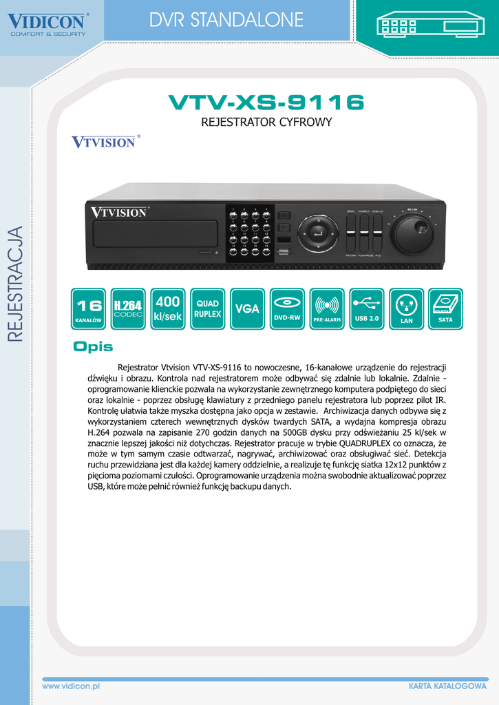 DVR STANDALONE VTV-XS-9116 REJESTRACJA REJESTRATOR CYFROWY H.264 400 16 CODEC KANA£ÓW kl/sek QUAD RUPLEX VGA DVD-RW PRE-ALARM USB 2.0 LAN SATA Opis Rejestrator Vtvision VTV-XS-9116 to nowoczesne, 16-kana³owe urz¹dzenie do rejestracji dŸwiêku i obrazu. Kontrola nad rejestratorem mo¿e odbywaæ siê zdalnie lub lokalnie. Zdalnie oprogramowanie klienckie pozwala na wykorzystanie zewnêtrznego komputera podpiêtego do sieci oraz lokalnie - poprzez obs³ugê klawiatury z przedniego panelu rejestratora lub poprzez pilot IR. Kontrolê u³atwia tak¿e myszka dostêpna jako opcja w zestawie. Archiwizacja danych odbywa siê z wykorzystaniem czterech wewnêtrznych dysków twardych SATA, a wydajna kompresja obrazu H.264 pozwala na zapisanie 270 godzin danych na 500GB dysku przy odœwie¿aniu 25 kl/sek w znacznie lepszej jakoœci ni¿ dotychczas. Rejestrator pracuje w trybie QUADRUPLEX co oznacza, ¿e mo¿e w tym samym czasie odtwarzaæ, nagrywaæ, archiwizowaæ oraz obs³ugiwaæ sieæ. Detekcja ruchu przewidziana jest dla ka¿dej kamery oddzielnie, a realizuje tê funkcjê siatka 12x12 punktów z piêcioma poziomami czu³oœci. Oprogramowanie urz¹dzenia mo¿na swobodnie aktualizowaæ poprzez USB, które mo¿e pe³niæ równie¿ funkcjê backupu danych. www.vidicon.pl KARTA KATALOGOWA DVR STANDALONE Dane techniczne Wejœcia 16 kana³ów System operacyjny Wbudowany Linux Quadruplex Równoczesne Nagrywanie / Odtwarzanie / Sieæ / Archiwizowanie Kompresja H.264 Wielkoœæ pliku 720x576 6~10KB na klatke / 720x288 3~5KB na klatke / 352x288 1.5~2.5KB na klatke Prêdkoœæ nagrywania 720x576 100 kl/sek / 720x288 200 kl/sek / 352x288 400 kl/sek Prêdkoœæ wyœwietlania 400 kl/sek @ 720x576 Tryby wyœwietlania 1,4,8,16,PIP Wyjœcie wideo 1x BNC, 1x S-Video, 1x Spot, 1x VGA (640x480, 800x600, 1024x768, 1280x1024) Wejœcia alarmowe 16 Wyjœcia alarmowe 4 Wejœcia audio 4 Wyjœcia audio 1 Wejœcia przelotowe 16 Interfejs PTZ RS-485 Kontrola systemu Myszka, klawisze funkcyjne na panelu przednim, pilot IR, dodatkowy kontroler Zasilanie DC 12V 7A, 50~60Hz Wymiary i waga 360x355x65mm, 5kg Temperatura pracy 5 ~ 40OC Certyfikaty CE, FCC, MIC, WEEE, RoHS REJESTRACJA G³ówne Funkcje Odtwarzanie Prêdkoœæ x1/x2/x4/x8/x16/x32, rozdzielczoœæ rzeczywista lub pe³noekranowa Wyszukiwanie Data / Czas / Pierwszy / Ostatni / Zapis systemu / Zapis wydarzenia Synchronizacja czasu Automatyczna, typu serwer-serwer lub klient-serwer Uprgade Firmware przez DVD/CD/FTP/USB Rozdzielczoœæ wyœwietlacza 640x480, 800x600, 1024x768, 1280x1024 Iloœæ u¿ytkowników 32 Dodatkowo Zarz¹dzanie dyskami, ostrze¿enia przed przegrzaniem podzespo³ów, export i import ustawieñ Urz¹dzenie Sposób detekcji siatka 12x12 Tryby nagrywania Ci¹g³y, Ruch, Sensor, Ci¹g³y+Ruch, Ci¹g³y+Sensor, Ruch+Sensor Pre-alarm Maksymalnie 3 sekundy przy 75kl/sek Post-alarm Maksymalnie 15 sekund przy 375kl/sek Nagrywanie Ustawienia rozdzielczoœci dla ka¿dej z kamer osobno Jakoœæ nagrywania Niska/Standardowa/Wysoka/Najwy¿sza Harmonogram nagrañ Godzina / Data / Dni wolne / Tryby nagrywania / Kana³y / Wszystkie Sieæ Typ LAN / DHCP Port sieciowy programowalny przez u¿ytkownika DDNS Automatyczne po³¹czenie z serwerem DDNS Dodatkowo Powiadomienie e-mailem lub zdalnie oraz obs³uga przez przegl¹darkê internetow¹ Archiwizacja Sposób DVD/CD/USB Szybki lub rêczny backup Konwersja AVI 4x SATA Backup Przez sieæ, Internet, USB, Watermark RMS - zdalne sterowanie Grupowanie kamer po kana³ach £atwe sterowanie typu Przeci¹gnij i Upuœæ Konfiguracja systemu Pe³na konfiguracja przez sieæ Dystrybutor ul. Pow¹zkowska 15, 01-797 Warszawa tel. (22) 562 30 00, fax (22) 562 30 30 [email protected], www.vidicon.pl KARTA KATALOGOWA ul. Bema 7-9, 50-265 Wroc³aw tel. (71) 327 90 60, fax (71) 327 75 52 [email protected], www.vidicon.pl www.vidicon.pl