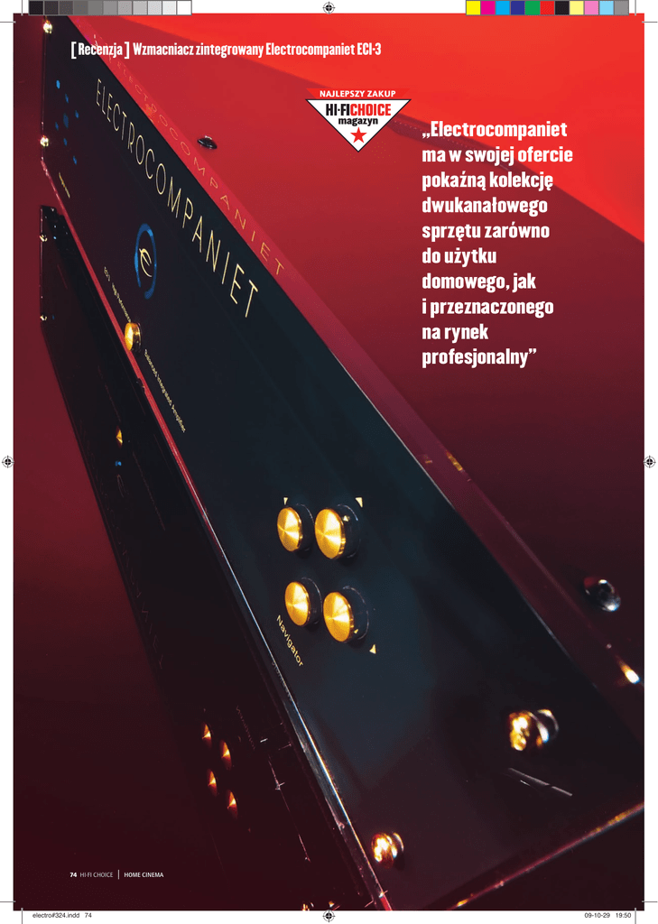 [ Recenzja ] Wzmacniacz zintegrowany Electrocompaniet ECI-3 NAJLEPSZY ZAKUP magazyn 74 HI-FI CHOICE electro#324.indd 74 | „Electrocompaniet ma w swojej ofercie pokaźną kolekcję dwukanałowego sprzętu zarówno do użytku domowego, jak i przeznaczonego na rynek profesjonalny” HOME CINEMA 09-10-29 19:50 Powrót króla Electrocompaniet powraca z nowym znakomitym wzmacniaczem PRODUKT Electrocompaniet ECI-3 RODZAJ Wzmacniacz zintegrowany CENA 7.800 zł NAJWAŻNIEJSZE CECHY Wymiary (SxWxG): 48,3x11,5x41cm > Waga: 12kg > Deklarowana moc: 70W (8Ω) > Wejścia: 5 x RCA phono, XLR > Wyjścia: 2 x magnetofonowe, XLR i przedwzmacniacz RCA KONTAKT www.hificlub.pl N a fali ostatniej wielkiej tragedii w świecie muzyki pop firma Electrocompaniet na krótko zagościła na czołówkach gazet, przynajmniej w rodzimej Norwegii. Chcąc wycisnąć wszystko, co się da z tematu Michaela Jacksona, publicyści doszukali się, że jego producent płyt, Bruce Swedien, zamieścił wzmiankę o wzmacniaczach norweskiej firmy na bestsellerowym albumie Jacksona „HIStory”. Jednak w ostatnich latach o marce Electrocompaniet było cicho, chociaż premiera wzmacniacza ECI-3 może sprawić, że powróci ona na salony w stylu godnym króla popu. Firma Electrocompaniet zajmuje się produkcją zaawansowanego sprzętu hi-fi od ponad 40 lat i cieszyła się w Europie bardzo dobrą reputacją – najwyraźniej chce ją na nowo odbudować, posiadając w swojej ofercie pokaźną kolekcję dwukanałowego sprzętu zarówno do użytku domowego, jak i przeznaczonego na rynek profesjonalny. Seria Classic – w której ECI-3 jest najtańszym ze wzmacniaczy – obejmuje aż pięć odtwarzaczy CD, dwa wzmacniacze zintegrowane, trzy przedwzmacniacze, trzy stereofoniczne końcówki mocy i trzy monobloki oraz przedwzmacniacz gramofonowy! To naprawdę rozbudowana linia, a nie jest przecież jedyną w ofercie firmy. Można wręcz pokusić się o stwierdzenie, że jest to obecnie jedna z liczniejszych serii w segmencie proy duktów dwukanałowych. Electrocompaniet zapewnia, że testowany przez nas wzmacniacz skonstruowano w oparciu o komponenty, które jakością nie ustępują tym, które można znaleźć w najbardziej prestiżowych produktach firmy, tyle że jest ich zapewne nieco mniej, gdyż jest to najsłabsze pod względem mocy urządzenie serii. Norweska firma szczyci się tym, że jej sprzęt pracuje w pełni zbalansowanej konfiguracji ze sprzężeniem DC. Nic więc dziwnego, że opisywany tu wzmacniacz zintegrowany jest wyposażony zarówno w wejście, jak i wyjście XLR pozwalające wykorzystać zalety obwodów zbalansowanych. Taka konfiguracja jest zazwyczaj wybierana przez producentów, gdyż potencjalnie może ograniczyć poziom szumu, co nie zawsze jest zauważalne w warunkach domowych, gdzie nie mamy do czynienia z kilometrami kabli. Panel czołowy ma bardzo charakterystyczny wygląd i jest pozbawiony jakichkolwiek gałek czy pokręteł. Z zaledwie pięcioma przyciskami jest bardzo minimalistyczny i wymaga przyzwyczajenia się do niekonwencjonalnej obsługi. Tak naprawdę wzmacniacz jest jednak bardzo intuicyjny w obsłudze. Kiedy światełko na zmotoryzowanym potencjometrze głośności za panelem zacznie się przesuwać, wiemy, że znaleźliśmy przyciski góra/dół sterujące głośnością. Z kolei przyciski prawo/lewo służą do przełączania źródeł, a ich nazwy pojawiają się w podświetlanym oknie „Navigator window” z lewej strony panelu. Stosunkowo konwencjonalny pilot uniwersalny, uzupełniający skromny zestaw opcji o funkcję wyciszenia, wprowadza wzmacniacz w stan gotowości. Wewnątrz solidnej obudowy z akrylowym przednim panelem znajdziemy opracowany przez inżynierów Electrocompanieta układ zasilania z „pływającym” transformatorem. p Wedługg zapewnień firmyy układ ten jjest w stanie dostarczyć dwukrotnie więcej prądu niż konstrukcje konwencjonalne. Potwierdzeniem tego ma być fakt, że ECI-3 działa stabilnie nawet przy obciążeniu rzędu 0,5Ω. Nie jest to sytuacja, z którą moglibyśmy mieć na co dzień do czynienia – nawet najbardziej wymagające kolumny rzadko schodzą poniżej 1Ω – ale z pewnością zwiększa to zaufanie do całego urządzenia. Tylny panel jest dość standardowy. Mamy tu zestaw wejść i wyjść RCA phono oraz ich zbalansowane odpowiedniki. Nie ma za to wejścia dla systemów kina domowego ani portu umożliwiającego aktualizację oprogramowania firmowego. Porównajmy to chociażby z Arcamem A38, który jest wyposażony w dwa zestawy terminali głośnikowych, miejsce na opcjonalny przedwzmacniacz gramofonowy, 12-woltowy trigger, gniazdo zdalnego sterowania itp. – a wszystko to możemy mieć za mniej więcej taką samą cenę. Może to właśnie dlatego Electrocompaniet może sobie pozwolić na w pełni zbalansowaną architekturę? JAKOŚĆ DŹWIĘKU Electrocompaniet nalega, aby jego wzmacniacze były wykorzystywane w połączeniu ze źródłami wyposażonymi w wyjście zbalansowane – zasugerowano nam wykorzystanie w testach jednego z firmowych odtwarzaczy CD. Jednak ta kusząca propozycja znacznie skomplikowałaby procedurę testową. Dlatego zdecydowaliśmy się na odtwarzacz Leema Antila II. Z czystej ciekawości podłączyliśmy odtwarzacz zarówno do wejść zbalansowanych, jak i niezbalansowanych wzmacniacza, wykorzystując kable DNM z odpowiednimi wtykami. Szczerze mówiąc, różnica nie była zbyt duża, ale we wszystkich nieporównawczych sesjach odsłuchowych korzystaliśmy p ą g z połączenia zbalansowanego. HOME CINEMA electro#324.indd 75 | HI-FI CHOICE 75 09-10-29 19:50 [ Recenzja ] Wzmacniacz zintegrowany Electrocompaniet ECI-3 ECI-3 charakteryzuje się ogólnie bardzo niskim poziomem szumów, co każe się zastanowić, czy korzystanie ze złączy zbalansowanych jest naprawdę konieczne. Słuchając płyty Keitha Jarreta z Carnegie Hall nie udało nam się co prawda wychwycić wszystkich detali, ale byliśmy w stanie zajrzeć g