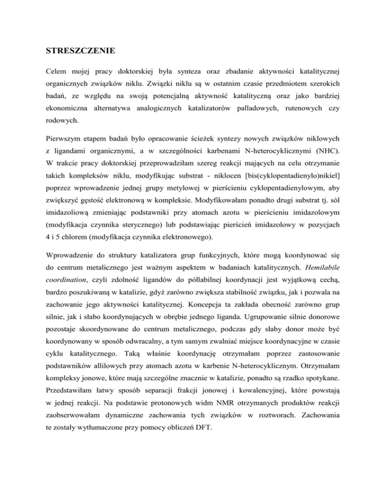 STRESZCZENIE Celem mojej pracy doktorskiej była synteza oraz zbadanie aktywności katalitycznej organicznych związków niklu. Związki niklu są w ostatnim czasie przedmiotem szerokich badań, ze względu na swoją potencjalną aktywność katalityczną oraz jako bardziej ekonomiczna alternatywa analogicznych katalizatorów palladowych, rutenowych czy rodowych. Pierwszym etapem badań było opracowanie ścieżek syntezy nowych związków niklowych z ligandami organicznymi, a w szczególności karbenami N-heterocyklicznymi (NHC). W trakcie pracy doktorskiej przeprowadziłam szereg reakcji mających na celu otrzymanie takich kompleksów niklu, modyfikując substrat - niklocen [bis(cyklopentadienylo)nikiel] poprzez wprowadzenie jednej grupy metylowej w pierścieniu cyklopentadienylowym, aby zwiększyć gęstość elektronową w kompleksie. Modyfikowałam ponadto drugi substrat tj. sól imidazoliową zmieniając podstawniki przy atomach azotu w pierścieniu imidazolowym (modyfikacja czynnika sterycznego) lub podstawiając pierścień imidazolowy w pozycjach 4 i 5 chlorem (modyfikacja czynnika elektronowego). Wprowadzenie do struktury katalizatora grup funkcyjnych, które mogą koordynować się do centrum metalicznego jest ważnym aspektem w badaniach katalitycznych. Hemilabile coordination, czyli zdolność ligandów do półlabilnej koordynacji jest wyjątkową cechą, bardzo poszukiwaną w katalizie, gdyż zarówno zwiększa stabilność związku, jak i pozwala na zachowanie jego aktywności katalitycznej. Koncepcja ta zakłada obecność zarówno grup silnie, jak i słabo koordynujących w obrębie jednego liganda. Ugrupowanie silnie donorowe pozostaje skoordynowane do centrum metalicznego, podczas gdy słaby donor może być koordynowany w sposób odwracalny, a tym samym zwalniać miejsce koordynacyjne w czasie cyklu katalitycznego. Taką właśnie koordynację otrzymałam poprzez zastosowanie podstawników allilowych przy atomach azotu w karbenie N-heterocyklicznym. Otrzymałam kompleksy jonowe, które mają szczególne znacznie w katalizie, ponadto są rzadko spotykane. Przedstawiłam łatwy sposób separacji frakcji jonowej i kowalencyjnej, które powstają w jednej reakcji. Na podstawie protonowych widm NMR otrzymanych produktów reakcji zaobserwowałam dynamiczne zachowania tych związków w roztworach. Zachowania te zostały wytłumaczone przy pomocy obliczeń DFT. Zsyntetyzowałam oraz scharakteryzowałam ponad 25 nowych związków nikloorganicznych, z czego dla 12 została określona struktura w ciele stałym metodą rentgenograficzną. Następnie otrzymane związki wykorzystałam, jako składniki układów katalitycznych w reakcjach polimeryzacji karbenów i olefin, oligomeryzacji karbenów oraz tworzenia wiązań węgiel-węgiel w reakcji sprzęgania krzyżowego Suzuki. Celem polimeryzacji karbenów jest otrzymanie nowych niedostępnych do tej pory polimerów o unikalnych właściwościach. Polimery posiadające polarne grupy funkcyjne na każdym atomie węgla w łańcuchu są materiałami godnymi uwagi, gdyż obecność tych grup wpływa na właściwości adhezyjne, właściwości powierzchniowe, odporność na działanie rozpuszczalników, mieszalność z innymi polimerami, właściwości reologiczne. Wykazałam, że oligomeryzacja zachodzi przy zastosowaniu, jako katalizatora, niklocenu oraz układu katalitycznego niklocen-butylolit otrzymując średnie masy cząsteczkowe oligomerów od 500 do 1100 Da, z różnymi grupami końcowymi w zależności od środowiska reakcji. Przy użyciu kompleksów niklu z karbenami N-heterocyklicznymi oraz metyloalumoksanu, jako aktywatora reakcji, uzyskałam już znacznie wyższe średnie masy cząsteczkowe tj. 16 kDa. Ponadto stwierdziłam, że karben NHC wbudowuje się w łańcuch oligomeru. Jak dotąd taki przypadek nie został opisany w literaturze. Otrzymane kompleksy testowałam również, jako katalizatory w reakcji sprzęgania kwasu fenyloboronowego z p-bromoacetofenonem (sprzęganie Suzuki) oraz polimeryzacji styrenu. W obu reakcjach wykazały one wysoką aktywność katalityczną. W przypadku sprzęgania Suzuki konwersja substratów sięgała 80 %, ponadto reakcje te odznaczały się wysoką selektywnością przekraczającą 96 %. Zróżnicowanie wyników pozwoliło mi na określenie zależności pomiędzy budową katalizatora a jego aktywnością. Potwierdziłam, że kompleksy jonowe są dużo bardziej aktywne niż kompleksy kowalencyjne zawierające te same ligandy. W przypadku polimeryzacji olefin kompleksy kowalencyjne oraz kompleks posiadający koordynację podwójnego wiązania do niklu wykazały znacznie wyższą aktywność katalityczną niż kompleksy jonowe posiadające dwa karbeny skoordynowane do atomu niklu. Najwyższą aktywność katalityczną charakteryzuje się chlorowy kompleks niklu z ligandem metylocyklopentadienylowym. W jego przypadku wydajność reakcji polimeryzacji styrenu wyniosła 76 %, a średni ciężar cząsteczkowy ponad 300 kDa.