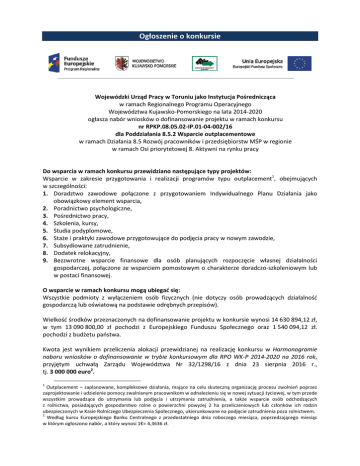 Ogłoszenie o konkursie Wojewódzki Urząd Pracy w Toruniu jako Instytucja Pośrednicząca w ramach Regionalnego Programu Operacyjnego Województwa Kujawsko-Pomorskiego Kujawsko na lata 2014-2020 2020 ogłasza nabór wniosków o dofinansowanie projektu w ramach konkursu nr RPKP.08.05.02-IP.01-04-002/16 dla Poddziałania 8.5.2 Wsparcie outplacementowe w ramach Działania 8.5 Rozwój pracowników i przedsiębiorstw MŚP w regionie w ramach Osi priorytetowej 8. Aktywni na rynku pracy Do wsparcia w ramach konkursu przewidziano następujące na typy projektów: Wsparcie w zakresie przygotowania i realizacji programów typu outplacement1, obejmujących w szczególności: 1. Doradztwo zawodowe połączone z przygotowaniem Indywidualnego Planu Działania jako obowiązkowy element wsparcia, 2. Poradnictwo psychologiczne, 3. Pośrednictwo pracy, 4. Szkolenia, kursy, 5. Studia podyplomowe, 6. Staże i praktyki zawodowe przygotowujące do podjęcia pracy w nowym zawodzie, 7. Subsydiowane zatrudnienie, 8. Dodatek relokacyjny, 9. Bezzwrotne wsparcie finansowe dla osób planujących planujących rozpoczęcie własnej działalności gospodarczej, połączone ze wsparciem pomostowym o charakterze doradczo-szkoleniowym doradczo lub w postaci finansowej. O wsparcie w ramach konkursu mogą ubiegać się: Wszystkie podmioty z wyłączeniem osób fizycznych (nie dotyczy dotyczy osób prowadzących działalność gospodarczą lub oświatową na podstawie odrębnych przepisów). Wielkość środków przeznaczonych na dofinansowanie projektu w konkursie wynosi 14 630 894,12 zł, w tym 13 090 800,00 zł pochodzi z Europejskiego Funduszu Społecznego Społecznego oraz 1 540 094,12 zł. pochodzi z budżetu państwa. Kwota jest wynikiem przeliczenia alokacji przewidzianej na realizację konkursu w Harmonogramie naboru wniosków o dofinansowanie w trybie konkursowym dla RPO WK-P WK P 2014-2020 2014 na 2016 rok, przyjętym uchwałą Zarządu Województwa Nr 32/1298/16 z dnia 23 sierpnia 2016 r., tj. 3 000 000 euro2. 1 Outplacement – zaplanowane, kompleksowe działania, mające na celu skuteczną organizację organizację procesu zwolnień poprzez zaprojektowanie i udzielenie pomocy zwalnianym pracownikom w odnalezieniu się w nowej sytuacji życiowej, w tym przede wszystkim prowadzące do utrzymania lub podjęcia i utrzymania zatrudnienia, a także wsparcie osób odchodzących odchod z rolnictwa, posiadających gospodarstwo rolne o powierzchni powyżej 2 ha przeliczeniowych lub członków ich rodzin ubezpieczonych w Kasie Rolniczego Ubezpieczenia Społecznego, ukierunkowane na podjęcie zatrudnienia poza rolnictwem. 2 Według kursu Europejskiego Banku Centralnego z przedostatniego dnia roboczego miesiąca, poprzedzającego miesiąc w którym ogłoszono nabór, a który wynosi 1€= 1 4,3636 zł. Minimalna wartość projektu wynosi 100 000 zł. Średni koszt na uczestnika projektu nie przekracza 18 000 zł3. Minimalny wkład własny w przypadku projektów nieobjętych pomocą publiczną lub niegenerujących dochodu, wynosi 5,00% całkowitych wydatków kwalifikowalnych projektu. Maksymalny poziom dofinansowania UE wydatków kwalifikowalnych na poziomie projektu wynosi 85%. Maksymalny poziom dofinansowania całkowitego wydatków kwalifikowalnych na poziomie projektu wynosi 95%. Dla projektów podlegających zasadom udzielania pomocy publicznej maksymalny poziom dofinansowania przyznawany jest zgodnie z zasadami określonymi w przepisach dotyczących pomocy publicznej. Konkurs ma charakter otwarty. Nabór wniosków o dofinansowanie projektu prowadzony będzie w sposób ciągły. Ocena projektów złożonych w ramach konkursu otwartego będzie przebiegać w miesięcznych turach konkursowych, w trakcie których powołana do tego Komisja Oceny Projektów (KOP) przeprowadzi ocenę wniosków o dofinansowanie projektu złożonych w danej turze konkursowej do Instytucji Organizującej Konkurs (IOK), w odpowiedzi na konkurs. Termin składania wniosków o dofinansowanie projektów w ramach pierwszej tury konkursowej rozpocznie się 30.09.2016 r. i potrwa do 31.10.2016 r. IOK zamieści na stronie internetowej z wyprzedzeniem co najmniej 5 dni przed końcem miesiąca poprzedzającego rozpoczęcie tury, informację o planowanym terminie kolejnej tury konkursowej, która rozpocznie się od 01.11.2016 r. (taki schemat działania będzie obowiązywał w trakcie realizacji konkursu do wyczerpania środków przewidzianych na wskazane działania – zgodnie z opisem poniżej). Liczba tur konkursowych jest uzależniona od stopnia wykorzystania kwoty środków przeznaczonych na konkurs. Nabór wniosków o dofinansowanie projektu potrwa do dnia roboczego, w którym wyczerpana zostanie alokacja środków finansowych przeznaczonych na konkurs lub do dnia zamknięcia konkursu odpowiednią decyzją IOK. IOK może podjąć decyzję o zawieszeniu/anulowaniu/zamknięciu konkursu w przypadku, gdy łączna kwota wnioskowanego dofinansowania we wnioskach o dofinansowanie projektów złożonych w odpowiedzi na konkurs przekroczy 100% kwoty środków przeznaczonych na dofinansowanie projektów w ramach konkursu. IOK zamieści na stronie internetowej niezwłocznie informację o planowanej dacie zawieszenia, anulowania bądź zamknięcia konkursu. Formularz wniosku o dofinansowanie projektu należy w pierwszej kolejności wypełnić i przesłać w Generatorze Wniosków o Dofinansowanie dla RPO WK-P 2014-2020 dostępnym na stronie www.gwd.kujawsko-pomorskie.pl. Następnie należy złożyć wniosek w formie papierowej. Oznacza to złożenie dwóch egzemplarzy wniosku o dofinansowanie projektu w formie papierowej wraz z dwoma egzemplarzami załączników albo przesłanie jednego egzemplarza wraz z załącznikami w formie dokumentu elektronicznego. Wnioski o dofinansowanie projektu w formie papierowej wraz z załącznikami należy składać w dni robocze od poniedziałku do piątku w godzinach od 7.30 do 15.30 w Kancelarii Wojewódzkiego Urzędu Pracy w Toru