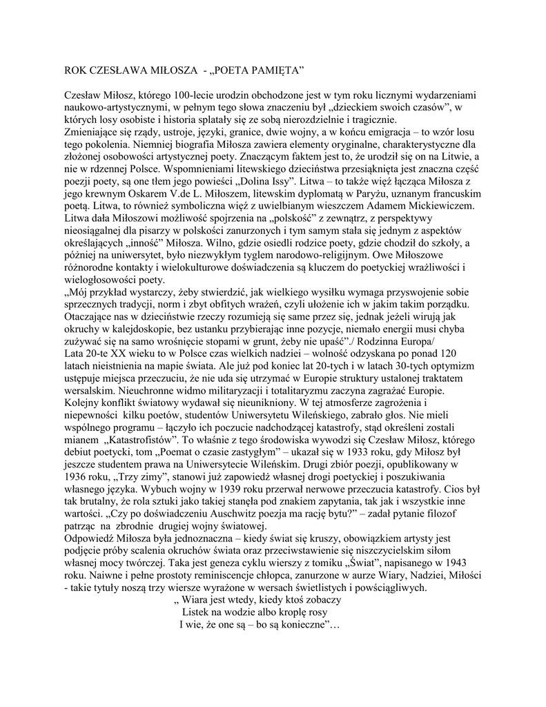ROK CZESŁAWA MIŁOSZA - „POETA PAMIĘTA” Czesław Miłosz, którego 100-lecie urodzin obchodzone jest w tym roku licznymi wydarzeniami naukowo-artystycznymi, w pełnym tego słowa znaczeniu był „dzieckiem swoich czasów”, w których losy osobiste i historia splatały się ze sobą nierozdzielnie i tragicznie. Zmieniające się rządy, ustroje, języki, granice, dwie wojny, a w końcu emigracja – to wzór losu tego pokolenia. Niemniej biografia Miłosza zawiera elementy oryginalne, charakterystyczne dla złożonej osobowości artystycznej poety. Znaczącym faktem jest to, że urodził się on na Litwie, a nie w rdzennej Polsce. Wspomnieniami litewskiego dzieciństwa przesiąknięta jest znaczna część poezji poety, są one tłem jego powieści „Dolina Issy”. Litwa – to także więź łącząca Miłosza z jego krewnym Oskarem V.de L. Miłoszem, litewskim dyplomatą w Paryżu, uznanym francuskim poetą. Litwa, to również symboliczna więź z uwielbianym wieszczem Adamem Mickiewiczem. Litwa dała Miłoszowi możliwość spojrzenia na „polskość” z zewnątrz, z perspektywy nieosiągalnej dla pisarzy w polskości zanurzonych i tym samym stała się jednym z aspektów określających „inność” Miłosza. Wilno, gdzie osiedli rodzice poety, gdzie chodził do szkoły, a póżniej na uniwersytet, było niezwykłym tyglem narodowo-religijnym. Owe Miłoszowe różnorodne kontakty i wielokulturowe doświadczenia są kluczem do poetyckiej wrażliwości i wielogłosowości poety. „Mój przykład wystarczy, żeby stwierdzić, jak wielkiego wysiłku wymaga przyswojenie sobie sprzecznych tradycji, norm i zbyt obfitych wrażeń, czyli ułożenie ich w jakim takim porządku. Otaczające nas w dzieciństwie rzeczy rozumieją się same przez się, jednak jeżeli wirują jak okruchy w kalejdoskopie, bez ustanku przybierając inne pozycje, niemało energii musi chyba zużywać się na samo wrośnięcie stopami w grunt, żeby nie upaść”./ Rodzinna Europa/ Lata 20-te XX wieku to w Polsce czas wielkich nadziei – wolność odzyskana po ponad 120 latach nieistnienia na mapie świata. Ale już pod koniec lat 20-tych i w latach 30-tych optymizm ustępuje miejsca przeczuciu, że nie uda się utrzymać w Europie struktury ustalonej traktatem wersalskim. Nieuchronne widmo militaryzacji i totalitaryzmu zaczyna zagrażać Europie. Kolejny konflikt światowy wydawał się nieunikniony. W tej atmosferze zagrożenia i niepewności kilku poetów, studentów Uniwersytetu Wileńskiego, zabrało głos. Nie mieli wspólnego programu – łączyło ich poczucie nadchodzącej katastrofy, stąd określeni zostali mianem „Katastrofistów”. To właśnie z tego środowiska wywodzi się Czesław Miłosz, którego debiut poetycki, tom „Poemat o czasie zastygłym” – ukazał się w 1933 roku, gdy Miłosz był jeszcze studentem prawa na Uniwersytecie Wileńskim. Drugi zbiór poezji, opublikowany w 1936 roku, „Trzy zimy”, stanowi już zapowiedż własnej drogi poetyckiej i poszukiwania własnego języka. Wybuch wojny w 1939 roku przerwał nerwowe przeczucia katastrofy. Cios był tak brutalny, że rola sztuki jako takiej stanęła pod znakiem zapytania, tak jak i wszystkie inne wartości. „Czy po doświadczeniu Auschwitz poezja ma rację bytu?” – zadał pytanie filozof patrząc na zbrodnie drugiej wojny światowej. Odpowiedź Miłosza była jednoznaczna – kiedy świat się kruszy, obowiązkiem artysty jest podjęcie próby scalenia okruchów świata oraz przeciwstawienie się niszczycielskim siłom własnej mocy twórczej. Taka jest geneza cyklu wierszy z tomiku „Świat”, napisanego w 1943 roku. Naiwne i pełne prostoty reminiscencje chłopca, zanurzone w aurze Wiary, Nadziei, Miłości - takie tytuły noszą trzy wiersze wyrażone w wersach świetlistych i powściągliwych. „ Wiara jest wtedy, kiedy ktoś zobaczy Listek na wodzie albo kroplę rosy I wie, że one są – bo są konieczne”… „ Nadzieja bywa, jeżeli ktoś wierzy, Że ziemia nie jest snem, lecz żywym ciałem, I że wzrok, dotyk ani słuch nie kłamie…” „ Miłość to znaczy popatrzeć na siebie, Tak jak się patrzy na obce nam rzeczy, Bo jesteś tylko jedną z rzeczy wielu. A kto tak patrzy, choć sam o tym nie wie, Ze zmartwień różnych swoje serce leczy, Ptak mu i drzewo mówią – przyjacielu. Wtedy i siebie, i rzeczy chce użyć, Żeby stanęły w wypełnienia łunie. To nic, że czasem nie wie, czemu służyć: Nie ten najlepiej służy, kto rozumie”. Doświadczenia wojenne każą poecie porzucić poszukiwania teoretyczne i estetyczne – pesymizm wypiera katastrofizm, ironia zajmuje miejsce poczucia krzywdy. W czasie wojny Miłosz tłumaczy Shakespeare, „Ziemię jałową” Eliota, co również okaże się ważne dla dalszego rozwoju jego poezji, która obierze drogę intelektualnego dialogu z tradycją i wartościami uniwersalnymi ludzkości. „Zbyt dużo widzieliśmy zbrodni abyśmy się dobra wyrzec mogli” - te słowa poety są jak gwiazda przewodnia jego twórczości, twórczości dotykającej bólu istnienia, paradoksów życia, wiecznego błądzenia – zagubienia i odnajdywania – zachwycania się – światem, człowiekiem, naturą. Poeta każdym słowem podejmuje walkę, aby literatura nie zdradziła sprawy człowieka: „Który skrzywdziłeś człowieka prostego Śmiechem nad krzywdą jego wybuchając Nie bądź bezpieczny. Poeta pamięta. Możesz go zabić – narodzi się nowy. Spisane będą czyny i rozmowy” Duża odpowiedzialność za słowo i myśl tchnie ze słów poety ocalonego z wojennej apokalipsy. Ocalony by dać świadectwo. O dalszych etapach życia i twórczości Czesława Miłosza za miesiąc podzieli się z Państwem – Katarzyna Szrodt Wesołych świąt. Alleluja.