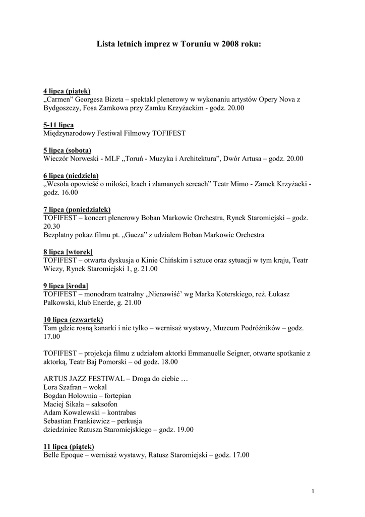 Lista letnich imprez w Toruniu w 2008 roku: 4 lipca (piątek) „Carmen” Georgesa Bizeta – spektakl plenerowy w wykonaniu artystów Opery Nova z Bydgoszczy, Fosa Zamkowa przy Zamku KrzyŜackim - godz. 20.00 5-11 lipca Międzynarodowy Festiwal Filmowy TOFIFEST 5 lipca (sobota) Wieczór Norweski - MLF „Toruń - Muzyka i Architektura”, Dwór Artusa – godz. 20.00 6 lipca (niedziela) „Wesoła opowieść o miłości, łzach i złamanych sercach” Teatr Mimo - Zamek KrzyŜacki godz. 16.00 7 lipca (poniedziałek) TOFIFEST – koncert plenerowy Boban Markowic Orchestra, Rynek Staromiejski – godz. 20.30 Bezpłatny pokaz filmu pt. „Gucza” z udziałem Boban Markowic Orchestra 8 lipca [wtorek] TOFIFEST – otwarta dyskusja o Kinie Chińskim i sztuce oraz sytuacji w tym kraju, Teatr Wiczy, Rynek Staromiejski 1, g. 21.00 9 lipca [środa] TOFIFEST – monodram teatralny „Nienawiść’ wg Marka Koterskiego, reŜ. Łukasz Palkowski, klub Enerde, g. 21.00 10 lipca (czwartek) Tam gdzie rosną kanarki i nie tylko – wernisaŜ wystawy, Muzeum PodróŜników – godz. 17.00 TOFIFEST – projekcja filmu z udziałem aktorki Emmanuelle Seigner, otwarte spotkanie z aktorką, Teatr Baj Pomorski – od godz. 18.00 ARTUS JAZZ FESTIWAL – Droga do ciebie … Lora Szafran – wokal Bogdan Hołownia – fortepian Maciej Sikała – saksofon Adam Kowalewski – kontrabas Sebastian Frankiewicz – perkusja dziedziniec Ratusza Staromiejskiego – godz. 19.00 11 lipca (piątek) Belle Epoque – wernisaŜ wystawy, Ratusz Staromiejski – godz. 17.00 1 ARTUS JAZZ FESTIWAL – Francis Wong Trio Francis Wong – saksofon, flety Tatsu Aoki – bass, taiko drum Chad Taylor – perkusja Sala Mała Dworu Artusa – godz. 19.00 Zakończenie TOFIFEST – Teatr Baj Pomorski – godz. 19.00 12 lipca (sobota) Upamiętnienie rocznicy Bitwy pod Grunwaldem – ekspozycja kostiumów filmowych oraz projekcja filmu pt. „KrzyŜacy” reŜ. Aleksander Ford - Zamek KrzyŜacki – od godz. 20.00 Wieczór Rosyjski - MLF „Toruń - Muzyka i Architektura”, Towarzystwo Naukowe w Toruniu – godz. 20.00 13 lipca (niedziela) Kwartet Jorgi – koncert muzyki folkowej, Zamek KrzyŜacki – godz. 16.00 18 lipca (piątek) Festiwal muzyki metalowej i gotyckiej – gotyk na dotyk II, Fosa Zamkowa przy Zamku KrzyŜackim – godz. 16.00 ARTUS JAZZ FESTIWAL – Marcin Wasilewski Trio Marcin Wasilewski – fortepian Sławomir Kurkiewicz – kontrabas Michał Miśkiewicz – perkusja dziedziniec Ratusza Staromiejskiego – godz. 19.00 19 lipca (sobota) Festiwal muzyki metalowej i gotyckiej – gotyk na dotyk II, Fosa Zamkowa przy Zamku KrzyŜackim – godz. 16.00 Nocne zwiedzanie wieŜy Ratusza Staromiejskiego, Muzeum Okręgowe – do godz. 24.00 Wieczór Hiszpański - MLF „Toruń - Muzyka i Architektura”, dziedziniec Ratusza Staromiejskiego – godz. 20.00 20 lipca (niedziela) Dixie Brotherhood – koncert jazzowy, Zamek KrzyŜacki – godz. 16.00 MUZYKA Z TRZECH KONTYNENTÓW Sibel Kose – wokal Bogdan Hołownia – fortepian Bronisław Suchanek – kontrabas dziedziniec Ratusza Staromiejskiego – godz. 19.00 24 lipca (czwartek) Festiwal Tour de Carillon – próba otwarta, recital, Rynek Staromiejski – godz. 18.00 25 lipca (piątek) 2 Festiwal Tour de Carillon – mega koncert, Rynek Staromiejski – godz. 17.00 Toruńskie Gwiazdy – SOFA oraz zespoły wyłonione w plebiscycie, Fosa Zamkowa przy Zamku KrzyŜackim – godz. 18.00 ARTUS JAZZ FESTIWAL – Grapelli Project Maciej Strzelczyk – skrzypce Andrzej Jagodziński – fortepian Andrzej Łukasik – kontrabas Sebastian Frankiewicz – perkusja dziedziniec Ratusza Staromiejskiego – godz. 19.00 26 lipca (sobota) Festiwal Tour de Carillon – recital, Stary Rynek – godz. 12.00 Wieczór w rytmie salsy - MLF „Toruń - Muzyka i Architektura”, Fosa Zamkowa przy Zamku KrzyŜackim – godz. 20.00 27 lipca (niedziela) „Mój Wysocki” – z repertuaru Teatru Piosenki „Maska” - Zamek KrzyŜacki – godz. 16.00 Ciechocińskie Impresje Artystyczne – koncert finałowy, Amfiteatr Muzeum Etnograficznego – godz. 17.00 1 sierpnia (piątek) ARTUS JAZZ FESTIWAL – New Bone Tomasz Kudyk – trąbka, fluegelhorn Marcin Ślusarczyk – saksofon altowy Paweł Kaczmarczyk – fortepian Maciej Adamczyk – kontrabas Arek Sokolik - perkusja dziedziniec Ratusza Staromiejskiego - godz. 19.00 2 sierpnia (sobota) Wieczór kameralny „Pół Ŝartem, pół serio” - MLF „Toruń - Muzyka i Architektura”, Zamek KrzyŜacki – godz. 20.00 3 sierpnia (niedziela) Muzealni tropiciele na Starówce – gra edukacyjna dla dzieci Inscenizacja podpisania II pokoju toruńskiego - warsztat teatralny Podczas imprezy - stragan piernikarski, moŜliwość wypieku pierników, Zamek KrzyŜacki – godz. 16.00 Q-rek y Grandes Artistas de Calle Podmurna Q-rek - tres Cubało, gitary, sample, syntezatory, aranŜacja smyczków i "blachy", aranŜacja beat'ów perkusyjnych i basu Andrzej Frołow - instr. klawiszowe Michał Tyrański - trąbka Mirek Lewandowski - saksofon tenorowy / flet Rafał Krauze - puzon Darek "Tico" Rokiciński - instr. perkusyjne 3 Anna Stanisławska – wokal dziedziniec Ratusza Staromiejskiego – godz. 19.00 8 sierpnia (piątek) ARTUS JAZZ FESTIWAL – Nicolas Simion and Friends Nicolas Simion – klarnet basowy, saksofon Piotr Wojtasik – trąbka Krystyna Stańko – wokal Dominik Bukowski – marimba, wibrafon Maciej Adamczak – kontrabas Rafael Ugha – instrumenty perkusyjne Czesław Bartkowski – perkusja dziedziniec Ratusza Staromiejskiego – godz. 19.00 9 sierpnia (sobota) Koncert pn. „Romanse rosyjskie” w wykonaniu zespołu „Skałaska” oraz „Ruskaja Dusza”, Zamek KrzyŜacki - godz. 20.00 Wieczór operowy „Kocham Cie do szaleństwa” - MLF „Toruń - Muzyka i Architektura”, dziedziniec Ratusza Staromiejskiego – godz. 20.00 10 sierpnia (niedziela) „Bogumił czyli historia Katarzynki” – legenda w konwencji teatru w wykonaniu Edyty Soboczyńsk