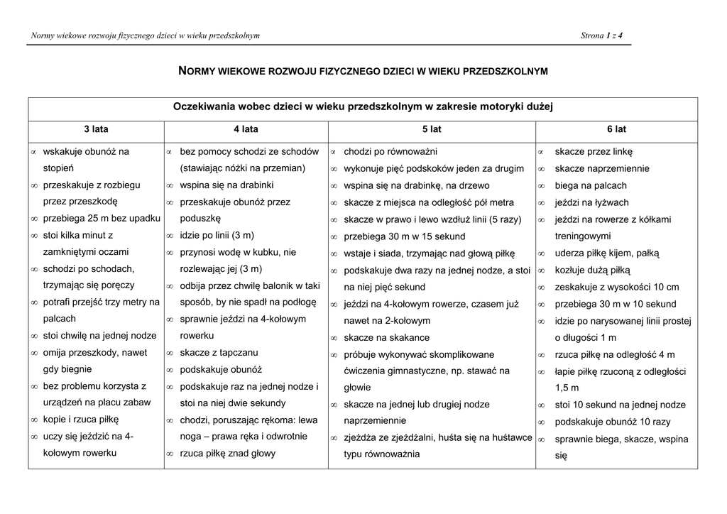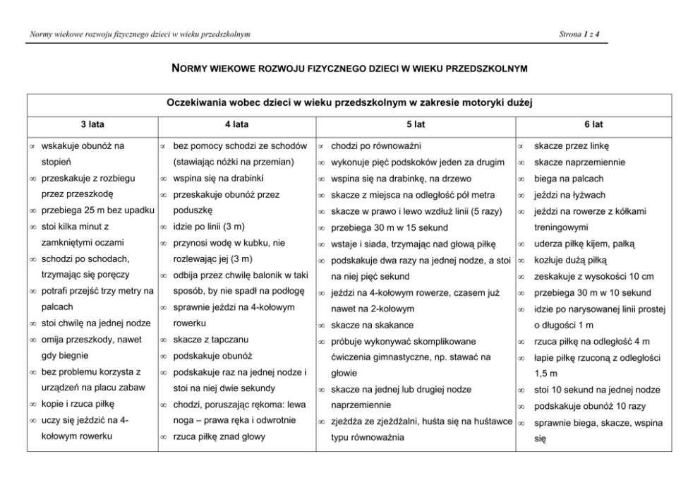 Normy wiekowe rozwoju fizycznego dzieci w wieku przedszkolnym Strona 1 z 4 NORMY WIEKOWE ROZWOJU FIZYCZNEGO DZIECI W WIEKU PRZEDSZKOLNYM Oczekiwania wobec dzieci w wieku przedszkolnym w zakresie motoryki dużej 3 lata • wskakuje obunóż na stopień • przeskakuje z rozbiegu przez przeszkodę • przebiega 25 m bez upadku • stoi kilka minut z zamkniętymi oczami • schodzi po schodach, trzymając się poręczy • potrafi przejść trzy metry na palcach • stoi chwilę na jednej nodze • omija przeszkody, nawet gdy biegnie • bez problemu korzysta z urządzeń na placu zabaw • kopie i rzuca piłkę • uczy się jeździć na 4kołowym rowerku 4 lata • bez pomocy schodzi ze schodów 5 lat 6 lat • chodzi po równoważni • skacze przez linkę • wykonuje pięć podskoków jeden za drugim • skacze naprzemiennie • wspina się na drabinki • wspina się na drabinkę, na drzewo • biega na palcach • przeskakuje obunóż przez • skacze z miejsca na odległość pół metra • jeździ na łyżwach • skacze w prawo i lewo wzdłuż linii (5 razy) • jeździ na rowerze z kółkami (stawiając nóżki na przemian) poduszkę • idzie po linii (3 m) • przebiega 30 m w 15 sekund • przynosi wodę w kubku, nie • wstaje i siada, trzymając nad głową piłkę rozlewając jej (3 m) • odbija przez chwilę balonik w taki sposób, by nie spadł na podłogę • sprawnie jeździ na 4-kołowym rowerku • skacze z tapczanu na niej pięć sekund • jeździ na 4-kołowym rowerze, czasem już nawet na 2-kołowym • próbuje wykonywać skomplikowane • podskakuje raz na jednej nodze i głowie noga – prawa ręka i odwrotnie • rzuca piłkę znad głowy • skacze na jednej lub drugiej nodze naprzemiennie kozłuje dużą piłką zeskakuje z wysokości 10 cm • przebiega 30 m w 10 sekund • idzie po narysowanej linii prostej o długości 1 m • rzuca piłkę na odległość 4 m • łapie piłkę rzuconą z odległości 1,5 m • stoi 10 sekund na jednej nodze • podskakuje obunóż 10 razy • zjeżdża ze zjeżdżalni, huśta się na huśtawce • typu równoważnia uderza piłkę kijem, pałką • • skacze na skakance ćwiczenia gimnastyczne, np. stawać na • chodzi, poruszając rękoma: lewa • • podskakuje dwa razy na jednej nodze, a stoi • • podskakuje obunóż stoi na niej dwie sekundy treningowymi sprawnie biega, skacze, wspina się Normy wiekowe rozwoju fizycznego dzieci w wieku przedszkolnym • chwyta odbitą piłkę • podskakuje na jednej nodze • balansuje na jednej nodze przez 10 sekund • po rozhuśtaniu, dalej samo huśta się na huśtawce • przeskakuje z nogi na nogę Strona 2 z 4 • nie hamuje już ruchów huśtawki wiszącej, • jeździ na 2-kołowym rowerze poddając się jej ruchom wahadłowym • lubi zabawy ruchowe, ale może • po wyćwiczeniu potrafi rozhuśtać się na huśtawce wiszącej się szybko męczyć • • jeździ na hulajnodze • biega raczej na palcach i lekko, lubi się ścigać • skacze lekko na obu nogach w miejscu i do przodu, nie tracąc równowagi • potrafi z rozbiegu kopnąć piłkę • potrafi zrobić dwa, trzy przysiady i wstawać bez utraty równowagi • potrafi stać przez chwilę na obu nogach, mając zamknięte oczy, i utrzymywać równowagę • potrafi stać na jednej nodze lub kilka razy na niej podskoczyć w miejscu, lekko się chwiejąc może jeździć na łyżwach, nartach, rolkach • ma czasem problemy z koordynacją ruchową, potyka się, upada Normy wiekowe rozwoju fizycznego dzieci w wieku przedszkolnym Strona 3 z 4 Oczekiwania wobec dzieci w wieku przedszkolnym w zakresie motoryki małej 3 lata 4 lata • rysuje okrągłe formy: koła, słoneczka • trzyma w palcach kredkę • przelewa wodę z kubka do kubka, nie • odrysowuje kształty kilkoma różnymi rozlewając jej 5 lat • rysuje (ołówkiem lub kredką) proste 6 lat • obrazki zwija w rulon 2-metrową wstążkę pociągnięciami • skręca śrubę z nakrętką • dobrze rysuje i maluje • buduje z klocków (więcej niż z • może mieć trudności z • składa kartkę na pół • prawidłowo trzyma ołówek • nawleka duże koraliki na sznurek • rysuje kwadraty, domki • układa proste puzzle • buduje wieżę z ośmiu klocków • składa papier, co najmniej podwójnie • rysuje koło, kwadrat, • próbuje bawić się nożyczkami • rozwija cukierek z papierka • rozpoznaje przedmioty po dotyku prostokąt, romb • po demonstracji potrafi narysować • otwiera pudełko po zapałkach • samo odpina i zapina guziki • przecina 1,5-centymetrowy pasek kwadrat dziesięciu) poprzez torbę • lepi zwierzęta z plasteliny (z dwóch, trzech części) papieru • sznuruje buty • łączy punkty linią prostą • rysuje krzyż • lepi kulkę lub węża z plasteliny • umie wycinać nożyczkami po • odkręca słoik • otwiera drzwi zaznaczonej linii • koloruje obrazki, nie wychodząc za linię • potrafi posmarować chleb masłem • układa literkę „Z” z zapałek • nawleka nitkę na igłę z dużym uchem • wrzuca 10 koralików do buteleczki pisaniem • rysuje człowieka • wiąże sznurowadła Normy wiekowe rozwoju fizycznego dzieci w wieku przedszkolnym Strona 4 z 4 Źródło: oprac. P. Wiliński na bazie pracy projektowej K. Mielczarek i E. Matkowskiej – studentek III roku edukacji elementarnej GSW „Milenium” w Gnieźnie, przygotowanej na podstawie: 1. J. Raczek (red.), Motoryczność dzieci i młodzieży – aspekty teoretyczne oraz implikacje metodyczne, Wyd. AWF, Katowice 1986. 2. R. Przewęda, Rozwój somatyczny i motoryczny, WSiP, Warszawa 1981. 3. B. Janiszewska, Wesoła szkoła i przyjaciele. Diagnoza dojrzałości szkolnej u progu klasy 1. Karty ćwiczeń, WSiP, Warszawa 2010, s. 11–12. 4. H. Bee, Psychologia rozwoju człowieka, Wyd. Zysk i S-ka, Poznań 2004, s. 198. 5. E. Hurlock, Rozwój dziecka, T. 1, PWN, Warszawa 1985, s. 282–284. 6. M. Żebrowska (red.), Psycho