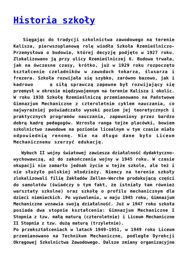 Historia szkoły Sięgając do tradycji szkolnictwa zawodowego na terenie Kalisza, pierwszoplanową rolę wiodła Szkoła RzemieślniczoPrzemysłowa o budowie, której decyzję podjęto w 1927 roku. Zlokalizowano ją przy ulicy Rzemieślniczej 6. Budowa trwała, jak na ówczesne czasy, krótko, już w 1929 roku rozpoczęto kształcenie czeladników w zawodach tokarza, ślusarza i frezera. Szkoła rozwijała się szybko, zarówno bazowo, jak i kadrowo a siłą sprawczą zapewne był rozwijający się przemysł w okresie międzywojennym na terenie Kalisza i okolic. W roku 1938 Szkołę Rzemieślniczą przemianowano na Państwowe Gimnazjum Mechaniczne z czteroletnim cyklem nauczania, co najwyraźniej poświadczało wysoki poziom jej teoretycznych i praktycznych programów nauczania, zapewniony przez bardzo dobrą kadrę pedagogów. Wzrosła ranga tejże placówki, bowiem szkolnictwo zawodowe na poziomie licealnym w tym czasie miało odpowiednią renomę. Nie na długo dane było Liceum Mechanicznemu szerzyć edukację. Wybuch II wojny światowej zawiesza działalność dydaktycznowychowawczą, aż do zakończenia wojny w 1945 roku. W czasie okupacji nie zamarło jednak życie w tejże szkole, ale też i nie służyło polskiej młodzieży. Niemcy na terenie szkoły zlokalizowali filię Zakładów Zellen-Werche produkującą części do samolotów (świadczy o tym fakt, że istniały tam również warsztaty szkolne) oraz szkołę o profilu mechanicznym dla dzieci niemieckich. Po wyzwoleniu, w maju 1945 roku, Gimnazjum Mechaniczne wznawia swoją działalność. Już w 1947 roku szkoła posiada dwa stopnie kształcenia: Gimnazjum Mechaniczne I Stopnia z tzw. małą maturą (czteroletnie) i Liceum Mechaniczne II Stopnia z tzw. dużą maturą (trzyletnie). Po przekształceniach w latach 1949-1951, w 1949 roku Liceum przemianowano na Technikum Mechaniczne, podległe Dyrekcji Okręgowej Szkolnictwa Zawodowego. Dalsze zmiany organizacyjne prowadzą do utworzenia decyzją Ministerstwa Transportu Drogowego i Lotniczego w 1950r. Technikum Samochodowego. Z powodu trudności lokalowych Technikum Samochodowe wraz z Liceum Mechanicznym zostaje przeniesione 1.09.1951roku do jednego z budynków Szkoły Podstawowej nr 1 przy ul. 3-go Maja 18. W budynku przy ul. Rzemieślniczej 6 zostaje utworzona Zasadnicza Szkoła Metalowa. Powstałe Technikum Samochodowe nie posiadało warsztatów szkolnych, więc zorganizowano zajęcia w piwnicach szkoły oraz zakładach pracy, m. in.: w Kaliskiej Odlewni Części Samochodowych i Spółdzielni Transportowej „Spójnia”. W 1951 roku rozpoczęto adaptację starej odlewni metali kolorowych przy ul. Garncarskiej na warsztaty szkolne. W latach 1952-54 uzupełniono niezbędne maszyny, obrabiarki i podstawowe urządzenia dostosowane do profili kształcenia. Oddano je do użytku w roku szkolnym 1954/55 a działalność warsztatów była typowo szkoleniowa, finansowana z budżetu państwa. Od 1952 roku szkoła podlega bezpośrednio Ministerstwu Transportu Drogowego i Lotniczego w Warszawie, a po reorganizacji szkolnictwa zawodowego w roku 1955 przechodzi pod nadzór Kuratorium Okręgu Szkolnego Poznańskiego w Poznaniu. Ówczesne 4-letnie Technikum Samochodowe prowadzi dwa kierunki kształcenia: naprawę i eksploatację pojazdów samochodowych i obróbkę skrawaniem. Po przedłużeniu nauki do pięciu lat, wprowadzono nowe kierunki kształcenia: eksploatacja taboru maszyn i energetyka. Utworzono też Zasadniczą Szkołę Samochodową przygotowującą kierowców-mechaników pojazdów samochodowych. W latach 60-tych rozpoczęto starania o budowę nowej szkoły wraz z warsztatami przy ulicy Kordeckiego w Kaliszu. Decyzją Kuratorium Okręgu Szkolnego Poznańskiego rozpoczęto budowę kompleksu obiektów szkolnych. Niestety, wybudowano tylko internat, który przekazano do użytku w 1973 roku. W tym samym czasie internat zostaje przekształcony na bursę żeńską jako jednostka międzyszkolna. wstrzymano. Budowę pozostałych obiektów Istotne zmiany w strukturze szkoły nastąpiły w 1973 roku. Utworzono Liceum Zawodowe o specjalności mechanik pojazdów drogowych trzyletnie Technikum Samochodowe na podbudowie zasadniczej Szkoły Zawodowej (samochodowej) o kierunku naprawa i eksploatacja pojazdów samochodowych. Szkoła liczy wówczas 19 oddziałów skupiających 700 uczniów i dysponuje czternastoma pracowniami. Sytuacja bazowa staje się coraz trudniejsza, wprowadzono II zmianę nauczania dla młodzieży trzyletniego technikum, kontynuując również zajęcia dla pracujących. Z nowym podziałem administracyjnym kraju w 1975 roku technikum przechodzi pod nadzór Wychowania w Kaliszu. powstałego Kuratorium Oświaty i Rok później kierunek obróbki skrawaniem zostaje przeniesiony do Technikum Mechanicznego w Kaliszu. W tym też roku Technikum Samochodowe zostaje przekształcone w Zespół Szkół Samochodowych. W roku 1977 powrócono do budowy warsztatów i mimo wielu trudności ostatecznie zdecydowano się na realizację systemem gospodarczym. Oddano je do użytku w 1986 roku. Mimo trudnych warunków lokalowych, szkoła jest nieźle wyposażona w sprzęt i pomoce naukowe. Może się poszczycić wieloma osiągnięciami. Oprócz działalności dydaktyczno-wychowawczej rozwija się praca pozalekcyjna prowadzona przez koła zainteresowań: elektryczne, fotograficzne, motoryzacyjne i kartingowe, zespół muzyczny, Szkolny Klub Sportowy i inne. Każdego roku coraz więcej absolwentów opuszcza mury szkoły, ciągle tu, na ul. 3-maja, tak jak 40 lat temu. W roku 1984 z inicjatywy absolwentów, dyrekcji, rady pedagogicznej i młodzieży Zespół Szkół Samochodowych otrzymał imię Stanisława Staszica. Uroczystość ta zbiegła się z I Zjazdem Absolwentów i zapoczątkowała nowy i piękny rozdział w historii szkoły zbliżając wychowanków do środowiska lokalnego i ogólnopolskiego. Odtąd spotkania młodzieży z jej absolwentami na stałe weszły do tradycji szkoły. Są nimi: 