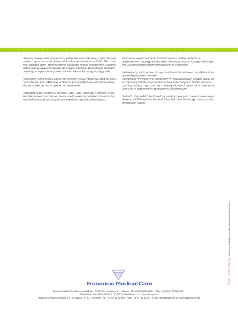 Niniejszy przewodnik szkoleniowy został tak zaprojektowany, aby stanowił praktyczną pomoc w szkoleniu i edukacji pacjentów leczonych DO. Nie może więc zastąpić opinii i doświadczenia leczącego lekarza i pielęgniarki. Leczenie dializą otrzewnową oraz decyzje dotyczące przebiegu konkretnych zabiegów pozostają w wyłącznej odpowiedzialności lekarza leczącego i pielęgniarki. Przewodnik szkoleniowy został opracowany przez Fresenius Medical Care Deutschland GmbH (Niemcy), a obecnie jest udostępniany ośrodkom dializy, aby służył jako pomoc w opiece nad pacjentami. Zastrzegamy sobie prawo do wprowadzania technicznych modyfikacji bez uprzedniego poinformowania. Dostępność wymienionych produktów w poszczególnych krajach zależy od ich rejestracji i lokalnych przepisów prawa. Przed użyciem środka farmaceutycznego należy zapoznać się z treścią informacji zawartej w dołączonej ulotce lub w odpowiednim podręczniku szkoleniowym. Biofine®, stay•safe® i bicaVera® są zarejestrowanymi znakami towarowymi Fresenius AG/Fresenius Medical Care AG, Bad Homburg i dotyczą tylko określonych krajów. 732 630 1/4 GB (2 PUR 05.06) © Copyright 2006 Fresenius Medical Care Deutschland GmbH Copyright © by Fresenius Medical Care, Bad Homburg, Germany 2005. Wszelkie prawa zastrzeżone. Żadna część niniejszej publikacji nie może być reprodukowana, przechowywana w systemach gromadzenia danych, kopiowana, rejestrowana lub transmitowana w żadnej postaci i za pośrednictwem żadnego środka elektronicznego, mechanicznego lub innego, bez wcześniejszego pisemnego pozwolenia właściciela. Fresenius Medical Care Deutschland GmbH · 61346 Bad Homburg v. d. H. · Niemcy · Tel: +49 (0) 6172-609-0 · Faks: +49 (0) 6172-609-2191 Główne biuro: Else-Kröner-Straße 1 · 61352 Bad Homburg v. d. H. · www.fmc-ag.com Fresenius Medical Care Polska S.A. · ul. Krzywa 13 · 60-118 Poznań · Tel: +48-61-83 92 600 - Faks: +48-61-83 92 601 · E-mail : [email protected] · www.fresenius.com.pl Dializa otrzewnowa stay •safe ® balance Przewodnik Szkoleniowy Potwierdzone zalety stay •safe ® balance, następny krok w rozwoju sprawdzonego systemu stay •safe ® Nowy płyn do dializy otrzewnowej o obojętnym pH Płyn jest pakowany w nowego typu dwukomorowe worki. Oddzielenie roztworu glukozy, zawierającego również elektrolity, od buforu pozwala na cieplną sterylizację glukozy w bardzo niskim pH, co w znacznym stopniu ogranicza powstawanie produktów degradacji glukozy. . 2 Połączenie zawartości obu komór worka na krótko przed rozpoczęciem wpływu do jamy otrzewnowej powoduje powstanie płynu o obojętnym pH. Roztwór balance przyczynia się do ochrony błony otrzewnowej. Bezpieczne użycie dzięki λ-kształtnej linii oddzielającej komory worka Lekkie uciśnięcie jednej z komór worka powoduje rozdarcie λ-kształtnej linii sklejenia od góry ku dołowi, w kierunku drenu wpływu. Takie rozwiązanie zapewnia, że pacjent używa zawsze płynu całkowicie wymieszanego. Potwierdzone zalety systemu stay•safe® Wszystkie części systemu wykonane są z Biofine®, stworzonego przez Fresenius Medical Care, niezawierającego PCV, syntetycznego materiału z grupy poliolefin. DYSK, który jest głównym elementem systemu stay•safe ®, kontroluje wszystkie etapy zabiegu za pomocą zwykłej rotacji. Eliminuje to możliwość popełnienia przez pacjenta błędu. Nie są potrzebne zaciski ani łamane stożki. Sprawdzona technologia korka iglicowego z uszczelką („PIN“) zapewnia zabezpieczone przed drobnoustrojami zamknięcie systemu wewnątrz drenu łączącego pacjenta. Dwukomorowy worek z λ-kształtną linią sklejenia oddzielającą obie komory 3 Oznaczanie kolorami Zapis w systemie Braille’a z wykorzystaniem nacięć identyfikuje różne stężenia glukozy. Stężenia glukozy i wapnia w roztworach do dializy otrzewnowej produkowanych przez Fresenius Medical Care są wyraźnie oznaczone na opakowaniach dzięki dużej, okrężnej etykiecie, kodowaniu kolorami i wskazaniu na rodzaj terapii. 1,5% Glukoza 2,3% Glukoza 4,25% Glukoza Kodowanie kolorami stężeń glukozy 1,75 mmol/l wapniem Kodowanie kolorami stężeń wapnia 1,25 mmol/l wapniem Kolorowe kapturki wskazują na różne stężenia glukozy. Glukoza 1,5% 4 Glukoza 2,3% Glukoza 4,25% Instrukcja systemu stay •safe ® Niniejsza instrukcja ma za zadanie dostarczyć informacji o posługiwaniu się systemem stay•safe ® . Stanowi ona część szkolenia z zakresu ciągłej ambulatoryjnej dializy otrzewnowej (CADO), które odbyłeś/aś w swoim ośrodku dializacyjnym. stay•safe® jest dwuworkowym systemem jednorazowego użytku przeznaczonym do CADO. Umożliwia on bezpieczne odłączenie po uprzednim zamknięciu drenu łączącego pacjenta. Sprawdzone rozwiązanie technologiczne PIN (korka iglicowego z uszczelką) pozwala na zamknięcie światła drenu łączącego pacjenta, zabezpieczając go przed penetracją bakterii. DYSK 1 Wypływ 2 Przepłukiwanie 3 Wpływ i szybkość wpływu 4 Automatyczne zamykanie systemu za pomocą korka iglicowego z uszczelką Podstawka stabilizująca Podstawka stabilizująca może być mocowana na stojaku do infuzji za pomocą specjalnego uchwytu lub na stole. Cztery przyssawki umożliwiają pewne umocowanie do stołu. a DYSK umieszczony w podstawce b końcówka drenu łączącego pacjenta z nakrętką dezynfekującą c kapturek ochronny zamykający DYSK d nowa nakrętka dezynfekująca 5 Przewodnik Szkoleniowy 1. Przygotowanie Połóż części zużywalne systemu i materiały pomocnicze na czystej powierzchni. • • • • • • • 쑺 Przed przygotowaniem materiałów umyj ręce. Zamknij drzwi i okna. Zdejmij części garderoby, które mogą przeszkadzać w podłączeniu (krawat, szalik) oraz pierścionki i zegarek. Ustaw stojak do infuzji. Umyj miejsce, które będziesz wykorzystywał/a do wykonania zabiegu. Potrzebne materiały: – wstępnie ogrzany system balance w zewnętrznym op