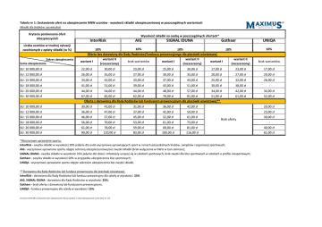 Tabela nr 1: Zestawienie ofert na ubezpieczenie NNW uczniów - wysokość składki ubezpieczeniowej w poszczególnych wariantach Składki dla żłobków i przedszkoli Kryteria porównania ofert Ubezpieczycieli Liczba uczniów w trudnej sytuacji zwolnionych z opłaty składki (w %) Zakres ubezpieczenia Suma ubezpieczenia Wysokość składki na osobę w poszczególnych ofertach* InterRisk AIG SIGNAL IDUNA Gothaer 10% 10% 10% 10% Oferta bez darowizny dla Rady Rodziców/funduszu prewencyjnego dla placówki oświatowej wariant II wariant II wariant II wariant I brak wariantów wariant I wariant I (rozszerzony) (rozszerzony) (rozszerzony) UNIQA 10% brak wariantów SU: 10 000,00 zł 22,00 zł 30,00 zł 23,00 zł 25,00 zł 30,00 zł 17,00 zł 23,00 zł 17,00 zł SU: 12 000,00 zł 26,00 zł 35,00 zł 27,00 zł 30,00 zł 35,00 zł 20,00 zł 27,00 zł 20,00 zł SU: 15 000,00 zł 33,00 zł 42,00 zł 33,00 zł 37,00 zł 43,00 zł 25,00 zł 32,00 zł 26,00 zł SU: 18 000,00 zł 41,00 zł 51,00 zł 39,00 zł 43,00 zł 51,00 zł 30,00 zł 38,00 zł - SU: 20 000,00 zł 44,00 zł 54,00 zł 44,00 zł 48,00 zł 57,00 zł 34,00 zł 42,00 zł 34,00 zł SU: 30 000,00 zł 67,00 zł 82,00 zł 62,00 zł 70,00 zł 81,00 zł 51,00 zł Oferta z darowizną dla Rady Rodziców lub funduszem prewencyjnym dla placówki oświatowej** 61,00 zł 52,00 zł SU: 10 000,00 zł 30,00 zł 41,00 zł 31,00 zł 36,00 zł 42,00 zł 20,00 zł SU: 12 000,00 zł 36,00 zł 47,00 zł 37,00 zł 42,00 zł 50,00 zł 23,00 zł SU: 15 000,00 zł 46,00 zł 57,00 zł 45,00 zł 52,00 zł 61,00 zł SU: 18 000,00 zł 56,00 zł 70,00 zł 53,00 zł 61,00 zł 73,00 zł - SU: 20 000,00 zł SU: 30 000,00 zł 61,00 zł 90,00 zł 78,00 zł 110,00 zł 59,00 zł 83,00 zł 68,00 zł 100,00 zł 81,00 zł 116,00 zł 40,00 zł 61,00 zł Brak oferty *Wyczynowe uprawianie sportu: InterRisk - zwyżka składki w wysokości 20% jedynie dla osób wyczynowo uprawiających sport w ramach pozaszkolnych klubów, związków i organizacji sportowych; AIG - wyczynowe uprawianie sportu objęte ochroną ubezpieczeniową bez zwyżki składki (brak wyłączenia w OWU w tym zakresie); SIGNAL IDUNA - zwyżka składki w wysokości 25% jedynie dla dzieci i młodzieży uczącej się w szkołach sportowych, brak zwyżki dla klas sportowych w szkołach o profilu niesportowym; Gothaer - zwyżka składki w wysokości 50% w przypadku ubezpieczenia klas sportowych; UNIQA - wyczynowe uprawianie sportu objęte zakresem ubezpieczenia bez zwyżki składki. **Darowizna dla Rady Rodziców lub fundusz prewencyjny dla placówki oświatowej InterRisk - darowizna dla Rady Rodziców lub fundusz prewencyjny dla szkoły w wysokości 25% AIG, SIGNAL IDUNA - darowizna dla Rady Rodziców w wysokości 25%; Gothaer - brak oferty z darowizną lub funduszem prewencyjnym; UNIQA - fundusz prewencyjny dla szkoły w wysokości 15%. Formularz F4/PS B8/1; Zestawienie ofert ubezpieczycieli; Wersja wydania: 3, Data obowiązywania: 23.07.2015; str. 1/4 30,00 zł Tabela nr 2: Porównanie wysokości wybranych świadczeń przy różnych sumach ubezpieczenia Świadczenie InterRisk AIG SIGNAL IDUNA SUMA UBEZPIECZENIA: 12 000 zł śmierć ubezpieczonego 12 000 zł 17 000 zł 12 000 zł śmierć w wyniku wypadku komunikacyjnego 18 000 zł 22 000 zł 18 000 zł śmierć na terenie placówki oświatowej 18 000 zł 22 000 zł 100% uszczerbku na zdrowiu 12 000 zł od 12 000 zł do 24 000 zł 12 000 zł UNIQA 12 000 zł 12 000 zł 12 000 zł (w. I) 18 000 zł (w. II) 12 000 zł 24 000 zł 12 000 zł 12 600 zł 12 000 zł 120 zł za 1% uszczerbku trwały uszczerbek na zdrowiu oparzenie III stopnia 12 000 zł (w. I) 18 000 zł (w. II) Gothaer od 480 zł do 6000 zł od 400 zł do 2000 zł od 480 zł do 2400 zł od 240 zł do 3000 zł w zależności od w zależności od w zależności od w zależności od powierzchni ciała powierzchni ciała powierzchni ciała powierzchni ciała od 120 zł do 3600 zł w zależności od powierzchni i części ciała zdiagnozowanie sepsy 1 200 zł - 1 000 zł - 1 200 zł śmierć rodzica (opiekuna) ubezpieczonego 1 200 zł 1 200 zł 1 200 zł (w. II) 3 000 zł (w. II) - zwrot kosztów leczenia do 1 200 zł do 1 200 zł do 1 000 zł do 1 200 zł (w. II) do 3 600 zł za wstrząśnienie mózgu od 120 zł do 600 zł w zależności od długości pobytu w szpitalu 200 zł poważne zachorowanie 2400 zł (w. II) 3 000 zł - - - pobyt w szpitalu w wyniku NNW 20 zł za dzień (w. I) 40 zł za dzień (w. II) 25 zł za dzień 20 zł za dzień (w. I) 40 zł za dzień (w. II) 40 zł za dzień (w. II) - okaleczenie lub oszpecenie twarzy (rany twarzy) od 120 zł do 3000 zł od 1000 zł (w. II) do 2000 zł SUMA UBEZPIECZENIA: 20 000 zł od 240 zł do 360 zł od 120 zł do 1 200 zł 20 000 zł 20 000 zł (w. I) 30 000 zł (w. II) 20 000 zł śmierć ubezpieczonego śmierć w wyniku wypadku komunikacyjnego śmierć na terenie placówki oświatowej 100% uszczerbku na zdrowiu 20 000 zł 25 000 zł 20 000 zł 30 000 zł 30 000 zł 30 000 zł 30 000 zł 30 000 zł 20 000 zł (w. I) 30 000 zł (w. II) 40 000 zł 20 000 zł 20 000 zł 21 000 zł 20 000 zł 20 000 zł od 20 000 zł do 40 000 zł zdiagnozowanie sepsy śmierć rodzica (opiekuna) ubezpieczonego zwrot kosztów leczenia za wstrząśnienie mózgu poważne zachorowanie pobyt w szpitalu w wyniku NNW okaleczenie lub oszpecenie twarzy (rany twarzy) 20 000 zł 200 zł za 1% uszczerbku trwały uszczerbek na zdrowiu oparzenie III stopnia od 120 zł do 360 zł w od 120 zł do 360 zł w od 120 zł do 1200 zł zależności od zależności od w zależności od długości pobytu w długości pobytu w pobytu w szpitalu szpitalu szpitalu 2 000 zł - 1 000 zł - od 200 zł do 6000 zł w zależności od powierzchni i części ciała 2 000 zł 2 000 zł 2 000 zł 2 000 zł (w. II) 3 000 zł (w. II) - do 2 000 zł od 200 zł do 1000 zł w zależności od długości pobytu w szpitalu 4000 zł (w. II) 20 zł za dzień (w. I) 40 zł za dzień (w. II) od 200 zł do 5000 zł (w. II) do 2