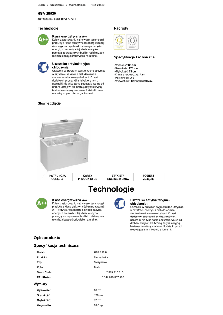 BEKO › Chłodzenie › Wolnostojące › HSA 29530 HSA 29530 Zamrażarka, kolor BIAŁY, A++ Technologie Nagrody Klasa energetyczna A++: Dzięki zastosowaniu najnowszej technologii produkty z klasą efektywności energetycznej A++ to gwarancja bardzo niskiego zużycia energii, a produkty w tej klasie nie tylko pomogą podreperować budżet rodzinny, ale również dbają o środowisko naturalne. Specyfikacja Techniczna Uszczelka antybakteryjna chłodzenie: › Wysokość: 86 cm › Szerokość: 128 cm › Głębokość: 72 cm › Klasa energetyczna: A++ › Pojemność: 288 › Wyświetlacz: Bez wyświetlacza Uszczelki w drzwiach zwykle trudno utrzymać w czystości, co czyni z nich doskonałe środowisko dla rozwoju bakterii. Dzięki dodatkowi substancji antybakteryjnych, uszczelki nie tylko same pozostają wolne od drobnoustrojów, ale tworzą antybakteryjną barierę chroniącą wnętrze chłodziarki przed niepożądanymi mikroorganizmami. Główne zdjęcie INSTRUKCJA OBSŁUGI KARTA PRODUKTU UE ETYKIETA ENERGETYCZNA POBIERZ ZDJĘCIE Technologie Klasa energetyczna A++: Uszczelka antybakteryjna chłodzenie: Dzięki zastosowaniu najnowszej technologii produkty z klasą efektywności energetycznej A++ to gwarancja bardzo niskiego zużycia energii, a produkty w tej klasie nie tylko pomogą podreperować budżet rodzinny, ale również dbają o środowisko naturalne. Uszczelki w drzwiach zwykle trudno utrzymać w czystości, co czyni z nich doskonałe środowisko dla rozwoju bakterii. Dzięki dodatkowi substancji antybakteryjnych, uszczelki nie tylko same pozostają wolne od drobnoustrojów, ale tworzą antybakteryjną barierę chroniącą wnętrze chłodziarki przed niepożądanymi mikroorganizmami. Opis produktu Specyfikacja techniczna Model: HSA 29530 Produkt: Zamrażarka Typ: Skrzyniowa Kolor: Biały Stock Code: 7 509 820 010 EAN Code: 5 944 008 907 860 Wymiary Wysokość: 86 cm Szerokość: 128 cm Głębokość: 72 cm Waga netto: 50,0 kg Pojemność Pojemność całkowita brutto: 288 l Pojemność chłodziarki netto: -l Pojemność zamrażarki netto: 284 l Parametry Klasa efektywności energetycznej: A++ Zużycie energii na dobę (kWh): 0,569 kWh Zużycie energii na rok (kWh): 208 kWh Zdolność zamrażania: 17 kg / 24godz. Czas przechowywania bez zasilania: 67 godz. Sterowanie: Mechaniczne System chłodzenia: Statyczny Czynnik chłodniczy: R600a Poziom hałasu [dB(A)]: 43 dB(A) Specyfikacja Możliwość przełożenia drzwi: Nie Wyświetlacz elektroniczny: Diody LED Alarm otwartych drzwi: Nie Dozownik wody: Nie Mini bar: Nie Specyfikacja - Chłodziarka Oświetlenie wnętrza: Standardowe Komora 0°C: Nie Filtr antyzapachowy: Nie Aktywny jonizator: Nie Uszczelka antybakteryjna: Tak Niebieskie światło (Active Fresh Blue Light): Nie Pojemnik na warzywa i owoce: Nie Półki: Nie Uchwyt na butelkę: Nie Chromowana półka na butelki: Nie Półki na drzwiach: Nie Easy Boxes: Nie Pojemnik na nabiał: Nie Tacka na jajka: Nie Rozmrażanie: Nie Specyfikacja - Zamrażarka Liczba pełnych szuflad: Nie Liczba komór: 3 kosze Kostki lodu: Nie Komora Multi-Zone: Nie Rozmrażanie: Ręczne Komora szybkiego mrożenia: Nie Informacje produktowe zawarte na stronie internetowej mają charakter poglądowy i mogą odbiegać od rzeczywistości | Informacje o plikach cookies projekt i realizacja 4 All Multimedia