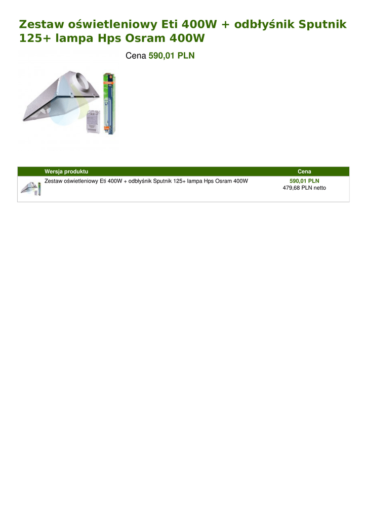 Zestaw oświetleniowy Eti 400W + odbłyśnik Sputnik 125+ lampa Hps Osram 400W Cena 590,01 PLN Wersja produktu Zestaw oświetleniowy Eti 400W + odbłyśnik Sputnik 125+ lampa Hps Osram 400W Powered by TCPDF (www.tcpdf.org) Cena 590,01 PLN 479,68 PLN netto