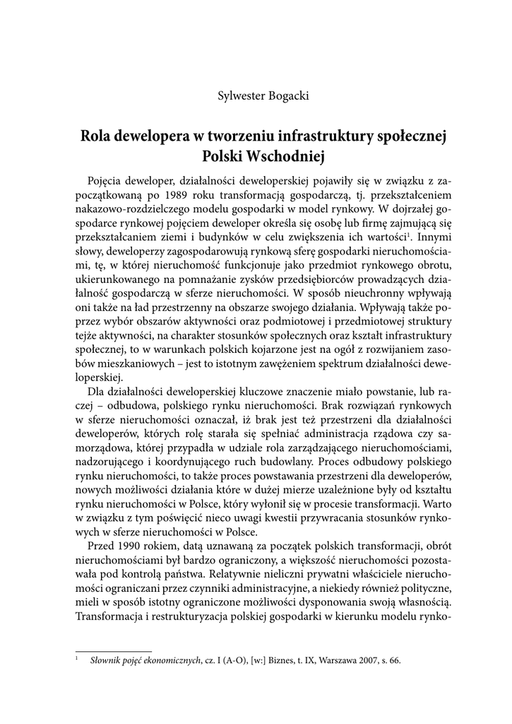 Sylwester Bogacki Rola dewelopera w tworzeniu infrastruktury społecznej Polski Wschodniej Pojęcia deweloper, działalności deweloperskiej pojawiły się w związku z zapoczątkowaną po 1989 roku transformacją gospodarczą, tj. przekształceniem nakazowo-rozdzielczego modelu gospodarki w model rynkowy. W dojrzałej gospodarce rynkowej pojęciem deweloper określa się osobę lub firmę zajmującą się przekształcaniem ziemi i budynków w celu zwiększenia ich wartości1. Innymi słowy, deweloperzy zagospodarowują rynkową sferę gospodarki nieruchomościami, tę, w której nieruchomość funkcjonuje jako przedmiot rynkowego obrotu, ukierunkowanego na pomnażanie zysków przedsiębiorców prowadzących działalność gospodarczą w sferze nieruchomości. W sposób nieuchronny wpływają oni także na ład przestrzenny na obszarze swojego działania. Wpływają także poprzez wybór obszarów aktywności oraz podmiotowej i przedmiotowej struktury tejże aktywności, na charakter stosunków społecznych oraz kształt infrastruktury społecznej, to w warunkach polskich kojarzone jest na ogół z rozwijaniem zasobów mieszkaniowych – jest to istotnym zawężeniem spektrum działalności deweloperskiej. Dla działalności deweloperskiej kluczowe znaczenie miało powstanie, lub raczej – odbudowa, polskiego rynku nieruchomości. Brak rozwiązań rynkowych w sferze nieruchomości oznaczał, iż brak jest też przestrzeni dla działalności deweloperów, których rolę starała się spełniać administracja rządowa czy samorządowa, której przypadła w udziale rola zarządzającego nieruchomościami, nadzorującego i koordynującego ruch budowlany. Proces odbudowy polskiego rynku nieruchomości, to także proces powstawania przestrzeni dla deweloperów, nowych możliwości działania które w dużej mierze uzależnione były od kształtu rynku nieruchomości w Polsce, który wyłonił się w procesie transformacji. Warto w związku z tym poświęcić nieco uwagi kwestii przywracania stosunków rynkowych w sferze nieruchomości w Polsce. Przed 1990 rokiem, datą uznawaną za początek polskich transformacji, obrót nieruchomościami był bardzo ograniczony, a większość nieruchomości pozostawała pod kontrolą państwa. Relatywnie nieliczni prywatni właściciele nieruchomości ograniczani przez czynniki administracyjne, a niekiedy również polityczne, mieli w sposób istotny ograniczone możliwości dysponowania swoją własnością. Transformacja i restrukturyzacja polskiej gospodarki w kierunku modelu rynko- 1 Słownik pojęć ekonomicznych, cz. I (A-O), [w:] Biznes, t. IX, Warszawa 2007, s. 66. 100 Sylwester Bogacki wego przejawiała się w sferze obrotu nieruchomości następującymi charakterystycznymi zjawiskami2: • przywracanie właścicielom nieruchomości, zwłaszcza budynków mieszkalnych, prawa decydowania o swojej własności (możliwość samodzielnego podpisywania umów najmu z lokatorami wprowadzonymi do lokalu mieszkalnego przez organy państwa); • zmiany w prawie ukierunkowane na budowanie stosunków rynkowych w obrocie nieruchomościami; • rozwój segmentu nieruchomości jako źródła zysku dla ich właścicieli; • pojawienie się oraz rozwój ilościowy i jakościowy profesjonalnych kadr z zakresu rynkowego obrotu nieruchomościami; • pojawienie się i szybki rozwój segmentu nieruchomości komercyjnych oraz inwestorów lokujących swój kapitał w zakup gruntów i wznoszenie obiektów na wynajem. Odrębnie należy wskazać na kwestię stopniowego, nie pozbawionego trudności i kontrowersji politycznych, otwierania się rozwijającego się polskiego rynku nieruchomości na świat zewnętrzny. W okresie PRL-u możliwości udziału w obrocie nieruchomościami na terenie Polski, wyjąwszy przypadki związane z potrzebami wynikającymi z utrzymywania przez Polskę stosunków dyplomatycznych lub konsularnych z innymi krajami oraz współpracy z organizacjami międzynarodowymi, podmiotów zagranicznych był praktycznie wykluczony. Regulująca formalnie tę kwestię ustawa z 24 marca 1920 roku o nabywaniu nieruchomości przez cudzoziemców (dalej CudzNierU)3, chociaż nigdy nie uchylona, przez cały okres istnienia PRL-u była martwym prawem. Przełomowe dla rozpatrywanej kwestii znaczenie miała ustawa z dnia 23 grudnia 1988 roku o działalności gospodarczej z udziałem podmiotów zagranicznych (dalej GospZagrU)4, będącej jednym ze zwiastunów odchodzenia od modelu gospodarki nakazowo-rozdzielczej, dopuszczającej za zezwoleniem Państwowej Agencji Inwestycji Zagranicznych, powołanej przepisami tej ustawy, tworzenia spółek z wyłącznym udziałem podmiotów zagranicznych, tj. z udziałem osób fizycznych lub prawnych mających swoją siedzibę za granicą, albo też nie posiadających osobowości prawnej spółek osób prawnych mających siedzibę za granicą5. Ustawa wprowadzała możliwość zbywania spółkom tworzonym na jej podstawie środki trwałe i ustanawianie na nich pełnych i ograniczonych praw rzeczowych6. Co najistotniejsze dla rozpatrywanej problematyki, GospZagrU po raz pierwszy L. Henclewska, Zarządcy nieruchomości w Polsce, <http://www.irempolska.org.pl/2003-09. php>. 3 Dz.U. z 1920 r., nr 31, poz. 178. 4 Ustawa z dnia 23 grudnia 1988 roku o działalności gospodarczej z udziałem podmiotów zagranicznych, ust. 5, Dz.U. z 1989 roku, nr 41 poz. 324. 5 GospZagrU, art.2 i 3 ust. 2. 6 GospZagrU, art. 25-26 i art. 46, pkt. 1. 2 Rola dewelopera w tworzeniu infrastruktury społecznej... 101 od początku PRL-u odwoływała się do CudzNierU, aktu prawnego będącego wytworem stosunków rynkowych w gospodarce, dokonując przy tym jej nowelizacji. GospZagrU definiowała również cudzoziemca, jako ewentualnego partnera transakcji w obrocie nieruchomościami, dopuszczając do udziału w tym obrocie cudzoziemców spełniających ustawowe kryteria7. Ustawa nie dawała cudzoziemcom zdefiniowanym, tak jak powyżej, pełnej swobody nabywania nieru