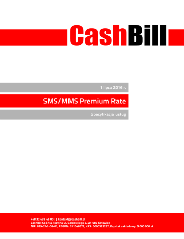 1 lipca 2016 r. SMS/MMS Premium Rate Specyfikacja usług +48 32 438 45 00 || [email protected] CashBill Spółka Akcyjna ul. Sobieskiego 2, 40-082 Katowice NIP: 629-241-08-01, REGON: 241048572, KRS: 0000323297, Kapitał zakładowy: 5 000 000 zł SMS/MMS Premium Rate Spis treści 1 O CashBill......................................................................................................................................... 3 2 SMS/MMS Premium Rate.............................................................................................................. 4 2.1 SMS MO – Mobile Originated.......................................................................................................................4 2.2 MMS MO – Mobile Originated......................................................................................................................4 2.3 SMS MT – Mobile Terminated......................................................................................................................5 2.4 SMS marketingowy.......................................................................................................................................5 2.5 SMS z numeru Premium Rate.....................................................................................................................6 3 Proces realizacji usług.................................................................................................................... 6 3.1 SMS/MMS Premium Rate............................................................................................................................6 4 Rozliczenia....................................................................................................................................... 6 5 Dokumentacje................................................................................................................................. 6 6 Kontakt............................................................................................................................................ 7 2 SMS/MMS Premium Rate 1 O CashBill CashBill S.A. świadczy usługi SMS/MMS Premium Rate, utrzymując jedną z czołowych pozycji na rynku. Stały monitoring systemu oraz całodobowy nadzór techniczny daje gwarancję prawidłowego działania usług 24 godziny na dobę. Od 2013 roku CashBill S.A. działa jako Krajowa Instytucja Płatnicza pod nadzorem KNF, natomiast już 4 lata wcześniej spółka została Agentem Rozliczeniowym pod nadzorem NBP. Jej kapitał zakładowy wynosi 5 000 000 PLN. W związku z powyższym, bezpieczeństwo i stabilność współpracy są gwarantem jakości, charakteryzującym współpracę z CashBill S.A. Elastyczność finansowa szybkie terminy wypłat (nawet do jednego dnia roboczego) rozliczenie środków w cyklu comiesięcznym Relacje z Partnerem sukcesywnie staramy się uatrakcyjniać warunki współpracy, poprzez np. renegocjację stawek doceniamy wartość kontaktu bezpośredniego wspieramy wdrażanie nowych rozwiązań i usług, zarówno od strony technicznej, jak i formalnej jesteśmy otwarci na wszelkie sugestie i propozycje, mające na celu ulepszanie usług firmy CashBill jak i indywidualnej współpracy z Partnerem 3 SMS/MMS Premium Rate 2 SMS/MMS Premium Rate Usługi SMS i MMS pozwalają zarówno na natychmiastowy kontakt z użytkownikiem, jak również na pobieranie opłat. Jest to idealne rozwiązanie dla Akceptanta, pozwalające na interakcję z użytkownikami. Opłaty za usługi SMS/MMS o podwyższonej wartości są doliczane do rachunku telefonicznego abonenta. Z usług SMS i MMS można skorzystać we wszystkich sieciach na terenie Polski, zarówno MNO jak i MVNO. Obsługiwane są wszystkie modele telefonów, dzięki czemu z usług SMS i MMS mogą korzystać wszyscy użytkownicy. Uniwersalność prezentowanych świadczeń daje naprawdę szerokie możliwości wykorzystania ich w różnorodnych projektach. 2.1 SMS MO – Mobile Originated Usługi z rodzaju SMS MO należą do grupy usług SMS Premium Rate. Najczęściej są wykorzystywane w serwisach z odpłatnymi zasobami, w sondażach i ankietach, w newsletterach, w usługach autoryzacji lub w konkursach i loteriach. Opłaty za usługi Premium Rate są doliczane do rachunku abonenta telefonii komórkowej, przy czym abonent jest obciążany za każdą wysłaną wiadomość. 2.2 MMS MO – Mobile Originated Oferowane przez CashBill usługi MMS umożliwiają przesyłanie wiadomości multimedialnych (z tekstową, graficzną, animowaną, dźwiękową lub filmową zawartością) przez użytkowników serwisu za pośrednictwem wiadomości Premium Rate. Wiadomości mogą być przekazywane bezpośrednio do infrastruktury serwisu lub wysyłane na wskazany adres e-mail. Wiadomości MMS znajdują szerokie zastosowanie przy organizacji konkursów (np. wybór najlepszego zdjęcia) lub przy tworzeniu cyfrowych pamiętników (np. z wycieczki lub z imprezy). 4 SMS/MMS Premium Rate 2.3 SMS MT – Mobile Terminated Użytkownik zapisuje się do subskrypcji wiadomością inicjującą o określonej treści (lub poprzez wpisanie własnego numeru w wyznaczonym miejscu w serwisie, a następnie postępowanie zgodnie z instrukcjami, zawartymi w wiadomości powitalnej) , której koszt wynosi równowartość wiadomości SMS według cennika operatora. Subskrypcja prowadzona jest w sposób polegający na tym, iż użytkownik otrzymuje wiadomości, za które pobierana jest opłata (zależna od taryfy wiadomości). Częstotliwość wysyłanych wiadomości subskrypcyjnych ograniczona jest limitem ze strony operatorów, wynoszącym wysyłanie maksymalnie jednej wiadomości dziennie. 2.4 SMS marketingowy SMS marketingowy umożliwia rozsyłanie wiadomości tekstowych do użytkowników, którzy nie korzystali z konkretnych usług SMS Premium Rate. W tej usłudze istnieje możliwość wysyłania wiadomości do całej bazy posiadanych numerów telefonu bądź do pojedynczych numerów. Usługa ta pozwal