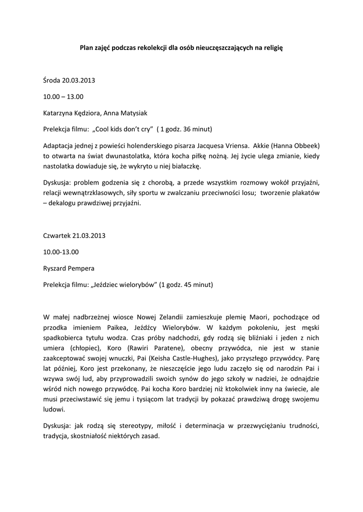 Plan zajęd podczas rekolekcji dla osób nieuczęszczających na religię Środa 20.03.2013 10.00 – 13.00 Katarzyna Kędziora, Anna Matysiak Prelekcja filmu: „Cool kids don’t cry” ( 1 godz. 36 minut) Adaptacja jednej z powieści holenderskiego pisarza Jacquesa Vriensa. Akkie (Hanna Obbeek) to otwarta na świat dwunastolatka, która kocha piłkę nożną. Jej życie ulega zmianie, kiedy nastolatka dowiaduje się, że wykryto u niej białaczkę. Dyskusja: problem godzenia się z chorobą, a przede wszystkim rozmowy wokół przyjaźni, relacji wewnątrzklasowych, siły sportu w zwalczaniu przeciwności losu; tworzenie plakatów – dekalogu prawdziwej przyjaźni. Czwartek 21.03.2013 10.00-13.00 Ryszard Pempera Prelekcja filmu: „Jeździec wielorybów” (1 godz. 45 minut) W małej nadbrzeżnej wiosce Nowej Zelandii zamieszkuje plemię Maori, pochodzące od przodka imieniem Paikea, Jeźdźcy Wielorybów. W każdym pokoleniu, jest męski spadkobierca tytułu wodza. Czas próby nadchodzi, gdy rodzą się bliźniaki i jeden z nich umiera (chłopiec), Koro (Rawiri Paratene), obecny przywódca, nie jest w stanie zaakceptowad swojej wnuczki, Pai (Keisha Castle-Hughes), jako przyszłego przywódcy. Parę lat później, Koro jest przekonany, że nieszczęście jego ludu zaczęło się od narodzin Pai i wzywa swój lud, aby przyprowadzili swoich synów do jego szkoły w nadziei, że odnajdzie wśród nich nowego przywódcę. Pai kocha Koro bardziej niż ktokolwiek inny na świecie, ale musi przeciwstawid się jemu i tysiącom lat tradycji by pokazad prawdziwą drogę swojemu ludowi. Dyskusja: jak rodzą się stereotypy, miłośd i determinacja w przezwyciężaniu trudności, tradycja, skostniałośd niektórych zasad. Piątek 22.03.2013 10.00 – 13.00 Katarzyna Kędziora, Anna Matysiak Prelekcja filmu: „Jak zostad królem?” ( 1 godz. 58 minut) Fascynująca opowieśd o człowieku, który uratował królestwo i w przełomowym momencie historii mężnie poprowadził Anglików w walce przeciwko najeźdźcy. Po szokującej abdykacji Edwarda VIII książę Albert musi, mimo wielkich oporów, zasiąśd na tronie Anglii jako Jerzy VI. Ogromną przeszkodą w wypełnianiu monarszych obowiązków jest dla niego... problem z wysławianiem się. Jedyną osobą, która może pomóc Jerzemu w odnalezieniu własnego głosu i stawieniu czoła groźbie inwazji hitlerowskiej, okazuje się australijski specjalista o wielce nieortodoksyjnych metodach pracy nad wymową. Wkrótce rodzi się przyjaźo, która odmieni życie dwóch niezwykłych ludzi i zadecyduje o losach największej z wojen. Dyskusja: wiara w siebie, szukanie swoich mocnych stron, walka z kompleksami, elementy autocoachingu, zajęcia warsztatowe – wypisywanie swoich mocnych stron i pomysłów jak je rozwijad. Wszystkie filmy wybrane zostały zarówno dla szkoły podstawowej jak i gimnazjum. Poruszają one ważne dla młodych ludzi problemy i skłaniają do dyskusji. W razie większego zainteresowania, dysponujemy również filmem „Sala samobójców” (tylko dla gimnazjum); „Nad życie” (film o Agacie Mróz) oraz „Prawo ojca”.