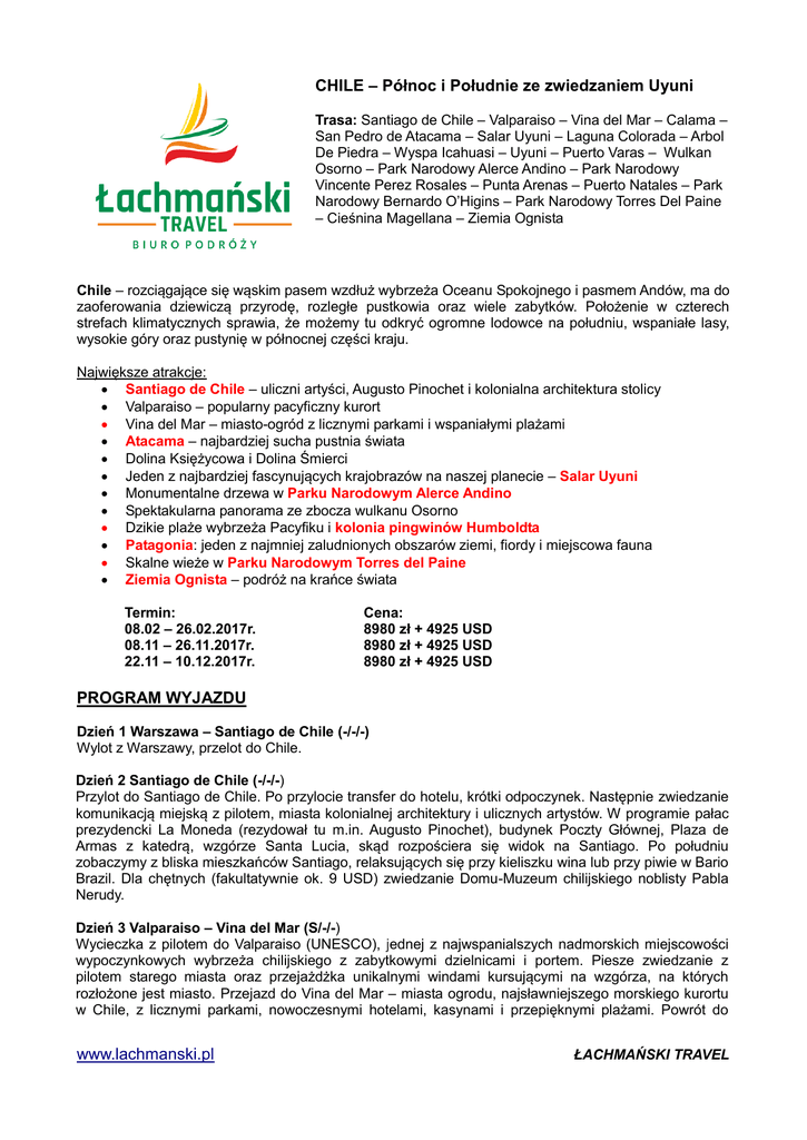 CHILE – Północ i Południe ze zwiedzaniem Uyuni Trasa: Santiago de Chile – Valparaiso – Vina del Mar – Calama – San Pedro de Atacama – Salar Uyuni – Laguna Colorada – Arbol De Piedra – Wyspa Icahuasi – Uyuni – Puerto Varas – Wulkan Osorno – Park Narodowy Alerce Andino – Park Narodowy Vincente Perez Rosales – Punta Arenas – Puerto Natales – Park Narodowy Bernardo O’Higins – Park Narodowy Torres Del Paine – Cieśnina Magellana – Ziemia Ognista Chile – rozciągające się wąskim pasem wzdłuż wybrzeża Oceanu Spokojnego i pasmem Andów, ma do zaoferowania dziewiczą przyrodę, rozległe pustkowia oraz wiele zabytków. Położenie w czterech strefach klimatycznych sprawia, że możemy tu odkryć ogromne lodowce na południu, wspaniałe lasy, wysokie góry oraz pustynię w północnej części kraju. Największe atrakcje: Santiago de Chile – uliczni artyści, Augusto Pinochet i kolonialna architektura stolicy Valparaiso – popularny pacyficzny kurort Vina del Mar – miasto-ogród z licznymi parkami i wspaniałymi plażami Atacama – najbardziej sucha pustnia świata Dolina Księżycowa i Dolina Śmierci Jeden z najbardziej fascynujących krajobrazów na naszej planecie – Salar Uyuni Monumentalne drzewa w Parku Narodowym Alerce Andino Spektakularna panorama ze zbocza wulkanu Osorno Dzikie plaże wybrzeża Pacyfiku i kolonia pingwinów Humboldta Patagonia: jeden z najmniej zaludnionych obszarów ziemi, fiordy i miejscowa fauna Skalne wieże w Parku Narodowym Torres del Paine Ziemia Ognista – podróż na krańce świata Termin: 08.02 – 26.02.2017r. 08.11 – 26.11.2017r. 22.11 – 10.12.2017r. Cena: 8980 zł + 4925 USD 8980 zł + 4925 USD 8980 zł + 4925 USD PROGRAM WYJAZDU Dzień 1 Warszawa – Santiago de Chile (-/-/-) Wylot z Warszawy, przelot do Chile. Dzień 2 Santiago de Chile (-/-/-) Przylot do Santiago de Chile. Po przylocie transfer do hotelu, krótki odpoczynek. Następnie zwiedzanie komunikacją miejską z pilotem, miasta kolonialnej architektury i ulicznych artystów. W programie pałac prezydencki La Moneda (rezydował tu m.in. Augusto Pinochet), budynek Poczty Głównej, Plaza de Armas z katedrą, wzgórze Santa Lucia, skąd rozpościera się widok na Santiago. Po południu zobaczymy z bliska mieszkańców Santiago, relaksujących się przy kieliszku wina lub przy piwie w Bario Brazil. Dla chętnych (fakultatywnie ok. 9 USD) zwiedzanie Domu-Muzeum chilijskiego noblisty Pabla Nerudy. Dzień 3 Valparaiso – Vina del Mar (S/-/-) Wycieczka z pilotem do Valparaiso (UNESCO), jednej z najwspanialszych nadmorskich miejscowości wypoczynkowych wybrzeża chilijskiego z zabytkowymi dzielnicami i portem. Piesze zwiedzanie z pilotem starego miasta oraz przejażdżka unikalnymi windami kursującymi na wzgórza, na których rozłożone jest miasto. Przejazd do Vina del Mar – miasta ogrodu, najsławniejszego morskiego kurortu w Chile, z licznymi parkami, nowoczesnymi hotelami, kasynami i przepięknymi plażami. Powrót do www.lachmanski.pl ŁACHMAŃSKI TRAVEL Santiago de Chile. Dzień 4 Calama – San Pedro de Atacama (S/-/-) Po śniadaniu przejazd na lotnisko i przelot Calama, położonego w regionie najbardziej suchej pustyni świata. Po przylocie przejazd w kierunku w San Pedro de Atacama przez Kordylierę Solną (Cordillera de la Sal) zbudowaną z piasku przemieszanego z solą, całkowicie pozbawioną życia (nie ma tu nawet owadów!). Dzień 5 Lagunas Altiplanicas (S/L/-) Wyjazd w stronę Salar de Tara. Podczas wycieczki zobaczymy niesamowite formacje skalne mieniące się cała ferią barw. Zatrzymamy się nad rzeką Quepiaco i zobaczymy lagune Diamente. Powrót do San Pedro de Atacama, krótki odpoczynek. Popołudniu wyjazd na jedne z najbardziej spektakularnych miejsc na pustyni Atacama. Zobaczymy Dolinę Księżycową oraz Dolinę Śmierci. Tamtejsze formacje skalne zostały wyrzeźbione przez wiatr, słońce i trzęsienia ziemi. Późnym popołudniem niezwykły spektakl, jaki daje zachodzące słońce, które złoci piaszczyste wydmy, kładzie się różowoczerwoną poświatą na nagich skałach i rozświetla stożki wulkanów. Światło barwi przyrodę na niesamowite kolory. Nocleg w San Pedro de Atacama. Dzień 6 Salar Uyuni (S/L/K) Rano wyjazd w kierunku granicy. Przekroczenie granicy Chile z Boliwią na andyjskiej przełęczy Portezuelo del Cajón na wysokości 4480 m n.p.m.i rozpoczynamy podróż przez jedno z najbardziej fascynujących krajobrazowo miejsc na świecie – Salar Uyuni. Na początek czeka nas poranek z gejzerem o nazwie „Sol de manana”, Laguna Verde i kąpiel w gorących źródłach. Nocleg w schronisku z pokojami wieloosobowymi, wspólną łazienką, bez ciepłej wody (w tym miejscu to jedyna możliwość). Dzień 7 Salar Uyuni (S/L/K) Kolejny dzień pełen atrakcji, wrażeń i niezapomnianych widoków - podróż przez pustynię. Salar Uyuni to miejsce gdzie przyroda stworzyła jedne z najbardziej fantastycznych krajobrazów na Naszej Planecie Zatrzymamy się przy kamiennym drzewie Arbol de Piedra oraz w wielu miejscach gdzie natura stworzyła fantastyczne krajobrazy. Nocleg w hotelu solnym (w hotelu jest ciepła woda; pokoje 2-4 osobowe bez łazienek; koniecznie trzeba zabrać ze sobą śpiwór i ręcznik). Dzień 8 Salar Uyuni - Wyspa Incahuasi (S/L/K) Kolejny miejscem na naszej trasie będzie spektakularna wyspa na słonym jeziorze Incahuasi Zobaczymy fantastyczny krajobraz jedynego w swoim rodzaju miejsca na Naszej Planecie. Po drodze do miasteczka Uyuni odwiedzimy cmentarzysko lokomotyw. Nocleg w miasteczku Uyuni. Dzień 9 Salar Uyuni – Laguna Cejar - San Pedro de Atacama (S/-/-) Rano wyruszamy w drogę powrotną do Chile. Po drodze zobaczymy Hito Cajón. Popołudniu czas wolny. Dla chętnych, jedyne w swoim rodzaju pożegnanie z jednym z najsuchszych i najbardziej malowniczych miejsc na świecie - wyjazd na lagune Cejar Późnym popołudniem niezwykły spektakl, jaki daje zachodzące słońce, 