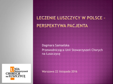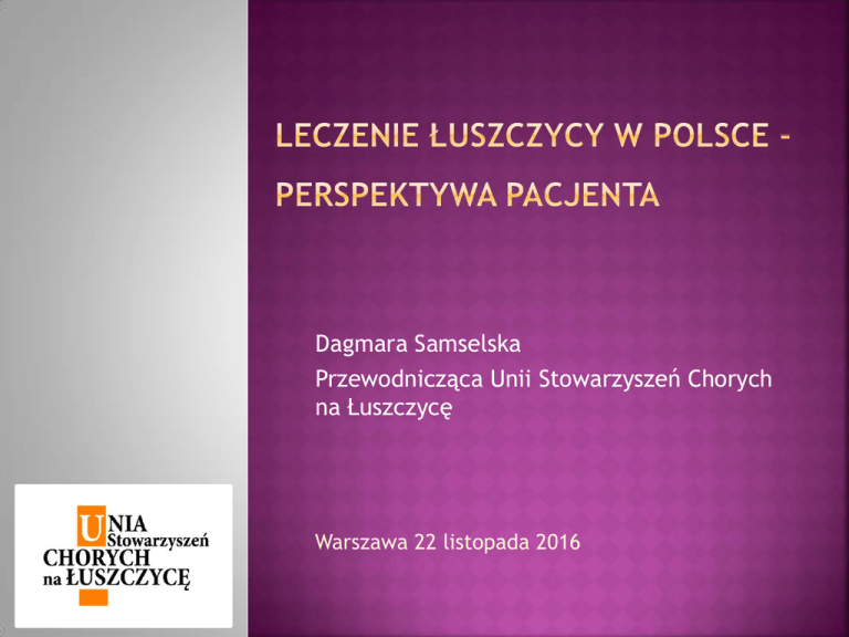 Dagmara Samselska Przewodnicząca Unii Stowarzyszeń Chorych na Łuszczycę Warszawa 22 listopada 2016 Uczestnicy debaty • Prof. Witold Owczarek • Prof. Waldemar Placek • Dr Elżbieta Kłujszo • Dr Adam Borzęcki • Dr Anna Czarnecka • Dr Ewa Ring • Jerzy Gała – Pomorskie Stowarzyszenie Chorych na Łuszczycę „FALA NADZIEI” • Janusz Jagiełło Stowarzyszenie Chorych na Łuszczycę w Lublinie Organizator Unia Stowarzyszeń Chorych na Łuszczycę 700 osób w programie, 300 w trakcie leczenia Problemy i bariery: • Relacja lekarz-pacjent • Brak zaufania do leczenia • Brak ścieżek terapeutycznych, jasnych regulacji • Słabe poruszanie się w systemie • Brak informacji, właściwego poprowadzenia pacjenta na drogę terapii • Zagubieni pacjenci • Słaba edukacja pacjentów i lekarzy • Mało ośrodków specjalizujących się w leczeniu łuszczycy • Konsensus PTD –wytyczne zbyt ogólne, zawiłe, powinny być na bieżąco dopisywane nowo rejestrowane leki Długotrwałe: 3 tyg. wprowadzenie pacjenta, >1h wprowadzanie do systemu lub wypełnienie dokumentów, oddelegowanie lekarza do obsługi pacjentów w programie. Małe środki na obsługę programu - NFZ zwraca za lek a nie za terapię. Obsługa programu przynosi straty. Dla szpitala procedura jest mało opłacalna. Kryteria włączenia są restrykcyjne. Prof. Owczarek: zespół nie kwalifikuje pacjenta medycznie, kryteria dostępu są ściśle określone. Zespół jest wykonawcą. Kryteria medyczne są szersze niż refundacyjne, a dysonans pomiędzy nimi powinien być mniejszy. kwalifikacja, długość terapii w programie powinna być jednakowa dla wszystkich – dyskryminacja . Jedni są leczeni 48 tyg inni 96 tyg. nieetyczne odstawianie leczenia to lekarz wraz z pacjentem powinien decydować o wyborze leku wg wiedzy na temat stanu zdrowia pacjenta (ryzyko wyboru tańszego zamiennika – leki biopodobne) Zamiast długotrwałej hospitalizacji - Ośrodki dziennego pobytu: kąpiele, smarowanie, naświetlanie po 1,5 h do domu, nie traci pracy - taniej, systematycznie, nawyki lecznicze Prof. Owczarek - badania pacjentów onkologicznych wykazały, że jeśli dojazd >40 min to nie korzystają z opieki skierowanie do dermatologa, POZ tylko maści sterydowe, nie chcą wystawiać skierowań Prof. Placek - za mało ośrodków w sensie terytorialnym niedoszacowane naświetlania 18 zł vs 5,8-7,1 za naświetlanie, pozostałe koszty spadają na szpital lekarze i pacjenci boją się leczenia ogólnego Grażyna (Kraków) - bardzo kiepsko, nawet na etapie diagnozy, jeśli tylko nie masz "typowej" łuszczycy. Ogólnie wszystko, czego się dowiedziałam ciekawego, to od chorych, którzy tę drogę zaczęli wcześniej. Katarzyna (Zielona Góra) - Moim zdaniem leczenia nie ma. Jest „zaleczanie''. Teraz dużo się mówi o nowych metodach biologicznych, ale nie wiem co ogranicza ich stosowanie. Lekarze albo nie zrobić. Koszmar. chcą albo nie wiedzą co z tą chorobą Jagna (Łódź) - Jako, że leczenie ma się źle, ja uczę „nie łuszczyków” łuszczycy. A lampy tak, przepisują, ale są dostępne w godzinach mojej pracy. Pozostają prywatne. Marcin (Norwegia) – Powodem mojego wyjazdu z tego kraju była chęć normalnego życia. Nie ma leczenia, nie ma tolerancji. Agata - W moim przypadku, leczenie polega na stosowaniu masy sterydów. Nie było mowy nawet o cygnolinie. Dodatkowe badania krwi czy jakieś alergie – nie byłam kierowana. O leczeniu biologicznym też ani słowa, a przez 20 lat trochę tych lekarzy zwiedziłam. Jedynie jedna lekarka kilka lat temu przepisała mi cygnolinę bo powiedziałam, że nie chcę sterydów i ona zaleczyła mi nogi. Teraz leczę się sama i szukam informacji w internecie. Dużo daje grupa. Sebastian (Białystok) - Jesteśmy chyba jedynym krajem w UE gdzie leki nie są refundowane. To powinno doskonale uświadomić nas chorych na jakim etapie jest leczenie łuszczycy PL. Zazwyczaj sterydy, sterydy i jeszcze więcej sterydów... Ręce opadają Bartosz (Piła) - osób potrzebujących leczenia biologicznego zapewne są setki... i chodzi mi tutaj głównie o osoby leczące się w mniejszych ośrodkach... Ja mieszkając w 86 tys. mieście, mającym oddział dermatologiczny dowiedziałem się o biologicznym przypadkiem i to w miejscu oddalonym o prawie 400km (w sensie od lekarza - bo na necie to z rok wcześniej)... Jeszcze większym przypadkiem na odpowiedni oddział dermatologiczny z odpowiednią wiedzą... A już cudem się zdarzyło, że lekarz ten "chciał" podjąć się zgłoszenia mnie do kwalifikacji w programie... Blanka - Pół roku nie mogą mi pomóc a brat za granicą w UK w ciągu 2 miesięcy miał czysta skórę. Okazuje się że metod, które są stosowane w Polsce, na zachodzie już od dawna się nie stosuje. Im więcej wiem, tym bardziej jestem rozżalona Polskimi metodami leczenia. Kamil (Poznań) - Tańsze jest na bank fundowanie nam L4 bo wstyd wyjść do ludzi. Utrzymywanie oddziałów dermatologicznych na, które w „sezonie” nie można się dostać, też pewnie nie należy do najtańszych. Można tylko powiedzieć "sorry taki mamy klimat". Robert (Lublin) - Powiem tak. Trzeba by zacząć od siebie. Ja - przyznaję się bez bicia przez długie lata z łuszczycą nie robiłem prawie nic. Czasem chodziłem do różnych dermatologów i niewiele z tych wizyt wynikało. Po części z winy lekarzy (nie wytłumaczyli, co i jak) i w duże mierze mojej (nie stosowałem się do zaleceń). Od jakiegoś czasu jestem pod opieką przychodni dermatologicznej. I muszę napisać, że wreszcie coś się pozytywnego dzieje. Byłem w szpitalu, wyjaśniono mi jak się smarować, zaproponowano różne terapie. Obecnie jestem na cylkosporynie. W końcu mam lekarza, który mnie naprawdę prowadzi. Zacząłem o siebie dbać. Czy to pomoże, to inna sprawa. Jestem zdeterminowany i jak dotychczas zadowolony. To, że w służbie zdrowia bida z nędzą, to już inna sprawa. Agnieszka (