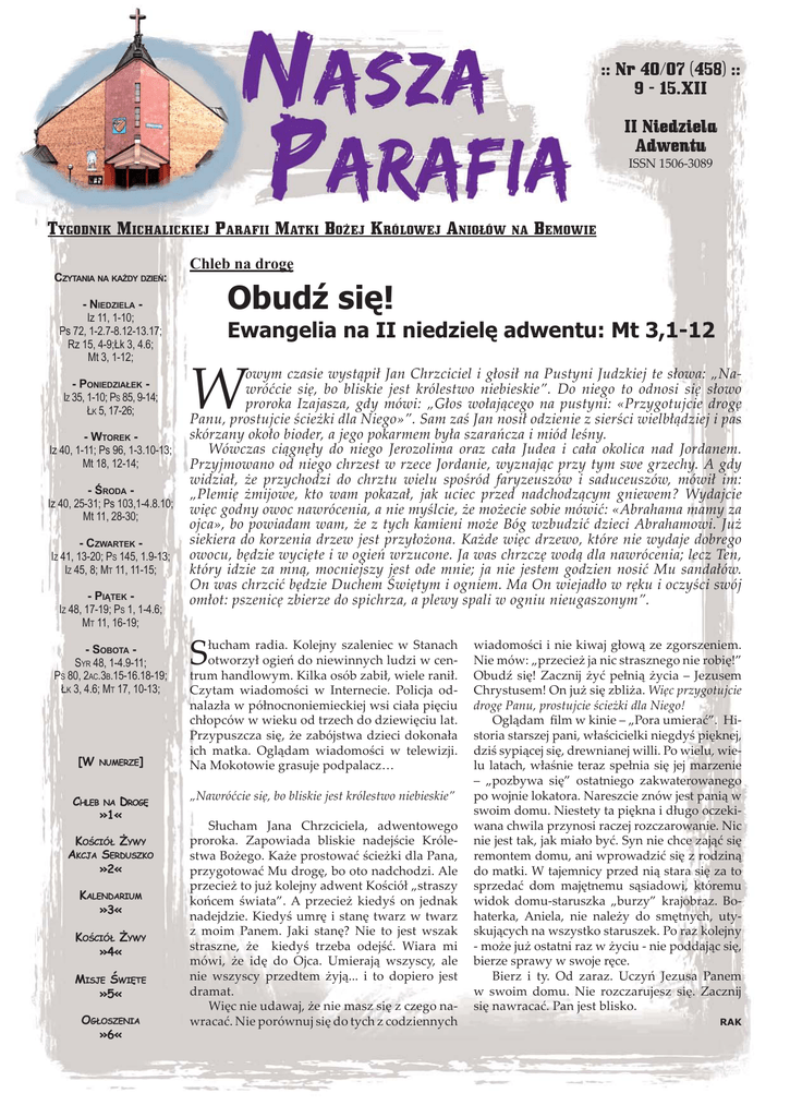 :: Nr 40/07 (458) :: 9 - 15.XII II Niedziela Adwentu ISSN 1506-3089 TYGODNIK MICHALICKIEJ PARAFII MATKI BOŻEJ KRÓLOWEJ ANIOŁÓW CZYTANIA NA KAŻDY DZIEŃ: - WTOREK Iz 40, 1-11; Ps 96, 1-3.10-13; Mt 18, 12-14; - ŚRODA Iz 40, 25-31; Ps 103,1-4.8.10; Mt 11, 28-30; - CZWARTEK IZ 41, 13-20; PS 145, 1.9-13; IZ 45, 8; MT 11, 11-15; - PIĄTEK IZ 48, 17-19; PS 1, 1-4.6; MT 11, 16-19; - SOBOTA SYR 48, 1-4.9-11; PS 80, 2AC.3B.15-16.18-19; ŁK 3, 4.6; MT 17, 10-13; [W NUMERZE] CHLEB DROGĘ »1« NA KOŚCIÓŁ ŻYWY AKCJA SERDUSZKO »2« KALENDARIUM »3« KOŚCIÓŁ ŻYWY »4« MISJE ŚWIĘTE »5« OGŁOSZENIA »6« BEMOWIE Chleb na drogę Obudź się! - NIEDZIELA Iz 11, 1-10; Ps 72, 1-2.7-8.12-13.17; Rz 15, 4-9;Łk 3, 4.6; Mt 3, 1-12; - PONIEDZIAŁEK IZ 35, 1-10; PS 85, 9-14; ŁK 5, 17-26; NA Ewangelia na II niedzielę adwentu: Mt 3,1-12 W owym czasie wystąpił Jan Chrzciciel i głosił na Pustyni Judzkiej te słowa: „Nawróćcie się, bo bliskie jest królestwo niebieskie”. Do niego to odnosi się słowo proroka Izajasza, gdy mówi: „Głos wołającego na pustyni: «Przygotujcie drogę Panu, prostujcie ścieżki dla Niego»”. Sam zaś Jan nosił odzienie z sierści wielbłądziej i pas skórzany około bioder, a jego pokarmem była szarańcza i miód leśny. Wówczas ciągnęły do niego Jerozolima oraz cała Judea i cała okolica nad Jordanem. Przyjmowano od niego chrzest w rzece Jordanie, wyznając przy tym swe grzechy. A gdy widział, że przychodzi do chrztu wielu spośród faryzeuszów i saduceuszów, mówił im: „Plemię żmijowe, kto wam pokazał, jak uciec przed nadchodzącym gniewem? Wydajcie więc godny owoc nawrócenia, a nie myślcie, że możecie sobie mówić: «Abrahama mamy za ojca», bo powiadam wam, że z tych kamieni może Bóg wzbudzić dzieci Abrahamowi. Już siekiera do korzenia drzew jest przyłożona. Każde więc drzewo, które nie wydaje dobrego owocu, będzie wycięte i w ogień wrzucone. Ja was chrzczę wodą dla nawrócenia; lecz Ten, który idzie za mną, mocniejszy jest ode mnie; ja nie jestem godzien nosić Mu sandałów. On was chrzcić będzie Duchem Świętym i ogniem. Ma On wiejadło w ręku i oczyści swój omłot: pszenicę zbierze do spichrza, a plewy spali w ogniu nieugaszonym”. S łucham radia. Kolejny szaleniec w Stanach otworzył ogień do niewinnych ludzi w centrum handlowym. Kilka osób zabił, wiele ranił. Czytam wiadomości w Internecie. Policja odnalazła w północnoniemieckiej wsi ciała pięciu chłopców w wieku od trzech do dziewięciu lat. Przypuszcza się, że zabójstwa dzieci dokonała ich matka. Oglądam wiadomości w telewizji. Na Mokotowie grasuje podpalacz… „Nawróćcie się, bo bliskie jest królestwo niebieskie” Słucham Jana Chrzciciela, adwentowego proroka. Zapowiada bliskie nadejście Królestwa Bożego. Każe prostować ścieżki dla Pana, przygotować Mu drogę, bo oto nadchodzi. Ale przecież to już kolejny adwent Kościół „straszy końcem świata”. A przecież kiedyś on jednak nadejdzie. Kiedyś umrę i stanę twarz w twarz z moim Panem. Jaki stanę? Nie to jest wszak straszne, że kiedyś trzeba odejść. Wiara mi mówi, że idę do Ojca. Umierają wszyscy, ale nie wszyscy przedtem żyją... i to dopiero jest dramat. Więc nie udawaj, że nie masz się z czego nawracać. Nie porównuj się do tych z codziennych wiadomości i nie kiwaj głową ze zgorszeniem. Nie mów: „przecież ja nic strasznego nie robię!” Obudź się! Zacznij żyć pełnią życia – Jezusem Chrystusem! On już się zbliża. Więc przygotujcie drogę Panu, prostujcie ścieżki dla Niego! Oglądam film w kinie – „Pora umierać”. Historia starszej pani, właścicielki niegdyś pięknej, dziś sypiącej się, drewnianej willi. Po wielu, wielu latach, właśnie teraz spełnia się jej marzenie – „pozbywa się” ostatniego zakwaterowanego po wojnie lokatora. Nareszcie znów jest panią w swoim domu. Niestety ta piękna i długo oczekiwana chwila przynosi raczej rozczarowanie. Nic nie jest tak, jak miało być. Syn nie chce zająć się remontem domu, ani wprowadzić się z rodziną do matki. W tajemnicy przed nią stara się za to sprzedać dom majętnemu sąsiadowi, któremu widok domu-staruszka „burzy” krajobraz. Bohaterka, Aniela, nie należy do smętnych, utyskujących na wszystko staruszek. Po raz kolejny - może już ostatni raz w życiu - nie poddając się, bierze sprawy w swoje ręce. Bierz i ty. Od zaraz. Uczyń Jezusa Panem w swoim domu. Nie rozczarujesz się. Zacznij się nawracać. Pan jest blisko. RAK Kościół Żywy Czyń, co czynisz Na nasze ludzkie szczęście, Wieczność jest przymiotem Boga i nie ma ograniczeń, przypisanych naszej słabej kondycji. Wszystkie sytuacje graniczne w życiu człowieka /śmierć, przemijający czas, wina, cierpienie, walka/ są tak szalenie ważne i zmieniają zasadniczo dotychczasowy sposób życia czy myślenia. Prowadzą do Boga. W obliczu śmierci własnej czy najbliższej osoby, nie sposób być widzem lub udawać życiowego ślepca. Trzeba stanąć z otwartymi oczyma, trzeba otworzyć własne serce. Być tu i teraz. To jest ta twórcza strona życiowych doświadczeń. Jednym słowem „Wystarczy tylko, aby dany trzeba zająć postawę człowiek żył rzeczywistością autentyczną. W postawie tej wymagane jest chwili obecnej. Age quo agis pełne zaangażowania [czyń, co czynisz] – to się człowieka, dlatego wydaje się ona trudną znaczy być całkowicie do osiągnięcia i rzadko w tym, co się robi” spotykaną. Człowiek, który pragnie sensownie żyć powinien dążyć do zajęcia właśnie takiej postawy. Osiągnąć to może przede wszystkim przez świadome traktowanie swojego życia. Świadomość przemijania musi stać się niejako nieodłącznym tłem wszelkich myśli i pragnień, powinna „tlić się” nieustannie w umyśle, aby w konsekwencji wytworzyć rodzaj naturalnej skłon- ności do skupiania uwagi na czasowych i fundamentalnych aspek