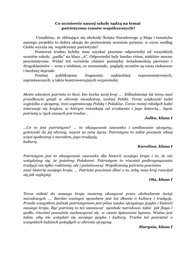 Co uczniowie naszej szkoły sądzą na temat patriotyzmu czasów współczesnych? Uznaliśmy, że zbliżające się obchody Święta Narodowego 3 Maja i tematyka naszego projektu to dobra okazja do postawienia uczniom pytania: w czym według Ciebie wyraża się współczesny patriotyzm? Ponieważ trudno byłoby nam uzyskać pisemne odpowiedzi od wszystkich uczniów szkoły, „padło” na klasy „A”. Odpowiedzi były bardzo różne, niektóre mocno pesymistyczne. Widać też wyraźnie różnice pomiędzy świadomością pierwszo i drugoklasistów – wraz z wiekiem, co zrozumiałe, poglądy uczniów są coraz ciekawsze i bardziej dojrzałe. Poniżej publikujemy fragmenty najbardziej reprezentatywnych, najciekawszych, a także kontrowersyjnych wypowiedzi. Moim zdaniem patriota to ktoś, kto kocha swój kraj ... Kilkadziesiąt lat temu nasi przodkowie ginęli w obronie niezależnej, wolnej Polski. Teraz większość ludzi wyjeżdża z ojczyzny. Inni wyśmiewają Polskę i Polaków. Coraz mniej młodych ludzi interesuje się krajem, w którym mieszkają od urodzenia i jego historią… bycie patriotą w tych czasach jest trudne… Julka, klasa I …Co to jest patriotyzm? … to okazywanie szacunku i umiłowanie ojczyzny, gotowość do jej obrony, nawet za cenę życia. Patriotyzm to także poczucie silnej więzi społecznej z narodem, jego tradycją, kulturą. Karolina, klasa I Patriotyzm jest to okazywanie szacunku dla historii swojego kraju i to, że nie wstydzimy się, że jesteśmy Polakami. Patriotyzm to również podtrzymywanie tradycji nie tylko rodzinnej, ale i państwowej. Współczesny patriota powinien znać historię swojego kraju. … Patriota powinien dbać o to, żeby nasz kraj rozwijał się jak najlepiej. Ola, klasa I Teraz miłość do naszego kraju możemy okazywać przez obchodzenie świąt narodowych …. Bardzo ważnym sposobem jest też dbanie o kulturę i tradycję. Przede wszystkim jednak patriotyzmem jest pilna nauka ojczystego języka i historii naszego kraju. Być patriotą to też szanować symbole narodowe, takie jak flaga i godło, również poważnie zachowywać się w czasie śpiewania hymnu. Ważne jest także, aby nie wstydzić się swojego języka i kultury. Trzeba też pamiętać o wszystkich ludziach poległych w obronie ojczyzny. Marysia, klasa I Patriota jest to osoba, która jest oddana swojemu narodowi, kocha go, chce go chronić i dążyć do jego dobra… szanuje swój język, nie wstydzi się swojego pochodzenia, pielęgnuje tradycje. Jednym słowem „kocha, lubi i szanuje swój kraj Sylwia, klasa I Patriota … w ważne święta narodowe wywiesza narodową flagę, codziennie modli się za swój kraj, zna jego historię, język ojczysty i dobrze się nim posługuje, nie używa „łaciny podwórkowej”. W trudnej sytuacji (np. wojny) patriota stara się pomóc swojemu krajowi, nawet idąc na śmierć. … Patriota „nie wygania” obcokrajowców ze swojej ojczyzny. …Nie jest obojętny wobec swojego kraju i nie pozwala się z niego naśmiewać. Michał, klasa I Patriotyzm to … stawianie dobra swojego kraju ponad własne interesy i potrzeby. … W dzisiejszych czasach mało mówi się o patriotyzmie, poświęceniu dla ojczyzny. Dzisiaj liczą się tylko modne ciuchy, kosmetyki, telefony…. Nasz patriotyzm ogranicza się do obchodów świąt i wywieszania flag, a i tego nie chce się nam zrobić… Ewa, klasa I Patriotą można nazwać osobę, która cieszy się ze wszystkich sukcesów Polski i Polaków, a także przeżywa różne polskie porażki… Patriotą jest osoba, która działa na rzecz swojego kraju społecznie, np. pomaga ludziom w potrzebie. Daniel, klasa I Dzisiaj patriotyzm możemy okazywać poprzez należyte obchodzenie świąt narodowych, rocznic ważnych dla Polski wydarzeń, czy też głosowanie na wyborach. … Godnie reprezentować swoją narodowość, ale też nie poniżać innych narodów. Niektórzy twierdzą, że jeśli ktoś wyjechał ze swojego kraju by znaleźć pracę, to znaczy że nie jest patriotą. Żyjąc w innym kraju również można okazywać patriotyzm… Maciek, klasa I Współczesny patriota to człowiek kochający swoją ojczyznę, to ktoś kto uczy się historii swojego państwa i dziejów ludzi, którzy za niego zginęli. Patriota powinien szanować wszystkie narodowe święta oraz pomniki i cmentarze poległych za ojczyznę. Iwona, klasa I Polacy, którzy są patriotami, dbają o dobro państwa i jego obywateli. We współczesnych czasach patriotyzm może być wyrażany poprzez przestrzeganie praw i zasad obowiązujących w kraju… Natalia, klasa II Współczesny patriotyzm w Polsce? Czy coś takiego jest w naszym kraju? Michał, klasa II Patriotyzm współcześnie okazujemy poprzez uczestnictwo w życiu państwa. Okazujemy go, gdy się uczymy, pracujemy i przestrzegamy prawa. Ania, klasa II Według mnie współczesny patriotyzm to dbanie o dobro ojczyzny. … To przestrzeganie prawa oraz zasad obowiązujących w państwie. Okazujemy go poprzez pracę i naukę. Klaudia, klasa II Osoba, którą nazwiemy patriotą powinna znać historię swojej ojczyzny, nie obrażać swojego narodu, … interesować się krajem i tym, co się w nim dzieje.” Sylwia, klasa II Patriota to człowiek żyjący uczciwie „tu i teraz” i nie szkodzi innym. … Patriota powinien również uczestniczyć w referendach, wyborach, by aktywnie wpływać na dobro kraju i ludzi w nim żyjących. … Oczywiście, trzeba również zwracać uwagę na wydarzenia przeszłe, choćby dlatego, że historia uczy nas nie popełniać tych samych błędów. Należy także pamiętać o bohaterach narodowych, lecz bez przesady – nie mogą przecież urosnąć do rangi bóstw. Niemniej można się wzorować na ich chwalebnych postawach, nie zapominać o nich i oddawać im hołd w czasie poświęconych im świąt. Daniel, klasa II Patriota powinien szanować swe państwo oraz jego mieszkańców. Sylwia, klasa II Współczesny patriotyzm t