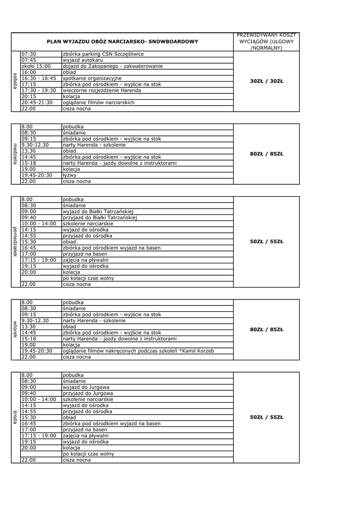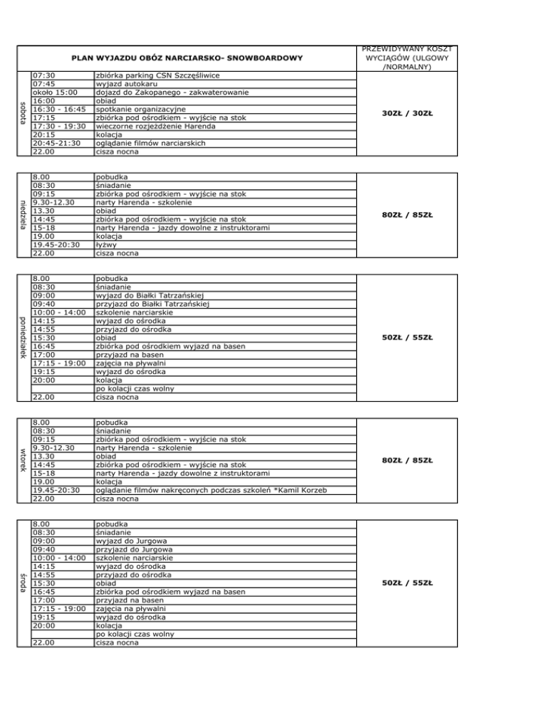 PLAN WYJAZDU OBÓZ NARCIARSKO- SNOWBOARDOWY PRZEWIDYWANY KOSZT WYCIĄGÓW (ULGOWY /NORMALNY) zbiórka parking CSN Szczęśliwice wyjazd autokaru dojazd do Zakopanego - zakwaterowanie obiad spotkanie organizacyjne zbiórka pod ośrodkiem - wyjście na stok wieczorne rozjeżdżenie Harenda kolacja oglądanie filmów narciarskich cisza nocna 30ZŁ / 30ZŁ niedziela 8.00 08:30 09:15 9.30-12.30 13.30 14:45 15-18 19.00 19.45-20:30 22.00 pobudka śniadanie zbiórka pod ośrodkiem - wyjście na stok narty Harenda - szkolenie obiad zbiórka pod ośrodkiem - wyjście na stok narty Harenda - jazdy dowolne z instruktorami kolacja łyżwy cisza nocna 80ZŁ / 85ZŁ 8.00 08:30 09:00 09:40 10:00 - 14:00 14:15 14:55 15:30 16:45 17:00 17:15 - 19:00 19:15 20:00 50ZŁ / 55ZŁ 22.00 pobudka śniadanie wyjazd do Białki Tatrzańskiej przyjazd do Białki Tatrzańskiej szkolenie narciarskie wyjazd do ośrodka przyjazd do ośrodka obiad zbiórka pod ośrodkiem wyjazd na basen przyjazd na basen zajęcia na pływalni wyjazd do ośrodka kolacja po kolacji czas wolny cisza nocna 8.00 08:30 09:15 9.30-12.30 13.30 14:45 15-18 19.00 19.45-20:30 22.00 pobudka śniadanie zbiórka pod ośrodkiem - wyjście na stok narty Harenda - szkolenie obiad zbiórka pod ośrodkiem - wyjście na stok narty Harenda - jazdy dowolne z instruktorami kolacja oglądanie filmów nakręconych podczas szkoleń *Kamil Korzeb cisza nocna 80ZŁ / 85ZŁ 8.00 08:30 09:00 09:40 10:00 - 14:00 14:15 14:55 15:30 16:45 17:00 17:15 - 19:00 19:15 20:00 pobudka śniadanie wyjazd do Jurgowa przyjazd do Jurgowa szkolenie narciarskie wyjazd do ośrodka przyjazd do ośrodka obiad zbiórka pod ośrodkiem wyjazd na basen przyjazd na basen zajęcia na pływalni wyjazd do ośrodka kolacja po kolacji czas wolny cisza nocna 50ZŁ / 55ZŁ poniedziałek sobota 07:30 07:45 około 15:00 16:00 16:30 - 16:45 17:15 17:30 - 19:30 20:15 20:45-21:30 22.00 wtorek środa 22.00 czwartek 8.00 00:30 09:00 09:20 09:40 - 14:20 14:40 15:00 15:30 17:00 17:15 - 19:15 20:00 20:45 - 21:15 22.00 pobudka śniadanie wyjazd do Małe Ciche przyjazd do Małe Ciche szkolenie narciarskie wyjazd do ośrodka przyjazd do ośrodka obiad zbiórka pod ośrodkiem - wyjście na stok narty Harenda - jazdy dowolne z instruktorami kolacja gry i zabawy na śniegu cisza nocna piątek 8.00 08:30 09:00 10:00 - 13:00 13:15 14:00 14:30 15:30 15:45 16:00 - 17:45 18:00 19.00 19.45-20:30 22.00 pobudka śniadanie zbiórka pod ośrodkiem - wyjazd do Nowego Targu narty Nowy Targ - Długa Polana - ZAWODY i jazdy dowolne wyjazd do ośrodka przyjazd do ośrodka obiad zbiórka pod ośrodkiem wyjazd na basen przyjazd na basen zajęcia na pływalni wyjazd do ośrodka kolacja dekoracja uczestników - dyplomy , medale cisza nocna sobota 08:00 08:30 08:50 - 09:10 09:10 - 09:20 09:20 około 16:30 pobudka śniadanie pakowanie i sprzątanie pakowanie autokaru wyjazd do Warszawy dojazd do Warszawy 90ZŁ / 100ZŁ 35ZŁ / 35ZŁ * osoby wypożyczające sprzęt z naszej szkółki powinny dopasować go do 15 stycznia 2016