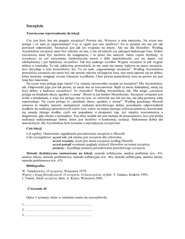 Szczęście Teoretyczne wprowadzenie do lekcji Czy jest ktoś, kto nie pragnie szczęścia? Pewnie nie. Wszyscy o nim marzymy. Na czym ono polega i co nam je zagwarantuje? Czy w ogóle jest ono możliwe? Na te pytania nie ma już tak pewnych odpowiedzi. Szczęście jest jak los wygrany na loterii. Ale nie dla filozofów. Według Arystotelesa szczęście musi być zależne od nas, a nie od innych czy jakiegoś łaskawego losu. Dobro (szczęście) musi być możliwe do osiągnięcia, i to przez nas samych. Jakże często myślimy, iż wystarczy, że coś otrzymamy (niekonieczne nawet z dóbr materialnych), coś się stanie, coś zdobędziemy i już będziemy szczęśliwi. Tak bez żadnego wysiłku. Wygrać szczęście to jak wygrać milion w totolotka. To tak, jakbyśmy powiedzieli, że my sami nie mamy wpływu na nasze szczęście, lecz decyduje o tym bezosobowy los. To on nam „zagwarantuje szczęście”. Według Arystotelesa prawdziwe szczęście nie może być tak mocno zależne od kaprysu losu, ono musi opierać się na dobru, które możemy osiągnąć swoim własnym wysiłkiem. Choć pewna pomyślność losu na pewno nie jest tutaj bez znaczenia. Na czym więc polega jego istota? Czy istnieje niezawodna recepta na szczęście? Dla Arystotelesa, tak. Odpowiedź jego jest tak prosta, że może nas aż rozczarować. Bądź (a może dokładniej, staraj się być) dobry, a będziesz szczęśliwy! To wszystko? Według Arystotelesa, tak. Dla niego „szczęście polega na działaniu duszy zgodnie z cnotą”. Brzmi to już bardzo filozoficznie. Szczęście związane jest ściśle z działaniem, a więc nie polega ono na tym, co człowiek ma lub nie ma, ale jaką postawę sobą reprezentuje. Na czym polega to „działanie duszy zgodnie z cnotą?” Według greckiego filozofa oznacza to między innymi: umiejętność szukania prawdziwego dobra, poszukanie odpowiednich środków do realizacji prawdziwych celów (tzn. celów na miarę naszego człowieczeństwa), kierowanie się zasadą złotego środka, czyli nie popadanie w skrajności (np. żyć między rozrzutnością a skąpstwem, gdy chodzi o pieniądze). Ten złoty środek nie jest zachętą do przeciętności, lecz jest próbą realizacji maksymalnego dobra, które jest możliwe w konkretnej sytuacji. Maksimum dobra dla starożytnych, dla Arystotelesa było tożsame z największym szczęściem. Cele lekcji Cel ogólny: Omówienie zagadnienia poszukiwania szczęścia w filozofii. Cele szczegółowe: uczeń wie, jak istotne jest szczęście dla człowieka; uczeń rozumie, czym jest istota szczęścia według filozofii; uczeń potrafi wymienić poglądy różnych filozofów na temat szczęścia postawy – kształtuje postawę poszukiwania prawdziwego szczęścia. Metody dydaktyczne zastosowane na lekcji: metoda refleksyjna, analiza problemu (ćw. 45), analiza tekstu, metoda problemowa, metoda refleksyjna (ćw. 46), metoda refleksyjna, analiza tekstu, metoda problemowa (ćw. 47). Bibliografia: W. Tatarkiewicz, O szczęściu, Warszawa 1979; Wypisy z ksiąg filozoficznych. O szczęściu. O nieszczęściu, wybór. T. Gadacz, Kraków 1991; J. Vanier, Smak szczęścia, tłum. A. Kuryś, Warszawa 2001. Ćwiczenie 45 Opisz 3 sytuacje, które w ostatnim czasie cię uszczęśliwiły. 1. ………………………………………………….. 2. ………………………………………………….. 3. ………………………………………………….. Podaj 3 oczekiwania, które mogłyby cię uczynić jeszcze bardziej szczęśliwym. 1. ………………………………………………….. 2. ………………………………………………….. 3. ………………………………………………….. Ćwiczenie 46 Na podstawie poniższego fragmentu tekstu Arystotelesa odpowiedz na pytania. Dosyć jednak o tych sprawach; wróćmy znowu do tego dobra, którego szukamy, i do pytania, czym ono może być. Owóż okazuje się, że w każdym rodzaju działania i w każdej sztuce jest nim coś innego: coś innego bowiem w medycynie, coś innego w sztuce dowodzenia – i podobnie w każdej innej sztuce. Co więc jest w każdej z nich dobrem? Czy to, ze względu na co wszystko inne się czyni? Otóż tym jest w medycynie zdrowie, w sztuce dowodzenia – zwycięstwo, w budownictwie – dom, w innych sztukach – znowu coś innego, w każdym działaniu i w każdym przedsięwzięciu – cel; cel bowiem jest tym, ze względu na co wszyscy wszystko inne czynią. Jeśli więc istnieje jeden cel wspólny dla wszystkich możliwych czynności, to on chyba jest owym [najwyższym] dobrem, osiągalnym przez działanie, jeśli zaś tych celów jest więcej, to one nim chyba są. Na innej więc drodze rozważania nasze doszły do tego samego wyniku; ale musimy spróbować wyjaśnić go jeszcze bliżej. Wobec tego, że cele – jak się okazuje – są rozmaite i że niektóre z nich, jak np. bogactwo, flet i wszelkie w ogóle narzędzie, obieramy dla innych [celów], jasną jest rzeczą, że nie wszystkie są celami ostatecznymi; najwyższe jednak dobro zdaje się być czymś ostatecznym. Tak więc, jeśli istnieje jedna jedyna tylko rzecz, która jest czymś ostatecznym, to ona byłaby tym, czego szukamy; jeśli zaś takich rzeczy jest więcej, to ta z nich byłaby tym, czego szukamy, która jest najostateczniejsza. Owóż to, do czego dążymy dla niego samego, nazywamy czymś w wyższym stopniu ostatecznym aniżeli to, do czego dążymy dla czegoś innego; nazywamy też w wyższym stopniu ostatecznym to, do czego się nigdy nie dąży dla czegoś innego, aniżeli te rzeczy, do których się dąży zarówno dla nich samych, jak dla czegoś innego. Bezwzględnie więc ostateczne jest to, do czego się dąży zawsze dla niego samego, a nigdy dla czegoś innego. Temu określeniu odpowiada – wedle powszechnego mniemania – najbardziej szczęście; do szczęścia bowiem dążymy zawsze dla niego samego, a nigdy dla czegoś innego, z