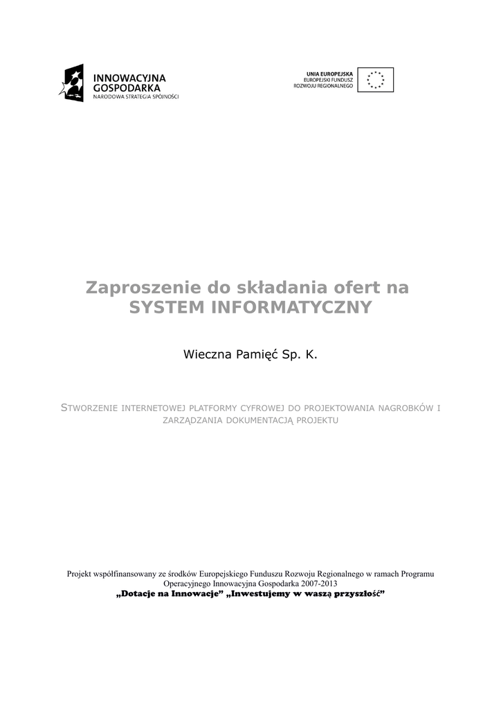 Zaproszenie do składania ofert na SYSTEM INFORMATYCZNY Wieczna Pamięć Sp. K. STWORZENIE INTERNETOWEJ PLATFORMY CYFROWEJ DO PROJEKTOWANIA NAGROBKÓW I ZARZĄDZANIA DOKUMENTACJĄ PROJEKTU Projekt współfinansowany ze środków Europejskiego Funduszu Rozwoju Regionalnego w ramach Programu Operacyjnego Innowacyjna Gospodarka 2007-2013 „Dotacje na Innowacje” „Inwestujemy w waszą przyszłość” POUFNOŚĆ Niniejsze opracowanie nazwane. „Zaproszenie od składania ofert na system informatyczny” nie może być użyty tylko w innym celu, niż przygotowanie ofert dla potrzeb podmiotowego postępowania dotyczącego dostawy Systemu Informatycznego. Wszelkie prawa do niniejszej dokumentacji są własnością Wieczna Pamięć Sp. K. Podpisał: CZĘŚĆ I INFORMACYJNA 1.1. WSTĘP Wieczna Pamięć Sp. K. zainteresowany jest nabyciem i wdrożeniem Systemu Informatycznego w drodze zamkniętego konkursu ofert. Celem niniejszego dokumentu jest przekazanie zainteresowanym Ofertom niezbędnych informacji dotyczących realizacji projektu. Projekt jest współfinansowany przez Unię Europejską ze środków Europejskiego Funduszu Rozwoju Regionalnego. Na niniejsze Zaproszenie do Składania Ofert mogą odpowiedzieć wszystkie firmy, które od Wieczna Pamięć Sp. K. to zaproszenie otrzymały. Wieczna Pamięć Sp. K. jest zainteresowany zakupem wszystkich towarów, usług i systemów od jednego Oferenta. Będzie ona odpowiedzialna za dostarczenie, spójne wdrożenie wszystkich elementów oferowanego systemu oraz szkolenie użytkowników. Wieczna Pamięć Sp. K. zastrzega sobie jednak prawo do nie nabywania żadnego systemu lub nabycia tylko część oferty. Oferta będzie wyrażona w wartościach netto. 1.2. WSKAZÓWKI DLA OFERENTÓW Oczekuje się, że Oferent zapozna się ze wszystkimi informacjami zawartymi w Zaproszeniu do Składania Ofert. Jeżeli Oferent złoży ofertę nie odpowiadającą w istotny sposób wymaganiom, czyni to na swoje ryzyko odrzucenia jego oferty. Zaproszenie do Składania Ofert zostało opracowane zgodnie z najlepszymi intencjami co do jego rzetelności, kompletności i czytelności. Jednakże, w każdej chwili przed terminem składania ofert Wieczna Pamięć Sp. K. może z własnej inicjatywy lub na skutek wniosku o wyjaśnienia złożonego przez potencjalnego Oferenta, zmodyfikować Zaproszenie, wprowadzając poprawki. Poprawka będzie przekazana wszystkim potencjalnym Oferentom, którzy otrzymali Zaproszenie, i będzie miała dla nich charakter wiążący. Aby pozostawić Oferentom odpowiednią ilość czasu na uwzględnienie poprawek przy przygotowywaniu oferty, termin składania ofert może być odpowiednio zmieniony według uznania Wieczna Pamięć Sp. K. 1.2.1. Przedmiot Zapytania Ofertowego Przedmiotem Zapytania jest dostawa Systemu Informatycznego obejmująca: Moduł zapisu (odczytu) plików 3D Moduł konfiguracji obiektów i scen 3D (grupy obiektów) Moduł silnika 3D, API (Application Programmable Interface) Moduł projektowania 3D Moduł zapisu (odczytu) kompozycji 3D projektu Moduł eksportu Stworzenie portalu dla usługi, opracowanie strefy producenta (dostęp do projektów, zarządzanie etapami produkcji) Modułu importu Moduł płatności 1.2.2. Dodatkowe informacje i wyjaśnienia Wszelkie wątpliwości dotyczące Zaproszenia do Składania Ofert będą przekazywanie pocztą elektroniczną. Potencjalny Oferent, który pragnie dodatkowych wyjaśnień może przesłać swoje pytania na adres wskazany w Zaproszeniu. Wieczna Pamięć Sp. K. odpowie na każde zapytanie, które będzie dostarczone do jego siedziby nie później niż na 5 roboczych dni przed terminem składania ofert. 1.2.3. Ryzyko ofertowe Oferenci ponoszą wszystkie koszty związane z przygotowaniem i złożeniem ofert. Wieczna Pamięć Sp. K. zastrzega sobie prawo do wyboru według własnego uznania Oferenta, z którym zawrze kontrakt na dostawę systemu, oraz do nie przyjęcia żadnej oferty, unieważnienia postępowania w całości lub w części, bez podania przyczyn. 1.2.4. Oferta Wszelkie inne dokumenty oraz informacje nie wymienione i nie wymagane w Zaproszeniu, a które Oferent uzna za istotne mogą być przekazane w postaci nieobowiązkowych załączników do oferty. Oferent powinien przygotować oryginał oferty. Oryginał winien być podpisany przez osobę lub osoby upoważnione przez Oferenta do podejmowania zobowiązań wynikających z oferty. Ceny podane w ofercie będą cenami netto. Termin ważności oferty nie może być krótszy niż 90 dni od ustalonego dnia otwarcia ofert. 1.2.5. Termin składania ofert Zabezpieczone koperty powinny być złożone lub przesłane listem poleconym opłaconym przez nadawcę na adres: Wieczna Pamięć Sp. K. ul. Żelazna 59a 00-848 Warszawa i powinny dotrzeć do wymienionego miejsca do dnia 24.12.2013 r. Wieczna Pamięć Sp. K. może według własnego uznania przedłużyć termin składania ofert zawiadamiając o tym wszystkich potencjalnych Oferentów, którzy otrzymali Zaproszenie. W tym przypadku wszystkie prawa i obowiązki Wieczna Pamięć Sp. K. i Oferentów określone wcześniejszym terminem będą zmienione zgodnie z nowym terminem. 1.2.6. Ocena Ofert Analiza formalna Przed szczegółową oceną, Wieczna Pamięć Sp. K. określi czy każda oferta w swojej zawartości formalnej odpowiada wymaganiom Zaproszenia. Wieczna Pamięć Sp. K. dokona analizy oferty w celu stwierdzenia czy są kompletne i właściwie autoryzowane. W przypadku stwierdzenia istotnych niezgodności zawartości oferty z Zaproszeniem do składania ofert, oferta zostanie odrzucona przez Wieczna Pamięć Sp. K. i nie będzie brana pod uwagę w dalszym procesie oceny. Ocena finansowa Cena ofertowa proponowanego systemu będzie wyliczona na podstawie wszystkich kosztów podanych w „Wykazie oferowanych towarów i usług”. Na łączną ocenę finansową oferty będą miały wpływ następujące kryterium: Ceny ofertowe; Skrajnie wygórowana oferta finansowa lub mocno zagęs