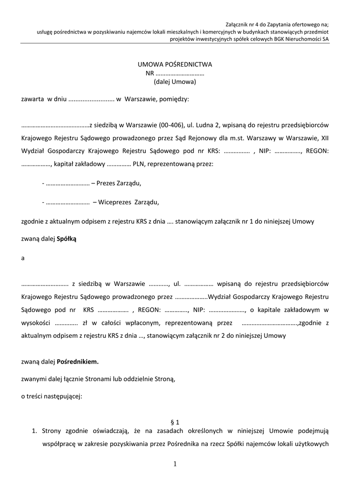 Załącznik nr 4 do Zapytania ofertowego na; usługę pośrednictwa w pozyskiwaniu najemców lokali mieszkalnych i komercyjnych w budynkach stanowiących przedmiot projektów inwestycyjnych spółek celowych BGK Nieruchomości SA UMOWA POŚREDNICTWA NR ………………………… (dalej Umowa) zawarta w dniu .......................... w Warszawie, pomiędzy: ……………………………………z siedzibą w Warszawie (00-406), ul. Ludna 2, wpisaną do rejestru przedsiębiorców Krajowego Rejestru Sądowego prowadzonego przez Sąd Rejonowy dla m.st. Warszawy w Warszawie, XII Wydział Gospodarczy Krajowego Rejestru Sądowego pod nr KRS: ……………. , NIP: ……………., REGON: ………………, kapitał zakładowy …………… PLN, reprezentowaną przez: - ……………………… – Prezes Zarządu, - ……………………… – Wiceprezes Zarządu, zgodnie z aktualnym odpisem z rejestru KRS z dnia …. stanowiącym załącznik nr 1 do niniejszej Umowy zwaną dalej Spółką a ……………………….. z siedzibą w Warszawie …………, ul. ……………… wpisaną do rejestru przedsiębiorców Krajowego Rejestru Sądowego prowadzonego przez ………………..Wydział Gospodarczy Krajowego Rejestru Sądowego pod nr KRS ………………. , REGON: ………….., NIP: …………………., o kapitale zakładowym w wysokości ………….. zł w całości wpłaconym, reprezentowaną przez …………………………….,zgodnie z aktualnym odpisem z rejestru KRS z dnia …, stanowiącym załącznik nr 2 do niniejszej Umowy zwaną dalej Pośrednikiem. zwanymi dalej łącznie Stronami lub oddzielnie Stroną, o treści następującej: §1 1. Strony zgodnie oświadczają, że na zasadach określonych w niniejszej Umowie podejmują współpracę w zakresie pozyskiwania przez Pośrednika na rzecz Spółki najemców lokali użytkowych 1 Załącznik nr 4 do Zapytania ofertowego na; usługę pośrednictwa w pozyskiwaniu najemców lokali mieszkalnych i komercyjnych w budynkach stanowiących przedmiot projektów inwestycyjnych spółek celowych BGK Nieruchomości SA znajdujących się w budynku będącym własnością Spółki lub w budynku którego nabycie stanowić będzie przedmiot umowy przedwstępnej zawartej przez Spółkę, opisanych w ust. 2 poniżej. 2. Spółka oświadcza, iż na dzień podpisania niniejszej Umowy: a) jest właścicielem lokali użytkowych znajdujących się w budynku wielomieszkaniowym, położonym w …………….. przy ul. …………………., objętym księgą wieczystą prowadzoną przez Sąd Rejonowy ……. … Wydział Ksiąg Wieczystych o nr………… i jest zainteresowana wynajmem tych lokali użytkowych (dalej: Lokal/Lokale), których wykaz wraz z ofertową stawką czynszu stanowi Załącznik Nr 3 do Umowy.* b) zgodnie z postanowieniami zawartej umowy przedwstępnej dotyczącej nabycia nieruchomości – budynku wielomieszkaniowego, położonej w …………….. przy ul. …………………. objętej księga wieczystą prowadzoną przez Sąd Rejonowy ……. … Wydział Ksiąg Wieczystych o nr………… ma prawo do komercjalizacji lokalu/lokali użytkowych (dalej: Lokal, Lokale) w tym budynku, których wykaz wraz ofertową stawką czynszu stanowi Załącznik Nr 3 do Umowy.* 3. Spółka zleca Pośrednikowi pozyskiwanie najemców Lokali w budynku, o którym mowa w ust.2 lit a/b* powyżej. 4. Strony uzgadniają, że jeżeli zajdzie taka potrzeba, Spółka jest uprawniona do rozszerzenia zlecenia o pozyskiwanie przez Pośrednika najemców lokali użytkowych, zlokalizowanych w innym budynku niż wskazany w ust. 2 lit a lub b powyżej. Rozszerzenie zlecenia nastąpi w drodze pisemnego oświadczenia Spółki doręczonego Pośrednikowi lub zostanie przesłane pocztą elektroniczną na adres e-mail osoby koordynującej ze strony Pośrednika podany w Umowie. Nie będzie to stanowić zmiany niniejszej Umowy i nie będzie wymagać podpisania przez Strony aneksu do Umowy. 5. Strony uzgadniają, że najemcami mogą być zarówno osoby fizyczne jak i przedsiębiorcy w rozumieniu ustawy Kodeks Cywilny. 6. Strony oświadczają, że Pośrednik nie ma wyłączności z tytułu niniejszej Umowy co oznacza, że Spółka jest uprawniona do zawierania umów z innymi pośrednikami, jak również do poszukiwania najemców Lokalu/Lokali w budynku o którym mowa w ust.2 we własnym zakresie. 7. Spółka dokona wyboru najemcy z uwzględnieniem zasady pierwszeństwa jego zgłoszenia przez Pośrednika, a także atrakcyjności oferty cenowej. §2 1. Do obowiązków Pośrednika w ramach wynagrodzenia ustalonego w Umowie należy: 2 Załącznik nr 4 do Zapytania ofertowego na; usługę pośrednictwa w pozyskiwaniu najemców lokali mieszkalnych i komercyjnych w budynkach stanowiących przedmiot projektów inwestycyjnych spółek celowych BGK Nieruchomości SA a) prowadzenie reklamy i marketingu w celu pozyskiwania najemców Lokali, w sposób i w formie zaakceptowanej przez Spółkę, b) pisemne zgłaszanie Spółce ewentualnych najemców w sposób umożliwiający ich identyfikację wraz z podaniem oferty cenowej co do wysokości miesięcznego czynszu najmu, c) dokonywanie w uzgodnionych ze Spółką terminach prezentacji Lokali potencjalnym najemcom, d) przedstawianie potencjalnym najemcom uzyskanych od Spółki podstawowych założeń dotyczących umów najmu, w tym w szczególności dotyczących wysokości czynszu i zabezpieczeń, e) przedstawienie wzorów umów najmu bądź umowy najmu przekazanych Pośrednikowi przez Spółkę, f) ustalanie w uzgodnieniu ze Spółką terminu podpisania umowy najmu z potencjalnym najemcą Lokalu, g) na życzenie Spółki udział przy podpisywaniu umowy najmu z najemcą, wybranym w wyniku działań podjętych przez Pośrednika, h) sporządzanie codziennych raportów w zakresie ofert i przesyłanie ich pocztą elektroniczną na adres e-mail osoby koordynującej ze strony Spółki podany w Umowie. 2. Rez