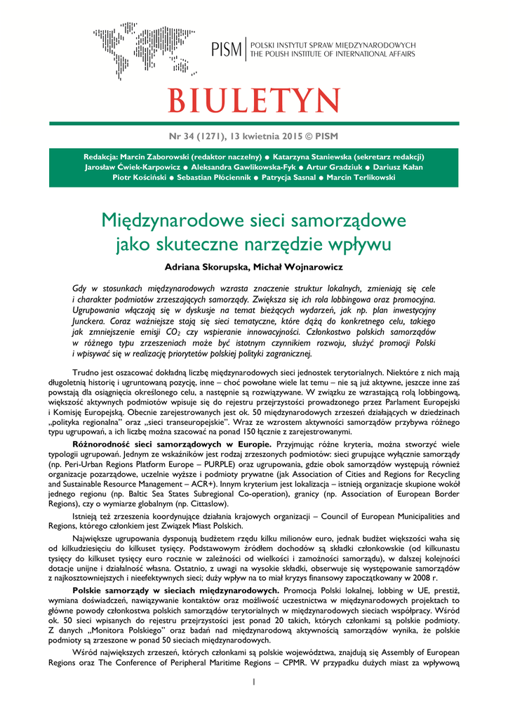 Nr 34 (1271), 13 kwietnia 2015 © PISM .. . . . . Redakcja: Marcin Zaborowski (redaktor naczelny) Katarzyna Staniewska (sekretarz redakcji) Jarosław Ćwiek-Karpowicz Aleksandra Gawlikowska-Fyk Artur Gradziuk Dariusz Kałan Piotr Kościński Sebastian Płóciennik Patrycja Sasnal Marcin Terlikowski . Międzynarodowe sieci samorządowe jako skuteczne narzędzie wpływu Adriana Skorupska, Michał Wojnarowicz Gdy w stosunkach międzynarodowych wzrasta znaczenie struktur lokalnych, zmieniają się cele i charakter podmiotów zrzeszających samorządy. Zwiększa się ich rola lobbingowa oraz promocyjna. Ugrupowania włączają się w dyskusje na temat bieżących wydarzeń, jak np. plan inwestycyjny Junckera. Coraz ważniejsze stają się sieci tematyczne, które dążą do konkretnego celu, takiego jak zmniejszenie emisji CO2 czy wspieranie innowacyjności. Członkostwo polskich samorządów w różnego typu zrzeszeniach może być istotnym czynnikiem rozwoju, służyć promocji Polski i wpisywać się w realizację priorytetów polskiej polityki zagranicznej. Trudno jest oszacować dokładną liczbę międzynarodowych sieci jednostek terytorialnych. Niektóre z nich mają długoletnią historię i ugruntowaną pozycję, inne – choć powołane wiele lat temu – nie są już aktywne, jeszcze inne zaś powstają dla osiągnięcia określonego celu, a następnie są rozwiązywane. W związku ze wzrastającą rolą lobbingową, większość aktywnych podmiotów wpisuje się do rejestru przejrzystości prowadzonego przez Parlament Europejski i Komisję Europejską. Obecnie zarejestrowanych jest ok. 50 międzynarodowych zrzeszeń działających w dziedzinach „polityka regionalna” oraz „sieci transeuropejskie”. Wraz ze wzrostem aktywności samorządów przybywa różnego typu ugrupowań, a ich liczbę można szacować na ponad 150 łącznie z zarejestrowanymi. Różnorodność sieci samorządowych w Europie. Przyjmując różne kryteria, można stworzyć wiele typologii ugrupowań. Jednym ze wskaźników jest rodzaj zrzeszonych podmiotów: sieci grupujące wyłącznie samorządy (np. Peri-Urban Regions Platform Europe – PURPLE) oraz ugrupowania, gdzie obok samorządów występują również organizacje pozarządowe, uczelnie wyższe i podmioty prywatne (jak Association of Cities and Regions for Recycling and Sustainable Resource Management – ACR+). Innym kryterium jest lokalizacja – istnieją organizacje skupione wokół jednego regionu (np. Baltic Sea States Subregional Co-operation), granicy (np. Association of European Border Regions), czy o wymiarze globalnym (np. Cittaslow). Istnieją też zrzeszenia koordynujące działania krajowych organizacji – Council of European Municipalities and Regions, którego członkiem jest Związek Miast Polskich. Największe ugrupowania dysponują budżetem rzędu kilku milionów euro, jednak budżet większości waha się od kilkudziesięciu do kilkuset tysięcy. Podstawowym źródłem dochodów są składki członkowskie (od kilkunastu tysięcy do kilkuset tysięcy euro rocznie w zależności od wielkości i zamożności samorządu), w dalszej kolejności dotacje unijne i działalność własna. Ostatnio, z uwagi na wysokie składki, obserwuje się występowanie samorządów z najkosztowniejszych i nieefektywnych sieci; duży wpływ na to miał kryzys finansowy zapoczątkowany w 2008 r. Polskie samorządy w sieciach międzynarodowych. Promocja Polski lokalnej, lobbing w UE, prestiż, wymiana doświadczeń, nawiązywanie kontaktów oraz możliwość uczestnictwa w międzynarodowych projektach to główne powody członkostwa polskich samorządów terytorialnych w międzynarodowych sieciach współpracy. Wśród ok. 50 sieci wpisanych do rejestru przejrzystości jest ponad 20 takich, których członkami są polskie podmioty. Z danych „Monitora Polskiego” oraz badań nad międzynarodową aktywnością samorządów wynika, że polskie podmioty są zrzeszone w ponad 50 sieciach międzynarodowych. Wśród największych zrzeszeń, których członkami są polskie województwa, znajdują się Assembly of European Regions oraz The Conference of Peripheral Maritime Regions – CPMR. W przypadku dużych miast za wpływową 1 uważana jest sieć Eurocities, do której należy sześć polskich miast i której przewodniczącą w latach 2012–2014 była prezydent Warszawy. Do aktywnych ugrupowań z udziałem także mniejszych jednostek terytorialnych z Polski należą jeszcze Porozumienie Burmistrzów oraz Cittaslow. Istnieje też wiele mniejszych sieci, w przypadku których samorządy nie dostrzegają większych pożytków z członkostwa. W latach 90. oraz na początku XXI w. zrzeszenia kojarzyły się z prestiżem i możliwością wymiany doświadczeń. Obecnie, z uwagi na wysokie składki, nieproporcjonalne do osiąganych korzyści, samorządy występują z sieci. Wciąż jednak wiele jednostek, pomimo braku efektów, pozostaje w sieciach, licząc na to, że w przyszłości członkostwo okaże się pomocne przy poszukiwaniu partnerów do współpracy lub przełoży się na lepszą promocję. Różne typy oddziaływań. Mimo że wciąż dużą rolę odgrywają sieci stricte polityczne o dość ogólnym charakterze, przybywa zrzeszeń skupionych wokół konkretnych zagadnień, takich jak zdrowie, żywność, energetyka, turystyka, środowisko, wybrany dział gospodarki. Polityka i lobbing. Pojedyncze miasta czy regiony nie są w stanie wpływać na decyzje podejmowane w UE, ale już ich reprezentanci – poprzez Komitet Regionów czy międzynarodowe sieci – odgrywają tutaj coraz większą rolę. Pod koniec stycznia br. przedstawiciele pięciu globalnych sieci samorządowych i Komisja Europejska po raz pierwszy podpisali porozumienie w sprawie strategicznego partnerstwa na rzecz zrównoważonego rozwoju, promocji demokracji oraz walki z ubóstwem i nierównością. Na działania zrzeszeń UE przeznaczyła 20,3 mln euro na okres 2015–2017. Jednym z 
