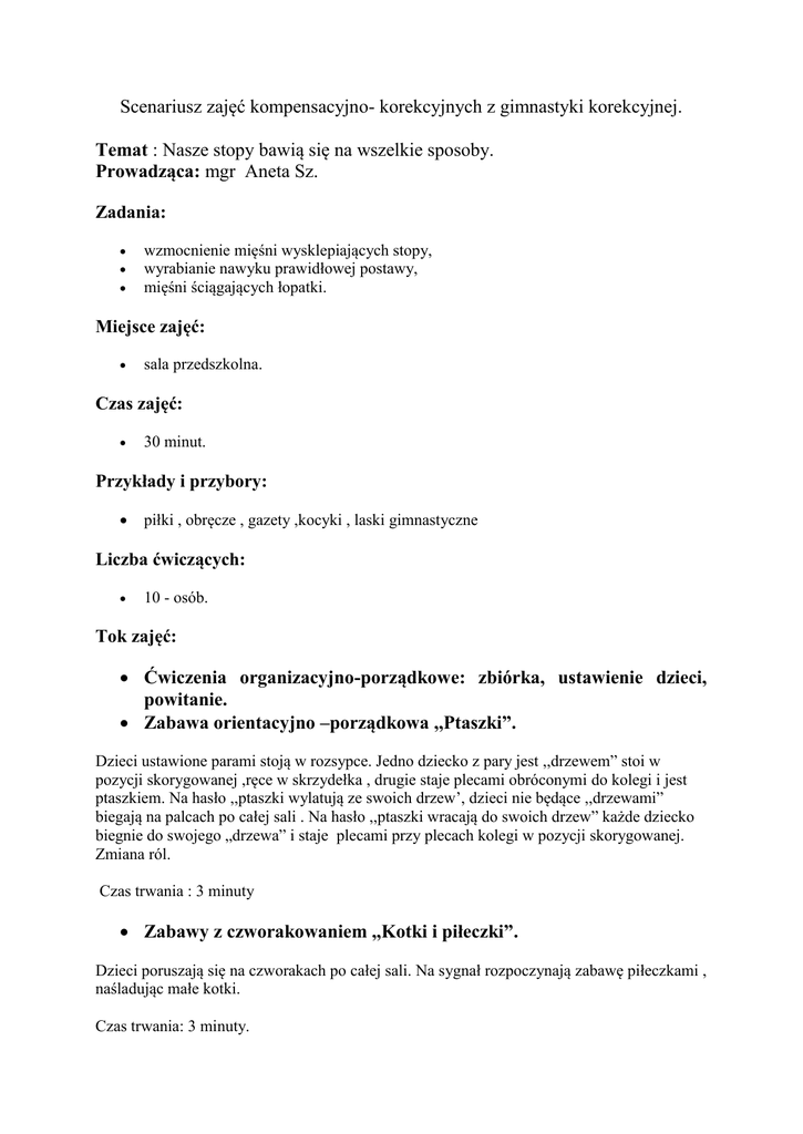 Scenariusz zajęć kompensacyjno- korekcyjnych z gimnastyki korekcyjnej. Temat : Nasze stopy bawią się na wszelkie sposoby. Prowadząca: mgr Aneta Sz. Zadania: wzmocnienie mięśni wysklepiających stopy, wyrabianie nawyku prawidłowej postawy, mięśni ściągających łopatki. Miejsce zajęć: sala przedszkolna. Czas zajęć: 30 minut. Przykłady i przybory: piłki , obręcze , gazety ,kocyki , laski gimnastyczne Liczba ćwiczących: 10 - osób. Tok zajęć: Ćwiczenia organizacyjno-porządkowe: zbiórka, ustawienie dzieci, powitanie. Zabawa orientacyjno –porządkowa ,,Ptaszki”. Dzieci ustawione parami stoją w rozsypce. Jedno dziecko z pary jest ,,drzewem” stoi w pozycji skorygowanej ,ręce w skrzydełka , drugie staje plecami obróconymi do kolegi i jest ptaszkiem. Na hasło ,,ptaszki wylatują ze swoich drzew’, dzieci nie będące ,,drzewami” biegają na palcach po całej sali . Na hasło ,,ptaszki wracają do swoich drzew” każde dziecko biegnie do swojego „drzewa” i staje plecami przy plecach kolegi w pozycji skorygowanej. Zmiana ról. Czas trwania : 3 minuty Zabawy z czworakowaniem ,,Kotki i piłeczki”. Dzieci poruszają się na czworakach po całej sali. Na sygnał rozpoczynają zabawę piłeczkami , naśladując małe kotki. Czas trwania: 3 minuty. Zabawa rzutna ,,Podrzuć i złap piłkę” Dzieci znajdują się w siadzie z nogami ugiętymi. Przed każdym leży piłka .Na sygnał każde dziecko chwyta piłkę obejmując ją stopami , podrzuca do góry i chwyta w dłonie. Czas trwania: 3 minuty. Zabawa bieżna ,,Samochody”. Dzieci biegając po sali trzymając obręcze ( kierownice) przed sobą. Na sygnał dziecisamochody wybiegają z kierownicami w rękach i poruszają się w różnych kierunkach, naśladując trąbienie samochodów. Na drugi sygnał zatrzymują się w miejscu i cichutko, bez trąbienia, każdy samochód wraca do garażu. Czas trwania: 3 minuty. Ślizgi ,,Daleki ślizgi” Dzieci leżą na plecach na kocykach naprzeciwko siebie z ugiętymi nogamii stopami opartymi o stopy partnera. Dłońmi trzymają brzeg kocyka przy głowie. Jednocześnie energicznie prostują nogi , odpychając się od siebie , wykonują dalekie ślizgi na kocykach. Czas trwania: 3 minuty. Ćwiczenia przeciw płaskostopiu ,,Papużka na drążku” Dziecko stoi przed lewym końcem leżącej przed nim laski gimnastycznej. Palcami stóp obchwytuje laskę , ręce ułożone w ,,skrzydełka”, postawa skorygowana. Na sygnał prowadzącego wszystkie dzieci przesuwają się na prawą stronę przez cały czas mocno obejmując laską palcami stop , naśladując papużkę przesuwającą się po drążku w klatce. Czas trwania: 3 minuty. Ćwiczenia poprawiające postawę w różnych pozycjach. Na łące pojawiły się także inne zwierzęta: kruki, jastrzębie, kury i zające, czy umiecie je naśladować? Kruk - chód z chwytem za kostki w przysiadzie. Jastrząb - bieg z pracą RR w bok, w górę i w dół. Kury - trucht z ruchem, odprowadzanie RR pion w skurcz, w przód i w tył. Zając - przysiad z wyciągniętym T w górę, RR w kształcie "uszów nasłuchujących" (ściągnięte łopatki). Czas trwania: 3 minuty Ćwiczenia przeciw płaskostopiu ,,Podrzyj gazetę”. Dzieci są ustawione w rozsypce po całej sali. Przed każdym leży gazeta. Na sygnał dzieci starają się palcami stóp podrzeć swoją gazetę na jak najmniejsze kawałki. Następnie na sygnał , dzieci zbierają gazety. Każde dziecko zbiera po jednym kawałku palcami lewej stopy i podaje do ręki , następny kawałek gazety bierze palcami prawej stopy i podaje do ręki itd. Czas trwania: 4 minuty. Ćwiczenia równoważne: . ,,Bocian” Dzieci naśladują brodzącego bociana po łące" - stanie jednonóż i naśladowanie klekotu boćka: kle, kle, kle Czas trwania: 2 minuty Ćwiczenia oddechowe. ,, Wichura” – Uczestnicy zabawy podzieleni są na dwie grupy. Jedna z nich to drzewa . Dzieci tej grupy wykonują siad skrzyżny z rękoma wyciągniętymi w górę ( jak drzewa z gałęziami). Druga grupa to Wichura . Dzieci tej grupy dmuchają z jednej strony na drzewa . Te kołyszą się na wietrze. Jeśli wiatr jest silniejszy – to drzewa kołyszą się bardziej. Czas trwania: 2 minuty Omówienie zajęcia Zwrócenie uwagi na znaczenie poprawnego trzymania się w staniu oraz w siadzie w przedszkolu. Pożegnanie. Czas trwania: 1 minuta.