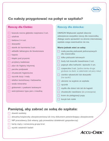 Co należy przygotować na pobyt w szpitalu? Rzeczy dla Ciebie: Rzeczy dla dziecka: FF koszula nocna głęboko rozpinana 2 szt. UWAGA!! Większość szpitali obecnie zabezpiecza wszystkie rzeczy dla noworodka, dlatego warto sprawdzić na stronie internetowej szpitala czego ewentualnie nie ma. FF szlafrok FF bielizna 3-4 szt. FF skarpetki FF stanik do karmienia 2 szt. Warto jednak mieć ze sobą: FF wkładki laktacyjne do biustonosza FF kapcie FF małą paczkę pieluszek jednorazowych dla noworodka FF klapki pod prysznic FF kilka pieluszek tetrowych FF przybory toaletowe FF body lub koszulki bawełniane 3 szt. FF płyn do higieny intymnej FF pajacyk albo kaftanik i śpioszki 3 szt. FF paczka podpasek FF czapeczka 2 szt. (jedna cienka druga grubsza na dwór, w zależności od pory roku) FF chusteczki higieniczne FF ręcznik duży i mały FF cienkie rękawiczki lub skarpetki (na rączki) FF telefon komórkowy i ładowarka FF ubranie na wyjście ze szpitala FF woda mineralna FF ręcznik FF glukometr z paskami testowymi FF mydło dla dzieci lub żel do kąpieli FF wstrzykiwacz typu pen z insuliną FF chusteczki nawilżane (do przewijania) FF krem do pielęgnacji pupy FF kocyk lub rożek Pamiętaj, aby zabrać ze sobą do szpitala: FF dowód osobisty FF aktualną książeczkę ubezpieczeniową lub inny dokument potwierdzający ubezpieczenie FF NIP pracodawcy (lub własny, gdy prowadzisz działalność gospodarczą) FF kartę ciąży z oznaczoną grupą krwi FF wyniki ostatnich badań
