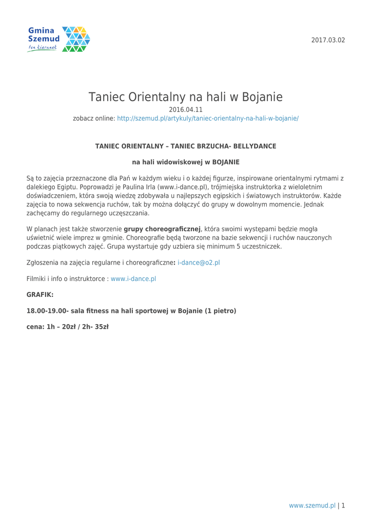 2017.03.02 Taniec Orientalny na hali w Bojanie 2016.04.11 zobacz online: http://szemud.pl/artykuly/taniec-orientalny-na-hali-w-bojanie/ TANIEC ORIENTALNY – TANIEC BRZUCHA- BELLYDANCE na hali widowiskowej w BOJANIE Są to zajęcia przeznaczone dla Pań w każdym wieku i o każdej figurze, inspirowane orientalnymi rytmami z dalekiego Egiptu. Poprowadzi je Paulina Irla (www.i-dance.pl), trójmiejska instruktorka z wieloletnim doświadczeniem, która swoją wiedzę zdobywała u najlepszych egipskich i światowych instruktorów. Każde zajęcia to nowa sekwencja ruchów, tak by można dołączyć do grupy w dowolnym momencie. Jednak zachęcamy do regularnego uczęszczania. W planach jest także stworzenie grupy choreograficznej, która swoimi występami będzie mogła uświetnić wiele imprez w gminie. Choreografie będą tworzone na bazie sekwencji i ruchów nauczonych podczas piątkowych zajęć. Grupa wystartuje gdy uzbiera się minimum 5 uczestniczek. Zgłoszenia na zajęcia regularne i choreograficzne: [email protected] Filmiki i info o instruktorce : www.i-dance.pl GRAFIK: 18.00-19.00- sala fitness na hali sportowej w Bojanie (1 pietro) cena: 1h – 20zł / 2h- 35zł www.szemud.pl | 1
