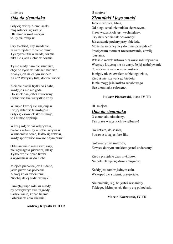 I miejsce II miejsce Oda do ziemniaka Ziemniaki i jego smaki Gdy cię widzę Ziemniaczku mój żołądek się raduje. Dla mnie wśród warzyw to Ty triumfujesz. Czy to obiad, czy śniadanie zawsze zjadam z ciebie danie. Tyś pyszniutki w każdej formie, nikt nie zjada ciebie w normie. Ty się nigdy nam nie znudzisz, chęć do życia w ludziach budzisz. Znanyś jest na całym świecie. Za co? Wszyscy tutaj dobrze wiecie. Z ciebie placki frytki no i baba, każdy je i nic nie gada. Do setek dań jesteś stworzony, Ciebie wielbią wszystkie żony W zupie każdej się znajdujesz i w jej składzie triumfujesz. Gdy cię człowiek skonsumuje, to i humor dopisuje. Ważną rolę w nas odgrywasz, białko i witaminy w sobie skrywasz. Wzmacniasz serce, lekko się trawisz, każdy sportowiec zawsze o tym prawi. Odmian wiele masz swej rasy, nie wymagasz pierwszej klasy. Tylko raz cię opleć trzeba, a wyrośniesz aż do nieba. Miejsce pierwsze jest Ci dane, jadło przez nas polecane. A twój kolor złociuteńki Niechaj dalej budzi wdzięki. Pamiętaj więc rolniku młody, by powiększyć swe zagrody. Sadzić wiele, kopać licznie i obierać w koło ślicznie. Andrzej Kryński kl. IITR Jadłem wczoraj blina, Od niego smak ziemniaka się zaczyna. Przez wszystkich jest wychwalany. Czy dziś będzie tak doskonały? Jak zostanie podany przy obiedzie, Może na srebrnej tacy do mnie przyjedzie? Przeżywam moment rozczarowania, chwilę rozstania. Właśnie weszła ustawa o zakazie soli używania. Wszyscy krzyczą nie na żarty, że jej nadużywanie Powodem zawału u mnie zostanie. Ja nigdy nie żałowałem sobie tego złota, Kiedyś nie używała go biedota. Ja nie mogę jeść kotleta schabowego Bez ziemniaka solonego. Łukasz Piotrowski, klasa IV TR III miejsce Oda do ziemniaka O ziemniaku ukochany, Tyś przez wszystkich uwielbiany! Do kotleta, do sosiku, Potraw z tobą jest bez liku. Gotowany czy smażony, Zawsze dobrym smakiem jesteś obdarzony! Kiedy przyjdzie czas wykopów, Na pole zlatuje się dużo chłopków. Każdy jest tam w jednym celu, Wykopać cię z ziemi, przyjacielu. Nie zmieniaj się, bo jesteś wspaniały. Takiego, jakim jesteś, tłumy cię pokochały. Marcin Koczewski, IV TR Nasz ziemniaczek Nasz ziemniaczek jest wspaniały, do jedzenia doskonały. Rano placki, w obiad puree, brzuszek pełny, główka w górę. Chipsy, frytki też smakują, lecz organizm nieźle psuja. Karolina Sidorczuk, klasa IV A Kartofelek Smaczny również kartofelek – Troszkę wody i rondelek. Gotuj go w łupince. Posmakuje chłopakowi i dziewczynce. Karolina Sidorczuk, klasa IV A Ziemniaczany wierszyk Lubimy nasze ziemniaki na polu rosnące I kochamy je jeść, gdy są gorące. My je chętnie wykopiemy, obierzemy I na kolację ze smakiem zjemy. Gdy ziemniaki ugotujemy i koperkiem posypiemy, To ze smakiem przez miesiąc się oblizujemy. Nasz przyjaciel ziemniaczany równie pysznie doprawiony Jest na obiad przyniesiony. Karolina Puchalska, Sara Tarnogrodzka, Barbara Kuchta, klasa I TŻiUG A *** O ziemniaku mój kochany! Gdy cię nie zjem, tęsknię bardzo. Gdy wytworzy się zaraza, Trwoga na lud prosty spada. Kiedy cię lubią – wywyższają, Ludzie chętnie cię zjadają. O ziemniaku mój kochany, ile w tobie dobra smaku. Kiedy koniec zbiorów blisko, Rozpalamy ognisko I ziemniaki w nie wrzucamy, Bo chcemy je zjeść jak u mamy. Damian Radziszewski, klasa IV TR Wiersz o ziemniaku Ziemniaku, Ty jesteś jak zdrowie. Ile Cię trzeba cenić, ten tylko się dowie, Kto Cię skosztował. Piękność Twą w całej ozdobie Widzę i opisuję, bo tęsknię po Tobie. Usmażonego lub ugotowanego Chciałbym Ciebie skosztować, mój dobry kolego. Cały rok na ciebie czekamy, Gdy są wykopki, szybko zajadamy. Z solą, keczupem Ciebie podają, Byś miał przyjemnie, jakbyś był damą. Również w kebabie Ciebie podają, Z pieczonym mięsem w sosie tabasco. Skazany jesteś na ciężki los, Bez skóry często kończysz swój marny żywot. Dziękujemy za to, że jesteś, Bez Ciebie życie nie byłoby takie PIĘKNE. Marek Kalinowski, klasa III A Do ziemniaka! O ziemniaku pospolity, Rośnij duży i obfity. Wszyscy jedzą przy obiedzie, Nikt nie myśli dziś o biedzie. Ilu ludzi, tyle nazw, Raz kartofel, pyra raz. Ziemniak na Podlasiu gości, Daje tyle nam radości. Gabriela Maciejewska, klasa I TŻiUG A *** Mój kochany ziemniaczku, Wyglądasz dzisiaj bardzo ładnie. Jesteś lekko pulchniutki i okrąglutki, Bardzo mi się podobasz. Jesteś bardzo wesołym i szczerym kartofelkiem, Z wielką chęcią bym cię zjadła, schrupała do samego końca. Szkoda mi cię oddać komuś innemu, nieodpowiedniemu dla ciebie, kartoszko. Masz wielkie brązowe oczka, które mnie każdego dnia rozśmieszają. Kartofelku, jedno chcę ci powiedzieć: jesteś miłością mą. Nie wiem jak to ci powiedzieć prosto w oczy. OK, będę szczera, bardzo cię lubię. Porozmawiałabym z tobą, ale się wstydzę. W szkole jest to trudne, bo wszyscy na nas patrzą i mogą się śmiać. Sądzę, że bylibyśmy świetną parą. My dwa słodkie jak miód, pyszne ziemniaczki roztopione masłem. Skórką byłabym ja, a ty byłbyś tym, co znajduje się w środku ziemniaczka. Agata Strapczuk, klasa I TŻiUG A