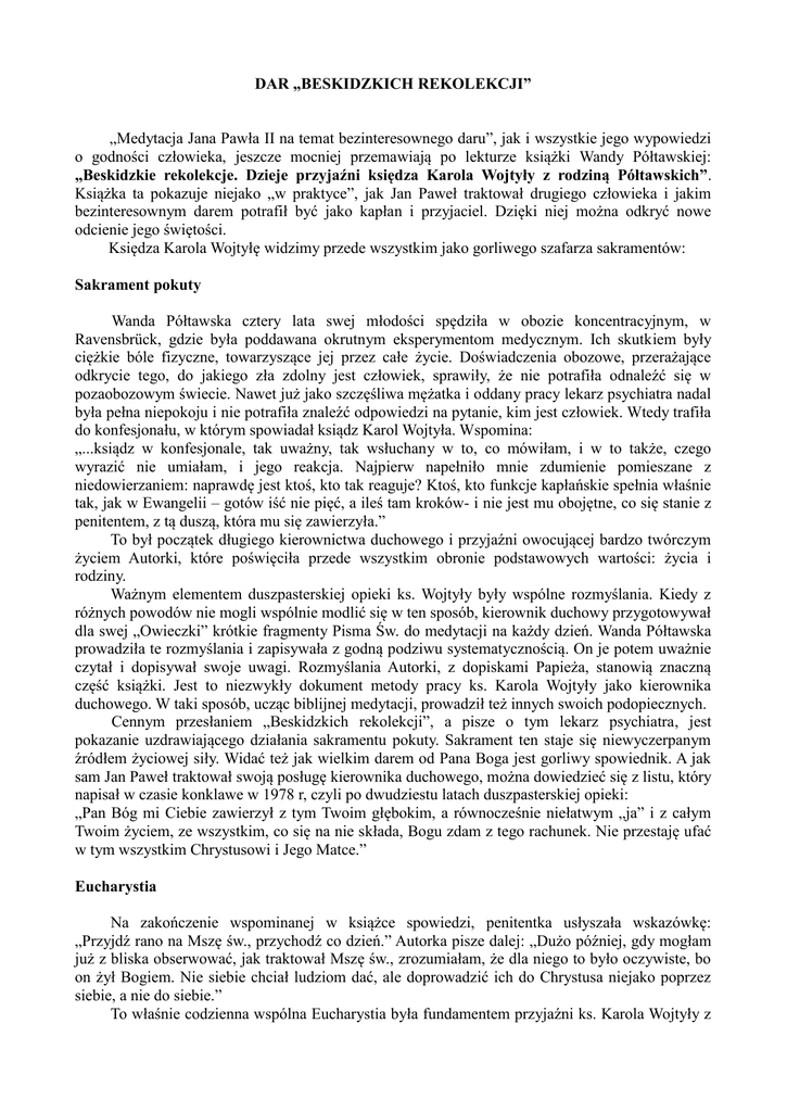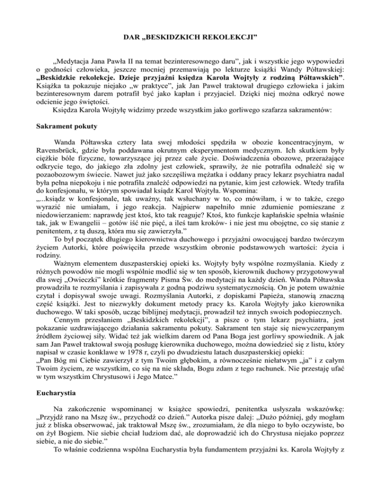 DAR „BESKIDZKICH REKOLEKCJI” „Medytacja Jana Pawła II na temat bezinteresownego daru”, jak i wszystkie jego wypowiedzi o godności człowieka, jeszcze mocniej przemawiają po lekturze książki Wandy Półtawskiej: „Beskidzkie rekolekcje. Dzieje przyjaźni księdza Karola Wojtyły z rodziną Półtawskich”. Książka ta pokazuje niejako „w praktyce”, jak Jan Paweł traktował drugiego człowieka i jakim bezinteresownym darem potrafił być jako kapłan i przyjaciel. Dzięki niej można odkryć nowe odcienie jego świętości. Księdza Karola Wojtyłę widzimy przede wszystkim jako gorliwego szafarza sakramentów: Sakrament pokuty Wanda Półtawska cztery lata swej młodości spędziła w obozie koncentracyjnym, w Ravensbrück, gdzie była poddawana okrutnym eksperymentom medycznym. Ich skutkiem były ciężkie bóle fizyczne, towarzyszące jej przez całe życie. Doświadczenia obozowe, przerażające odkrycie tego, do jakiego zła zdolny jest człowiek, sprawiły, że nie potrafiła odnaleźć się w pozaobozowym świecie. Nawet już jako szczęśliwa mężatka i oddany pracy lekarz psychiatra nadal była pełna niepokoju i nie potrafiła znaleźć odpowiedzi na pytanie, kim jest człowiek. Wtedy trafiła do konfesjonału, w którym spowiadał ksiądz Karol Wojtyła. Wspomina: „...ksiądz w konfesjonale, tak uważny, tak wsłuchany w to, co mówiłam, i w to także, czego wyrazić nie umiałam, i jego reakcja. Najpierw napełniło mnie zdumienie pomieszane z niedowierzaniem: naprawdę jest ktoś, kto tak reaguje? Ktoś, kto funkcje kapłańskie spełnia właśnie tak, jak w Ewangelii – gotów iść nie pięć, a ileś tam kroków- i nie jest mu obojętne, co się stanie z penitentem, z tą duszą, która mu się zawierzyła.” To był początek długiego kierownictwa duchowego i przyjaźni owocującej bardzo twórczym życiem Autorki, które poświęciła przede wszystkim obronie podstawowych wartości: życia i rodziny. Ważnym elementem duszpasterskiej opieki ks. Wojtyły były wspólne rozmyślania. Kiedy z różnych powodów nie mogli wspólnie modlić się w ten sposób, kierownik duchowy przygotowywał dla swej „Owieczki” krótkie fragmenty Pisma Św. do medytacji na każdy dzień. Wanda Półtawska prowadziła te rozmyślania i zapisywała z godną podziwu systematycznością. On je potem uważnie czytał i dopisywał swoje uwagi. Rozmyślania Autorki, z dopiskami Papieża, stanowią znaczną część książki. Jest to niezwykły dokument metody pracy ks. Karola Wojtyły jako kierownika duchowego. W taki sposób, ucząc biblijnej medytacji, prowadził też innych swoich podopiecznych. Cennym przesłaniem „Beskidzkich rekolekcji”, a pisze o tym lekarz psychiatra, jest pokazanie uzdrawiającego działania sakramentu pokuty. Sakrament ten staje się niewyczerpanym źródłem życiowej siły. Widać też jak wielkim darem od Pana Boga jest gorliwy spowiednik. A jak sam Jan Paweł traktował swoją posługę kierownika duchowego, można dowiedzieć się z listu, który napisał w czasie konklawe w 1978 r, czyli po dwudziestu latach duszpasterskiej opieki: „Pan Bóg mi Ciebie zawierzył z tym Twoim głębokim, a równocześnie niełatwym „ja” i z całym Twoim życiem, ze wszystkim, co się na nie składa, Bogu zdam z tego rachunek. Nie przestaję ufać w tym wszystkim Chrystusowi i Jego Matce.” Eucharystia Na zakończenie wspominanej w książce spowiedzi, penitentka usłyszała wskazówkę: „Przyjdź rano na Mszę św., przychodź co dzień.” Autorka pisze dalej: „Dużo później, gdy mogłam już z bliska obserwować, jak traktował Mszę św., zrozumiałam, że dla niego to było oczywiste, bo on żył Bogiem. Nie siebie chciał ludziom dać, ale doprowadzić ich do Chrystusa niejako poprzez siebie, a nie do siebie.” To właśnie codzienna wspólna Eucharystia była fundamentem przyjaźni ks. Karola Wojtyły z rodziną Półtawskich. Gdy Wanda Półtawska chorowała, ks. Wojtyła codziennie przynosił jej do domu Pana Jezusa. Eucharystia była też sercem wspólnych wakacyjnych wyjazdów. Sprawowana na ołtarzu zrobionym z plecaków lub z pnia drzewa w wielkiej kosmicznej świątyni - świecie stworzonym przez Boga. Wśród piękna przyrody człowiek w imieniu wszystkich stworzeń, pełen zachwytu i wdzięczności, oddawał chwałę Stwórcy. Komunia osób zjednoczonych w Bogu promieniowała na całe stworzenie. Wspominał te chwile Papież w jednym z listów, pisanych już z Watykanu, w 1979 roku: „Piszę Ci to, żebyś wiedziała, że ja też chodzę nadal po Górze św. Anny – i chyba już będę tak chodził do końca życia. […] Myśmy w ten obszar wnieśli największą tajemnicę miłości Boga do człowieka, którą jest Eucharystia”. „Wierny przyjaciel jest lekarstwem życia. Znajdzie go bojący się Pana.” (Syr. 6,16) „Beskidzkie rekolekcje” są świadectwem przepięknej przyjaźni, mocno zakorzenionej w Panu Bogu i wspólnocie Kościoła. To jakby „ilustracja” słów św. Jana Apostoła: „Jeżeli zaś chodzimy w światłości, tak jak On sam trwa w światłości, wtedy mamy jedni z drugimi współuczestnictwo”. (1 J. 7). Nie jesteśmy samowystarczalni, potrzebna nam jest obecność i pomoc braci i sióstr w drodze do Pana Boga. Mamy przecież postępować RAZEM na drodze zbawienia. Cennym dokumentem tej książki są listy Jana Pawła pisane do Autorki, które zawsze podpisywał: „Brat”. Również każda z czterech córek państwa Półtawskich ma pudło listów od „Wujka”, pisanych na imieniny, urodziny i różne uroczystości. Wiadomo zresztą, że Papież z wieloma osobami prowadził bardzo bogatą korespondencję. W książce znalazł się wybór tych listów, z których można najlepiej poznać osobowość Jana Pawła. Wszystkie listy emanują serdecznością i ciepłem, czuje się promieniowanie ojcostwa. Ujmujący jest widok Jan Pawła, oddanego przyjaciela, zatroskanego o całą rodzinę