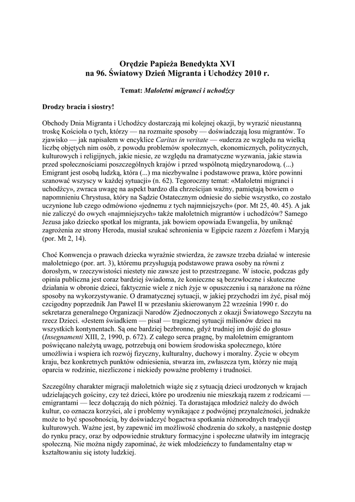 Orędzie Papieża Benedykta XVI na 96. Światowy Dzień Migranta i Uchodźcy 2010 r. Temat: Małoletni migranci i uchodźcy Drodzy bracia i siostry! Obchody Dnia Migranta i Uchodźcy dostarczają mi kolejnej okazji, by wyrazić nieustanną troskę Kościoła o tych, którzy — na rozmaite sposoby — doświadczają losu migrantów. To zjawisko — jak napisałem w encyklice Caritas in veritate — «uderza ze względu na wielką liczbę objętych nim osób, z powodu problemów społecznych, ekonomicznych, politycznych, kulturowych i religijnych, jakie niesie, ze względu na dramatyczne wyzwania, jakie stawia przed społecznościami poszczególnych krajów i przed wspólnotą międzynarodową. (...) Emigrant jest osobą ludzką, która (...) ma niezbywalne i podstawowe prawa, które powinni szanować wszyscy w każdej sytuacji» (n. 62). Tegoroczny temat: «Małoletni migranci i uchodźcy», zwraca uwagę na aspekt bardzo dla chrześcijan ważny, pamiętają bowiem o napomnieniu Chrystusa, który na Sądzie Ostatecznym odniesie do siebie wszystko, co zostało uczynione lub czego odmówiono «jednemu z tych najmniejszych» (por. Mt 25, 40. 45). A jak nie zaliczyć do owych «najmniejszych» także małoletnich migrantów i uchodźców? Samego Jezusa jako dziecko spotkał los migranta, jak bowiem opowiada Ewangelia, by uniknąć zagrożenia ze strony Heroda, musiał szukać schronienia w Egipcie razem z Józefem i Maryją (por. Mt 2, 14). Choć Konwencja o prawach dziecka wyraźnie stwierdza, że zawsze trzeba działać w interesie małoletniego (por. art. 3), któremu przysługują podstawowe prawa osoby na równi z dorosłym, w rzeczywistości niestety nie zawsze jest to przestrzegane. W istocie, podczas gdy opinia publiczna jest coraz bardziej świadoma, że konieczne są bezzwłoczne i skuteczne działania w obronie dzieci, faktycznie wiele z nich żyje w opuszczeniu i są narażone na różne sposoby na wykorzystywanie. O dramatycznej sytuacji, w jakiej przychodzi im żyć, pisał mój czcigodny poprzednik Jan Paweł II w przesłaniu skierowanym 22 września 1990 r. do sekretarza generalnego Organizacji Narodów Zjednoczonych z okazji Światowego Szczytu na rzecz Dzieci. «Jestem świadkiem — pisał — tragicznej sytuacji milionów dzieci na wszystkich kontynentach. Są one bardziej bezbronne, gdyż trudniej im dojść do głosu» (Insegnamenti XIII, 2, 1990, p. 672). Z całego serca pragnę, by małoletnim emigrantom poświęcano należytą uwagę, potrzebują oni bowiem środowiska społecznego, które umożliwia i wspiera ich rozwój fizyczny, kulturalny, duchowy i moralny. Życie w obcym kraju, bez konkretnych punktów odniesienia, stwarza im, zwłaszcza tym, którzy nie mają oparcia w rodzinie, niezliczone i niekiedy poważne problemy i trudności. Szczególny charakter migracji małoletnich wiąże się z sytuacją dzieci urodzonych w krajach udzielających gościny, czy też dzieci, które po urodzeniu nie mieszkają razem z rodzicami — emigrantami — lecz dołączają do nich później. Ta dorastająca młodzież należy do dwóch kultur, co oznacza korzyści, ale i problemy wynikające z podwójnej przynależności, jednakże może to być sposobnością, by doświadczyć bogactwa spotkania różnorodnych tradycji kulturowych. Ważne jest, by zapewnić im możliwość chodzenia do szkoły, a następnie dostęp do rynku pracy, oraz by odpowiednie struktury formacyjne i społeczne ułatwiły im integrację społeczną. Nie można nigdy zapominać, że wiek młodzieńczy to fundamentalny etap w kształtowaniu się istoty ludzkiej. Odrębną kategorią małoletnich są uchodźcy, którzy proszą o azyl, uciekając z różnych powodów z własnego kraju, gdzie nie mają zapewnionej należytej ochrony. Statystyki wykazują, że ich liczba rośnie. Temu zjawisku należy zatem uważnie się przyjrzeć i stawić czoło, podejmując skoordynowane działania, stosując odpowiednie środki zapobiegawcze, chroniąc małoletnich i udzielając im gościny, zgodnie z tym, co mówi Konwencja o prawach dziecka (por. art. 22). Zwracam się w tym miejscu w szczególności do parafii i do licznych stowarzyszeń katolickich, które w duchu wiary i miłości podejmują wielkie wysiłki, by zaradzić potrzebom tych naszych braci i sióstr. Wyrażając wdzięczność za wszystko, co z ogromną wielkodusznością jest robione, chciałbym zachęcić wszystkich chrześcijan do uzmysłowienia sobie, że sytuacja małoletnich migrantów i uchodźców stanowi społeczne i duszpasterskie wyzwanie. W naszych sercach rozbrzmiewają słowa Jezusa: «Byłem przybyszem, a przyjęliście Mnie» (Mt 25, 35), a także główne przykazanie, jakie On nam dał: miłowania Boga całym sercem, całą duszą i całym umysłem, ale w połączeniu z miłowaniem bliźniego (por. Mt 22, 37-39). Dlatego uważamy, że każdym naszym konkretnym czynem winna powodować przede wszystkim wiara w działanie łaski i opatrzności Bożej. Tym samym również gościnność w stosunku do obcokrajowca i solidarność z nim, zwłaszcza w przypadku dzieci, staje się głoszeniem ewangelii solidarności. Kościół ją głosi, gdy otwiera ramiona i zabiega o respektowanie praw migrantów i uchodźców, nakłaniając rządzących krajami i kierujących organizacjami oraz międzynarodowymi instytucjami do ich wspierania poprzez podejmowanie odpowiednich inicjatyw. Niech wszystkich otacza matczyną opieką Najświętsza Maryja Panna i niech nam pomaga zrozumieć trudności tych, którzy przebywają z dala od ojczyzny. Wszystkich, którzy tworzą rozległy świat migrantów i uchodźców, zapewniam o modlitwie i z serca udzielam im Apostolskiego Błogosławieństwa. Watykan, 16 października 2009 r. BENEDICTUS PP XVI