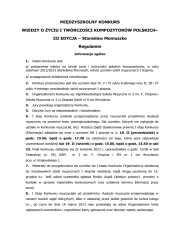 MIĘDZYSZKOLNY KONKURS WIEDZY O ŻYCIU I TWÓRCZOŚCI KOMPOZYTORÓW POLSKICH– III EDYCJA – Stanisław Moniuszko Regulamin Informacje ogólne 1. Celem Konkursu jest: a/ poszerzenie wiedzy na temat życia i twórczości polskich kompozytorów, w roku szkolnym 2012/2013 Stanisława Moniuszki, wśród uczniów szkół muzycznych I stopnia, b/ propagowanie dziedzictwa narodowego. 2. Konkurs przeznaczony jest dla uczniów klas IV, V i VI cyklu 6-letniego oraz II, III i IV cyklu 4-letniego wrocławskich szkół muzycznych I stopnia. 3. Organizatorami Konkursu są: Ogólnokształcąca Szkoła Muzyczna nr 2 im. F. Chopina i Szkoła Muzyczna nr 2 w Zespole Szkół nr 9 we Wrocławiu. 4. Jury powołują organizatorzy Konkursu. 5. Decyzje Jury są niepodważalne i nieodwołalne. 6. I etap Konkursu zostanie przeprowadzony przez nauczycieli przedmiotu Audycje muzyczne, na poziomie testu wewnątrzszkolnego. Dla uczniów, których nie wytypuje do udziału w Konkursie nauczyciel, lecz Rodzice (bądź Opiekunowie prawni) I etap Konkursu (Eliminacje) odbędzie się wraz z uczniami SM I stopnia nr 2: 18. II (poniedziałek) o godz. 15.50, bądź o godz. 17.30 (w zależności od tego, która pora odpowiada uczestnikowi bardziej) lub 19. II (wtorek) o godz. 15.00, bądź o godz. 15.50 w sali 33. Finał Konkursu odbędzie się 22 kwietnia 2013 r. (poniedziałek) o godz. 16:00 w Sali Teatralnej (s. 29) OSM nr 2 im. F. Chopina i SM nr 2 we Wrocławiu przy ul. Krajewskiego 1. 7. Materiały do przygotowania się uczniów do I etapu Konkursu Organizatorzy dostarczą do wrocławskich szkół muzycznych I stopnia osobiście, bądź drogą pocztową do 15. grudnia b.r. Jeśli udział uczestnika zgłasza Rodzic (bądź Opiekun prawny) prosimy o kontakt w sprawie materiałów konkursowych oraz ustalenia terminu Eliminacji przez email. 8. I Etap Konkursu nauczyciele od przedmiotu Audycje muzyczne przeprowadzają w ramach swoich zajęć lekcyjnych, albo o ustalonej przez siebie godzinie do końca lutego b.r., po czym do dnia 10 marca 2013 roku przesyłają na adres Organizatorów testy najlepszych uczestników i wypełnione karty zgłoszenia oraz dowody wpłaty wpisowego. 9. Karty zgłoszenia (zawarte w załączniku nr 1 do regulaminu) prosimy przesłać na adres: Sekretariat Ogólnokształcącej Szkoły Muzycznej nr 2 im. F. Chopina i SM I stopnia nr 2 we Wrocławiu, ul. Krajewskiego 1, 51-690 Wrocław, z dopiskiem: „Konkurs Wiedzy o życiu i twórczości Stanisława Moniuszki”. 10. Regulamin i karta zgłoszenia dostępne są także na stronie internetowej szkoły: www.zs9.wroclaw.pl/muzyczna/ (zakładka: Konkursy). 11. Do Finału każda ze szkół (OSM i SM) może wytypować maksymalnie siedmioro uczniów. Muszą to być uczniowie z najwyższym wynikiem testu (skala wyniku kwalifikującego do Finału zostanie dostarczona wraz z testem i kluczem). Test eliminacyjny wraz z kluczem oraz punktacją zostanie dostarczony do szkół w pierwszym tygodniu po feriach zimowych. Wraz z testem i kluczem do zadań testowych będzie dostarczona instrukcja punktacji odpowiedzi, zawierająca również wiadomość o przedziale punktowym gwarantującym udział w Finale. 12. Warunkiem uczestnictwa w Finale Konkursu, poza zdobyciem odpowiedniej punktacji na teście eliminacyjnym, jest opłacenie bezzwrotnego wpisowego w kwocie 15 zł od uczestnika. Wpłat należy dokonywać na konto Funduszu Muzycznego przy Ogólnokształcącej Szkole Muzycznej I stopnia nr 2 im. F. Chopina we Wrocławiu, nr konta: 60 1020 5226 0000 6402 0416 5825 - najpóźniej do 10. marca 2013 r. Dowody wpłaty mają być przesłane wraz z kartami zgłoszenia do Finału do dnia 10. marca 2013 r. Nie dokonanie wpłaty powoduje skreślenie z listy finałowej. Uczestnicy, którzy nie przystąpią do Finału Konkursu nie otrzymają zwrotu wpisowego. 13. W przypadku zgłoszenia się mniejszej ilości kandydatów do Finału z innych szkół, Organizator zastrzega sobie prawo dopuszczenia do Finału większej ilości uczniów z OSM I st. nr 2 im. F. Chopina i SM nr 2 we Wrocławiu. 14. Organizator nie zwraca kosztów podróży. 15. Dla zwycięzców Konkursu przewidziano nagrody rzeczowe oraz dyplomy laureatów. Pozostali otrzymują dyplomy uczestnictwa. 16. W przypadku, gdy duża część uczestników Konkursu uzyskałaby taką samą punktację Organizatorzy zastrzegają sobie prawo do zadania w trakcie Finału dodatkowych pytań, w celu wyłonienia laureatów. 17. Bliższe informacje na temat Konkursu można uzyskać drogą mailową pisząc na adres: [email protected] i [email protected] Przebieg konkursu Forma – I etap (Eliminacje) to test obejmujący część teoretyczną. Jest przeprowadzany przez nauczyciela przedmiotu Audycje Muzyczne na poziomie wewnątrzszkolnym. Do Finału przechodzą uczniowie (maksymalnie siedmiu z każdej OSM i siedmiu z każdej SM), którzy uzyskali największą ilość punktów. Czas trwania Eliminacji - 45 minut Wymagania: a/ znajomość wiedzy na temat życia i twórczości Stanisława Moniuszki na podstawie materiałów dostarczonych przez Organizatorów Konkursu wrocławskim szkołom muzycznym oraz Rodzicom i Opiekunom prawnym uczniów zainteresowanych udziałem w Konkursie, b/ w Finale znajomość słuchowa wybranych utworów Stanisława Moniuszki w zakresie ujętym na płycie CD dostarczonej uczestnikom po Eliminacjach, c/ w Finale znajomość życia i twórczości Moniuszki na podstawie materiałów dostarczonych przez Organizatorów Konkursu zarówno do Eliminacji, jak i do Finału oraz lektur określonych w materiałach do Finału, d/Finał będzie się składał z 2 części. Pierwsza część będzie miała formę testu pisemnego, druga będzie częścią ustną. Szczegóły dotyczące Finału Organizatorzy umieszczą na stronie szkoły do końca lutego 2013 roku. Czas trwania Finału (w przybliżeniu) – w zależności od ilości uczestników – od 1,5 - 3 godzin Załącznik nr 1 MIĘDZYSZKOLNY KONKURS WIEDZY O ŻYCIU I TWÓ