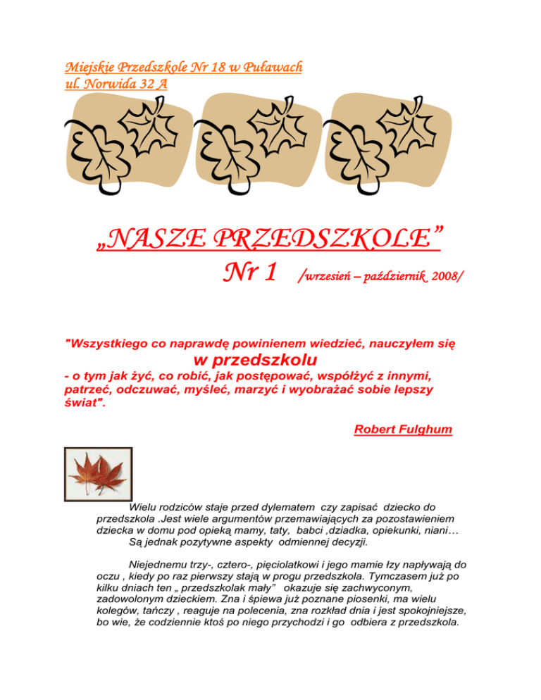 Miejskie Przedszkole Nr 18 w Puławach ul. Norwida 32 A „NASZE PRZEDSZKOLE” Nr 1 /wrzesień – październik 2008/ "Wszystkiego co naprawdę powinienem wiedzieć, nauczyłem się w przedszkolu - o tym jak żyć, co robić, jak postępować, współżyć z innymi, patrzeć, odczuwać, myśleć, marzyć i wyobrażać sobie lepszy świat". Robert Fulghum Wielu rodziców staje przed dylematem czy zapisać dziecko do przedszkola .Jest wiele argumentów przemawiających za pozostawieniem dziecka w domu pod opieką mamy, taty, babci ,dziadka, opiekunki, niani… Są jednak pozytywne aspekty odmiennej decyzji. Niejednemu trzy-, cztero-, pięciolatkowi i jego mamie łzy napływają do oczu , kiedy po raz pierwszy stają w progu przedszkola. Tymczasem już po kilku dniach ten „ przedszkolak mały” okazuje się zachwyconym, zadowolonym dzieckiem. Zna i śpiewa już poznane piosenki, ma wielu kolegów, tańczy , reaguje na polecenia, zna rozkład dnia i jest spokojniejsze, bo wie, że codziennie ktoś po niego przychodzi i go odbiera z przedszkola. Przedszkole uczy samodzielności, współdziałania w grupie, dyscypliny, rozwija talenty, intelekt, pobudza emocje , wyrabia sprawność ruchową , muzyczną, plastyczną .Tu zawiera się pierwsze w życiu przyjaźnie. Dziecko dzieli się z innymi swoją ulubioną zabawką, ale też uczy się wałczyć o tę, którą się aktualnie bawi. Dzień i przedszkolaka to wiele zwycięstw ale i wiele dziecięcych porażek. DOBRE DOŚWIADCZENIA CO PRZEDSZKOLE DAJE DZIECKU: *dziecko w przedszkolu bawi się, poznaje, uczy się, odpoczywa *przedszkolak nawiązuje przyjazne relacje z otaczającymi je osobami i przedmiotami *zdobywa wiarę w siebie, kształtuje własną tożsamość, umacnia swoja indywidualność *przedszkole zapewnia dziecku warunki do uczenia się i odkrywania stopniowo swoich umiejętności i możliwości *życie w grupie rozwija świadomość społeczną , uczy nawiązywania nowych przyjaźni a także dzielenia się przedmiotami i przezwyciężania trudności, jakie niesie ze sobą współżycie w grupie. CO PRZEDSZKOLE DAJE RODZICOM: *współdziałanie w wychowaniu dziecka w otoczeniu innym niż rodzinne *opiekę nad dzieckiem w czasie pracy rodziców *poznawanie dziecka z innej perspektywy / grupa rówieśnicza/ *wymianę doświadczeń i możliwość nawiązania znajomości z innymi rodzicami *informację na temat praktycznych kwestii dotyczących wychowania *porady z zakresu postępowania z dzieckiem *udział rodziców w działalności wychowawczej oraz działalności przedszkola. Życie przedszkolaka” „ Zadowoleni i wypoczęci, bogatsi o nowe przygody i przeżycia powróciliśmy z wakacji do przedszkola. Czekała na nas odmieniona sala, nowe zabawki, a przede wszystkim nowe dzieci! Pierwsze dni naszego pobytu wypełniały wspomnienia z wakacji, a także rozmowy o tym, co to znaczy być dobrym kolegą i przedszkolakiem. Poznaliśmy zasady obowiązujące w naszej sali oraz „magiczne słowa” umieszczone na „Drzewie dobrych manier”. Przywitaliśmy jesień spacerem , obserwowaliśmy zmiany zachodzące w przyrodzie, rozpoznawaliśmy drzewa po liściach, zbieraliśmy dary jesieni: kasztany i żołędzie do kącika przyrodniczego. Poznaliśmy również grzyby i wiemy które można zbierać i jeść oraz te które, choć są bardzo ładne, nie wolno nawet dotykać ale również i niszczyć. Przypomnieliśmy sobie także podstawowe zasady ruchu drogowego, a przede wszystkim utrwaliliśmy, jak należy bezpiecznie zachować się przy jezdni i na przejściach dla pieszych. Ciekawym przeżyciem było dla nas spotkanie z Panem Policjantem. Z ogromnym zainteresowaniem słuchaliśmy, gdy opowiadał o swojej pracy i wyjaśniał, jak prawidłowo zachowywać się w okolicy jezdni. Cieszymy się, że Pan Policjant przyjął zaproszenie i odwiedził nasze przedszkole. Jeszcze lato nie odeszło, a już jesień bliska. Wrzesień milczkiem borowiki skrył we wrzosowiskach, na polany rude rydze stadkami wygonił i rumiane jabłka strąca raz po raz z jabłoni. Jeszcze słońce o południu tak potrafi przypiec, jakby to nie wrzesień rządził, lecz upalny lipiec. Ale już chłodniejsze noce niż bywały w lecie. Liściom - żółknąć czas, a ptakom - za morza odlecieć! ************************************************ ************************************************ CZY WARTO WYDAWAĆ PRZEDSZKOLNĄ GAZETKĘ ? Każde przedszkole stara się stosować różne formy kontaktu z rodzicem . Poprzez szerszą współpracę z rodzicami czy opiekunami dziecka dużo łatwiej podjąć właściwe kroki na drodze oddziaływań dydaktyczno – wychowawczych . Łatwiej też pedagogizować rodzinę. Z drugiej strony rodzic biorący udział w zebraniach , rozmowach indywidualnych z nauczycielem , uroczystościach czy innych formach kontaktu zdobywa informacje na temat działalności placówki , zasad jej funkcjonowania , lepiej rozumie znaczenie pracy przedszkola i rolę jaką spełnia lub może ono spełniać w rozwoju jego dziecka . W naszym przedszkolu wydawana gazetka dla dzieci i rodziców stała się jeszcze jednym ze sposobów kontaktu z rodzicem i z dzieckiem . *************************************************************************** KĄCIK HUMORU I DOWCIPU SŁOWNEGO DZIECI: Wypowiedzi dzieci nie tylko o zwierzętach / 4-latki / : # - Wiewiórka żywi się orzechami bardzo twardymi, bo gdyby nie jadła twardego pożywienia, to by jej zarosła paszcza. # -W zimie należy dokarmiać leśne zwierzęta, aby były smaczne na wiosnę. # -Jaskółka jest zwierzęciem, tylko że w powietrzu. # -Aby się nie zarazić, to trzeba myć wszystkie owoce i nie jeść na tej samej misce co pies. # -Opiszę psa. Ma nogi i głowę przyczepioną do tułowia. ******************************************************** MAMA, TATA I JA W ramach pedagogizacji rodziców proponujemy Państwu artykuł: 1. ADAPTACJA DZIECI DO WARUNKÓW PRZEDSZKOLNYCH. Adaptacja to przystosowanie do now