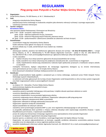 REGULAMIN Ping-pong-owe Potyczki o Puchar Wójta Gminy Sławno 1. 2. 3. 4. 5. 6. 7. 8. Organizator: Urząd Gminy Sławno, 76-100 Sławno, ul. M. C. Skłodowskiej 9 Cele: ⋅ integracja mieszkańców Gminy Sławno ⋅ popularyzacja tenisa stołowego w środowisku wiejskim jako elementu rekreacji ruchowej i czynnego wypoczynku ⋅ rywalizacja sportowo-rekreacyjna Termin i miejsce: 05 kwietnia 2014 r. sala sportowa Szkoły Podstawowej i Gimnazjum we Wrześnicy godz. 9.30 – 10.00 – przyjazd i rejestracja ekip godz. 10.00 – odprawa kapitanów drużyn, losowanie godz. 10.30 – otwarcie Ping-pong-owych Potyczek, pierwsze mecze ok. godz. 15.00 – podsumowanie i zakończenie zawodów (w zależności od ilości drużyn) Uczestnictwo: ⋅ uczestnikami mogą być mieszkańcy Gminy Sławno ⋅ każde sołectwo może zgłosić nie więcej niż 1 drużynę ⋅ drużyna składa się z 5 osób, wśród których musi znaleźć się 1 kobieta Zgłoszenia: ⋅ obowiązuje osobiste, pisemne lub telefoniczne zgłoszenie drużyny do turnieju – do dnia 03 kwietnia 2014 r. – Urząd Gminy Sławno, ul. M. C. Skłodowskiej 9, 76-100 Sławno (Agnieszka Czarnuch – pokój nr 14), tel. (59) 810-67-14, fax: (59) 810-67-00, e-mail: [email protected]. Zgłoszenia dokonuje sołtys lub kapitan drużyny ⋅ w dniu zawodów: a) kapitan drużyny musi złożyć pisemne zgłoszenie drużyny/zawodników do turnieju b) każdy zawodnik musi złożyć własnoręcznie podpisane oświadczenie dot. uczestnictwa w zmaganiach c) osoby niepełnoletnie dostarczają oświadczenia rodziców bądź opiekunów prawnych o możliwości wzięcia udziału w zawodach ⋅ niezbędne formularze, będące załącznikami do niniejszego regulaminu dostępne są na stronie internetowej www.gminaslawno.pl oraz w pok. nr 14 Urzędu Gminy Sławno ⋅ brak stosownych oświadczeń skutkuje niedopuszczeniem do zawodów Zasady gry: ⋅ zawody przeprowadzone będą zgodnie z przepisami gry w tenisa stołowego, wydanymi przez Polski Związek Tenisa Stołowego w grach indywidualnych, ⋅ w zależności od liczby zgłoszonych do turnieju drużyn Organizator ustali bezpośrednio w dniu turnieju system rozgrywek oraz ilość rozgrywanych setów w poszczególnych meczach Nagrody: ⋅ za miejsca I-III – Statuetka / Puchar Wójta Gminy Sławno ⋅ okolicznościowe dyplomy dla wszystkich drużyn Postanowienia końcowe: ⋅ zawodnicy powinni posiadać niekrępujący strój sportowy i miękkie obuwie sportowe założone w szatni ⋅ uczestnicy dojeżdżają na własny koszt ⋅ uczestnicy niepełnoletni muszą posiadać legitymację szkolną ⋅ uczestnicy rozgrywają mecze własnymi rakietkami, Organizator zabezpiecza piłki ping-pong-owe ⋅ Organizator zapewnia ubezpieczenie NNW uczestników ⋅ Organizator zabezpiecza obsługę sędziowską (nauczyciele w-f) ⋅ Organizator zapewnia wodę dla zawodników ⋅ dojazd zawodników we własnym zakresie ⋅ zawodnicy winni przestrzegać przepisów BHP i p. poż. oraz regulaminu obowiązującego w sali sportowej ⋅ w przypadku jednakowej ilości punktów o miejscu sołectwa decyduje wiek najstarszego zawodnika drużyny – wyżej klasyfikowana jest drużyna, z najstarszym zawodnikiem ⋅ prawo do wyłącznej interpretacji niniejszego regulaminu oraz wprowadzania zmian posiada Organizator ⋅ w sprawach nie objętych regulaminem decyduje Organizator ⋅ kwestie sporne, w zależności od ich charakteru, rozstrzyga Organizator lub Sędzia Główny Turnieju ⋅ Organizator nie ponosi odpowiedzialności za kontuzje, wypadki, problemy zdrowotne uczestników podczas trwania zawodów oraz nie odpowiada za rzeczy zaginione podczas turnieju ⋅ wszelkich dodatkowych informacji udziela: Agnieszka Czarnuch, tel. (59) 810-67-14, e-mail: [email protected]
