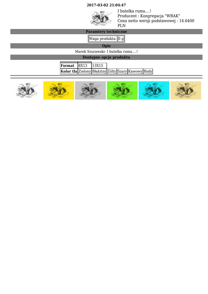 2017-03-02 21:04:47 I butelka rumu....! Producent : Kongregacja "WRAK" Cena netto wersji podstawowej : 14.6400 PLN Paramtery techniczne Waga produktu: 0 g Opis Marek Szurawski: I butelka rumu....! Dostępne opcje produktu Format 8X13 13X15 Kolor tła Zielony Błękitny Żólty Szary Kawowy Biały