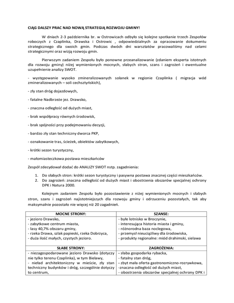 CIĄG DALSZY PRAC NAD NOWĄ STRATEGIĄ ROZWOJU GMINY! W dniach 2‐3 października br. w Ostrowicach odbyło się kolejne spotkanie trzech Zespołów roboczych z Czaplinka, Drawska i Ostrowic , odpowiedzialnych za opracowanie dokumentu strategicznego dla swoich gmin. Podczas dwóch dni warsztatów pracowaliśmy nad celami strategicznymi oraz wizją rozwoju gmin. Pierwszym zadaniem Zespołu było ponowne przeanalizowanie (zdaniem eksperta istotnych dla rozwoju gminy) niżej wymienionych mocnych, słabych stron, szans i zagrożeń i ewentualne uzupełnienie analizy SWOT. ‐ występowanie wysoko zmineralizowanych solanek w regionie Czaplinka ( migracja wód zmineralizowanych – soli cechsztyńskich), ‐ zły stan dróg dojazdowych, ‐ fatalne Nadbrzeże jez. Drawsko, ‐ znaczna odległość od dużych miast, ‐ brak współpracy równych środowisk, ‐ brak spójności przy podejmowaniu decyzji, ‐ bardzo zły stan techniczny dworca PKP, ‐ oznakowanie tras, ścieżek, obiektów zabytkowych, ‐ krótki sezon turystyczny, ‐ małomiasteczkowa postawa mieszkańców Zespół zdecydował dodać do ANALIZY SWOT nstp. zagadnienia: 1. Do słabych stron: krótki sezon turystyczny i pasywna postawa znacznej części mieszkańców. 2. Do zagrożeń: znaczna odległość od dużych miast i obostrzenia obszarów specjalnej ochrony DPK i Natura 2000. Kolejnym zadaniem Zespołu było pozostawienie z niżej wymienionych mocnych i słabych stron, szans i zagrożeń najistotniejszych dla rozwoju gminy i odrzuceniu pozostałych, tak aby maksymalnie pozostało nie więcej niż 20 zagadnień. MOCNE STRONY: ‐ jezioro Drawsko, ‐ zabytkowe centrum miasta, ‐ lasy 40,7% obszaru gminy, ‐ rzeka Drawa, szlak papieski, rzeka Dobrzyca, ‐ duża ilość małych, czystych jezioro. SZANSE: ‐ byłe lotnisko w Broczynie, ‐ interesująca historia miasta i gminy, ‐ różnorodna baza noclegowa, ‐ przemysł nieuciążliwy dla środowiska, ‐ produkty regionalne: miód drahimski, sielawa SŁABE STRONY: ZAGROŻENIA: ‐ niezagospodarowane jezioro Drawsko (dotyczy ‐ słaba gospodarka rybacka, nie tylko terenu Czaplinka), w tym Bielawy, ‐ fatalny stan dróg, ‐ nieład architektoniczny w mieście, zły stan ‐ zbyt mała oferta gastronomiczno‐rozrywkowa, techniczny budynków i dróg, szczególnie dotyczy ‐znaczna odległość od dużych miast, ‐ obostrzenia obszarów specjalnej ochrony DPK i to centrum, ‐ zły stan gospodarki wodno‐ściekowej na Natura 2000. terenie miasta i gminy, ‐ brak imprezy o charakterze ponadlokalnym, wyróżniającej Czaplinek, ‐ za mała ilość plaż, kąpielisk, ‐ krótki sezon turystyczny, ‐ pasywna postawa znacznej części mieszkańców Członkowie zdecydowali się na odrzucenie następujących zapisów: MOCNE STRONY: ‐ jezioro Drawsko (1 głos), ‐ rzeka Drawa, rzeka Dobrzyca (1 głos), ‐ zabytkowe centrum miasta (3 głosy), ‐ duża ilość małych, czystych jezior (2 głosy), ‐ lasy 40,7% obszaru gminy (2 głosy), SŁABE STRONY: ‐ pasywna postawa znacznej części mieszkańców (3 głosy), ‐ za mała ilość plaż, kąpielisk ( 7 głosów), ‐ brak imprezy o charakterze ponadloklanym (1 głos), ‐ zły stan gospodarki wodno‐ściekowej (1 głos), ‐ nieład architektoniczny w mieście, zły stan techniczny budynków i dróg, szczególnie dotyczy to centrum (1 głos). SZANSE: ‐ interesująca historia miasta i gminy (5 głosów), ‐ różnorodna baza noclegowa ( 5 głosów), ‐ przemysł nieuciążliwy dla środowiska ( 4 głosy). ZAGROŻENIA: ‐ słaba gospodarka rybacka ( 4 głosy), ‐ fatalny stan dróg ( 2 głosy) ‐ zbyt mała oferta gastronomiczno‐rozrywkowa ( 4 głosy), ‐ znaczna odległość od dużych miast ( 4 głosy), Ostatecznie członkowie Zespołu pozostawili nstp. zagadnienia: MOCNE STRONY: ‐ jezioro Drawsko, ‐ lasy 40,7% obszaru gminy, ‐ rzeka Drawa, ‐ duża ilość małych, czystych jezioro. SŁABE STRONY: ‐ niezagospodarowane jezioro Drawsko (dotyczy nie tylko terenu Czaplinka), w tym Bielawy, ‐ nieład architektoniczny w mieście, zły stan techniczny budynków i dróg, szczególnie dotyczy to centrum, ‐ zły stan gospodarki wodno‐ściekowej na terenie miasta i gminy, ‐ krótki sezon turystyczny, SZANSE: ‐ byłe lotnisko w Broczynie, ‐ produkty lokalne, ‐ przemysł nieuciążliwy dla środowiska, ZAGROŻENIA: ‐ słaba gospodarka rybacka, ‐ fatalny stan dróg, ‐ obostrzenia obszarów specjalnej ochrony DPK i Natura 2000. Następnie Zespół dokonywał analizy, odpowiadając na niżej zamieszczone pytania: Czy szanse pozwolą przezwyciężyć słabości? Macierz analizy wzajemnego odziaływania szans (O) płynących z otoczenia i słabych stron (W). O1 O2 O3 SUMA W1 2 1 1 4 W2 1 2 1 4 W3 1 1 0 2 SUMA 4 4 2 10 Przy tym zadaniu członkowie Zespołu analizując każdą z wymienionych mocnych, słabych stron, szans i zagrożeń musieli odpowiadać sobie na nstp. pytania: ANALIZA SWOT 1. Czy siły pozwolą wykorzystać szanse? 2. Czy słabości „zablokują” wykorzystanie szans? 3. Czy siły pozwalają na przezwyciężenie zagrożeń? 4. Czy słabości wzmocnią negatywny skutek zagrożeń? ANALIZA TOWS: 5. Czy zagrożenia osłabią siły? 6. Czy szanse spotęgują siły? 7. Czy zagrożenia spotęgują słabości? 8. Czy szanse pozwolą przezwyciężyć słabości? Wyniki analizy: 1. Czy siły pozwolą wykorzystać szanse? S O SILNE STRONY 1 Jezioro Drawsko 2 Lasy 40.7% obszaru gminy 3 Rzeka Drawa 4 Duża ilość małych, czystych jezior SUMA SZANSE 1 2 Byłe lotnisko w Przemysł Broczynie nieuciążliwy środowiska 3 SUMA Produkty dla regionalne: miód drahimski i sielawa 2 5 1 2 0 2 1 3 0 1 1 2 0 1 1 2 1 6 5 12 na możliwych 24 2. Czy słabości „zablokują” wykorzystanie szans? O (szanse) W (słabe strony) SŁABE STRONY 1 Niezagospodarowane jezioro Drawsko (dotyczy nie tylko terenu Czaplinka), w tym Bielawy 2 Nieład architektoniczny w mieście, zły stan techniczny budyn