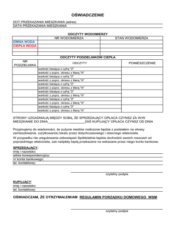 OŚWIADCZENIE DOT.PRZEKAZANIA MIESZKANIA (adres) DATA PRZEKAZANIA MIESZKANIA ODCZYTY WODOMIERZY NR WODOMIERZA STAN WODOMIERZA ZIMNA WODA CIEPŁA WODA ODCZYTY PODZIELNIKÓW CIEPŁA NR PODZIELNIKA POMIESZCZENIE ODCZYTY wartość bieżąca z cyfrą "2" wartość z poprz. okresu z literą "A" wartość bieżąca z cyfrą "2" wartość z poprz. okresu z literą "A" wartość bieżąca z cyfrą "2" wartość z poprz. okresu z literą "A" wartość bieżąca z cyfrą "2" wartość z poprz. okresu z literą "A" wartość bieżąca z cyfrą "2" wartość z poprz. okresu z literą "A" wartość bieżąca z cyfrą "2" wartość z poprz. okresu z literą "A" STRONY UZGADNIAJĄ MIĘDZY SOBĄ, ŻE SPRZEDAJĄCY OPŁACA CZYNSZ ZA W/W MIESZKANIE DO DNIA____________ ZAŚ KUPUJĄCY OPŁACA CZYNSZ OD DNIA Przyjmujemy do wiadomości, że zużycie mediów rozliczone będzie z podziałem na okresy zamieszkiwania. (użytkowania) lokalu przez dotychczasowego i obecnego właściciela. W przypadku nie uregulowania zobowiązań Spółdzielnia będzie dochodzić swoich roszczeń od poprzedniego właściciela, zaś nadpłaty będą przekazane na wskazane przez niego konto bankowe. SPRZEDAJĄCY: imię i nazwisko: adres korespondencyjny: nr konta bankowego: tel. kontaktowy: czytelny podpis KUPUJĄCY: imię i nazwisko: tel. kontaktowy: OŚWIADCZAM, ŻE OTRZYMAŁEM/AM REGULAMIN PORZĄDKU DOMOWEGO WSM czytelny podpis