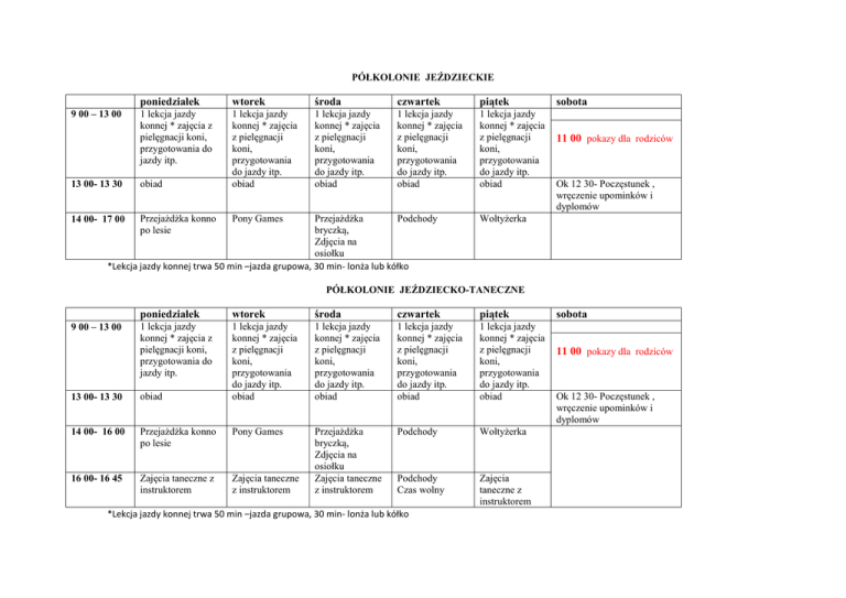 PÓŁKOLONIE JEŹDZIECKIE 9 00 – 13 00 13 00- 13 30 poniedziałek wtorek środa czwartek piątek 1 lekcja jazdy konnej * zajęcia z pielęgnacji koni, przygotowania do jazdy itp. 1 lekcja jazdy konnej * zajęcia z pielęgnacji koni, przygotowania do jazdy itp. obiad 1 lekcja jazdy konnej * zajęcia z pielęgnacji koni, przygotowania do jazdy itp. obiad 1 lekcja jazdy konnej * zajęcia z pielęgnacji koni, przygotowania do jazdy itp. obiad 1 lekcja jazdy konnej * zajęcia z pielęgnacji koni, przygotowania do jazdy itp. obiad obiad Przejażdżka Podchody bryczką, Zdjęcia na osiołku *Lekcja jazdy konnej trwa 50 min –jazda grupowa, 30 min- lonża lub kółko 14 00- 17 00 Przejażdżka konno po lesie Pony Games sobota 11 00 pokazy dla rodziców Ok 12 30- Poczęstunek , wręczenie upominków i dyplomów Woltyżerka PÓŁKOLONIE JEŹDZIECKO-TANECZNE 9 00 – 13 00 poniedziałek wtorek środa czwartek piątek 1 lekcja jazdy konnej * zajęcia z pielęgnacji koni, przygotowania do jazdy itp. 1 lekcja jazdy konnej * zajęcia z pielęgnacji koni, przygotowania do jazdy itp. obiad 1 lekcja jazdy konnej * zajęcia z pielęgnacji koni, przygotowania do jazdy itp. obiad 1 lekcja jazdy konnej * zajęcia z pielęgnacji koni, przygotowania do jazdy itp. obiad 1 lekcja jazdy konnej * zajęcia z pielęgnacji koni, przygotowania do jazdy itp. obiad Przejażdżka bryczką, Zdjęcia na osiołku Zajęcia taneczne z instruktorem Podchody Woltyżerka Podchody Czas wolny Zajęcia taneczne z instruktorem 13 00- 13 30 obiad 14 00- 16 00 Przejażdżka konno po lesie Pony Games 16 00- 16 45 Zajęcia taneczne z instruktorem Zajęcia taneczne z instruktorem *Lekcja jazdy konnej trwa 50 min –jazda grupowa, 30 min- lonża lub kółko sobota 11 00 pokazy dla rodziców Ok 12 30- Poczęstunek , wręczenie upominków i dyplomów