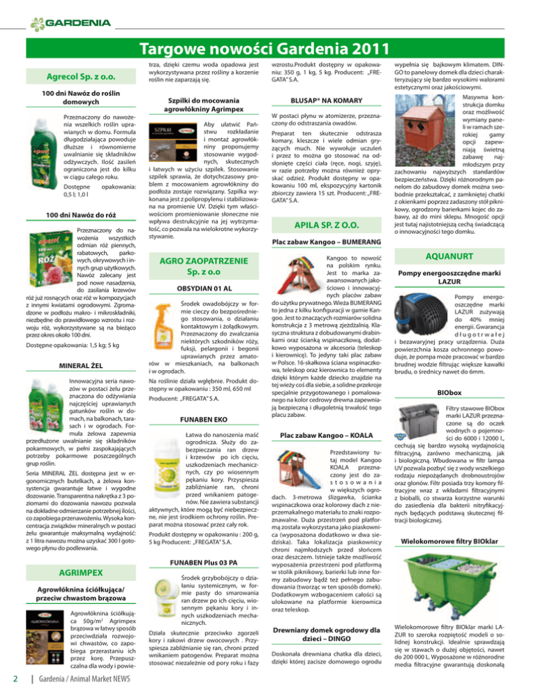 Targowe nowości Gardenia 2011 Agrecol Sp. z o.o. 100 dni Nawóz do roślin domowych Przeznaczony do nawożenia wszelkich roślin uprawianych w domu. Formuła długodziałająca powoduje dłuższe i równomierne uwalnianie się składników odżywczych. Ilość zasileń ograniczona jest do kilku w ciągu całego roku. Dostępne 0,5 l; 1,0 l opakowania: 100 dni Nawóz do róż Przeznaczony do nawożenia wszystkich odmian róż piennych, rabatowych, parkowych, okrywowych i innych grup użytkowych. Nawóz zalecany jest pod nowe nasadzenia, do zasilania krzewów róż już rosnących oraz róż w kompozycjach z innymi kwiatami ogrodowymi. Zgromadzone w podłożu makro- i mikroskładniki, niezbędne do prawidłowego wzrostu i rozwoju róż, wykorzystywane są na bieżąco przez okres około 100 dni. Dostępne opakowania: 1,5 kg; 5 kg MINERAL ŻEL Innowacyjna seria nawozów w postaci żelu przeznaczona do odżywiania najczęściej uprawianych gatunków roślin w domach, na balkonach, tarasach i w ogrodach. Formuła żelowa zapewnia przedłużone uwalnianie się składników pokarmowych, w pełni zaspokajających potrzeby pokarmowe poszczególnych grup roślin. Seria MINERAL ŻEL dostępna jest w ergonomicznych butelkach, a żelowa konsystencja gwarantuje łatwe i wygodne dozowanie. Transparentna nakrętka z 3 poziomami do dozowania nawozu pozwala na dokładne odmierzanie potrzebnej ilości, co zapobiega przenawożeniu. Wysoka koncentracja związków mineralnych w postaci żelu gwarantuje maksymalną wydajność: z 1 litra nawozu można uzyskać 300 l gotowego płynu do podlewania. trza, dzięki czemu woda opadowa jest wykorzystywana przez rośliny a korzenie roślin nie zaparzają się. wzrostu.Produkt dostępny w opakowaniu: 350 g, 1 kg, 5 kg. Producent: „FREGATA” S.A. wypełnia się bajkowym klimatem. DINGO to panelowy domek dla dzieci charakteryzujący się bardzo wysokimi walorami estetycznymi oraz jakościowymi. Szpilki do mocowania agrowłókniny Agrimpex BLUSAP® NA KOMARY Masywna konstrukcja domku oraz możliwość wymiany paneli w ramach szerokiej gamy opcji zapewniają świetną zabawę najmłodszym przy zachowaniu najwyższych standardów bezpieczeństwa. Dzięki różnorodnym panelom do zabudowy domek można swobodnie przekształcać, z zamkniętej chatki z okienkami poprzez zadaszony stół piknikowy, ogrodzony barierkami kojec do zabawy, aż do mini sklepu. Mnogość opcji jest tutaj najistotniejszą cechą świadczącą o innowacyjności tego domku. Aby ułatwić Państwu rozkładanie i montaż agrowłókniny proponujemy stosowanie wygodnych, skutecznych i łatwych w użyciu szpilek. Stosowanie szpilek sprawia, że dotychczasowy problem z mocowaniem agrowłókniny do podłoża zostaje rozwiązany. Szpilka wykonana jest z polipropylenu i stabilizowana na promienie UV. Dzięki tym właściwościom promieniowanie słoneczne nie wpływa destrukcyjnie na jej wytrzymałość, co pozwala na wielokrotne wykorzystywanie. AGRO ZAOPATRZENIE Sp. z o.o OBSYDIAN 01 AL Środek owadobójczy w formie cieczy do bezpośredniego stosowania, o działaniu kontaktowym i żołądkowym. Przeznaczony do zwalczania niektórych szkodników róży, fuksji, pelargonii i begonii uprawianych przez amatorów w mieszkaniach, na balkonach i w ogrodach. Na roślinie działa wgłębnie. Produkt dostępny w opakowaniu : 350 ml, 650 ml Producent: „FREGATA” S.A. FUNABEN EKO Łatwa do nanoszenia maść ogrodnicza. Służy do zabezpieczania ran drzew i krzewów po ich cięciu, uszkodzeniach mechanicznych, czy po wiosennym pękaniu kory. Przyspiesza zabliźnianie ran, chroni przed wnikaniem patogenów. Nie zawiera substancji aktywnych, które mogą być niebezpieczne, nie jest środkiem ochrony roślin. Preparat można stosować przez cały rok. Produkt dostępny w opakowaniu : 200 g, 5 kg Producent: „FREGATA” S.A. FUNABEN Plus 03 PA AGRIMPEX Agrowłóknina ściółkująca/ przeciw chwastom brązowa Agrowłóknina ściółkująca 50g/m2 Agrimpex brązowa w łatwy sposób przeciwdziała rozwojowi chwastów, co zapobiega przerastaniu ich przez korę. Przepuszczalna dla wody i powie- 2| Gardenia / Animal Market NEWS Środek grzybobójczy o działaniu systemicznym, w formie pasty do smarowania ran drzew po ich cięciu, wiosennym pękaniu kory i innych uszkodzeniach mechanicznych. Działa skutecznie przeciwko zgorzeli kory i rakowi drzew owocowych . Przyspiesza zabliźnianie się ran, chroni przed wnikaniem patogenów. Preparat można stosować niezależnie od pory roku i fazy W postaci płynu w atomizerze, przeznaczony do odstraszania owadów. Preparat ten skutecznie odstrasza komary, kleszcze i wiele odmian gryzących much. Nie wywołuje uczuleń i przez to można go stosować na odsłonięte części ciała (ręce, nogi, szyję), w razie potrzeby można również opryskać odzież. Produkt dostępny w opakowaniu 100 ml, ekspozycyjny kartonik zbiorczy zawiera 15 szt. Producent: „FREGATA” S.A. APILA SP. Z O.O. Plac zabaw Kangoo – BUMERANG Kangoo to nowość na polskim rynku. Jest to marka zaawansowanych jakościowo i innowacyjnych placów zabaw do użytku prywatnego. Wieża BUMERANG to jedna z kilku konfiguracji w gamie Kangoo. Jest to znaczących rozmiarów solidna konstrukcja z 3 metrową zjeżdżalnią. Klasyczna struktura z dobudowanymi drabinkami oraz ścianką wspinaczkową, dodatkowo wyposażona w akcesoria (teleskop i kierownicę). To jedyny taki plac zabaw w Polsce. 16-skałkowa ściana wspinaczkowa, teleskop oraz kierownica to elementy dzięki którym każde dziecko znajdzie na tej wieży coś dla siebie, a solidne przekroje specjalnie przygotowanego i pomalowanego na kolor cedrowy drewna zapewniają bezpieczną i długoletnią trwałość tego placu zabaw. Plac zabaw Kangoo – KOALA Przedstawiony tutaj model Kangoo KOALA przeznaczony jest do zastosowania w większych ogrodach. 3-metrowa ślizgawka, ścianka wspinaczkowa oraz kolorowy dach z nieprzemakalnego materiału to znaki rozpoznawalne. Du