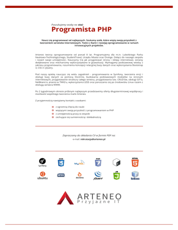 Poszukujemy osoby na staż: Programista PHP Naucz się programować od najlepszych. Szukamy osób, które wiążą swoją przyszłość z tworzeniem serwisów internetowych. Twórz z Nami i rozwijaj oprogramowanie w ramach innowacyjnych projektów. Arteneo tworzy oprogramowanie od ponad 8 lat. Programujemy dla m.in. Lubelskiego Parku Naukowo-Technologicznego, StudentTravel, Urzędu Miasta oraz Orange. Dołącz do naszego zespołu i rozwiń swoje umiejętności. Nauczymy Cię jak przygotować strony i sklepy internetowe, serwisy dedykowane oraz mechanizmy wykorzystywane w grywalizacji. Wymagamy podstawowej wiedzy z zakresu programowania, rozumienia koncepcji relacyjnej bazy danych oraz wykorzystania Bootstrap 3, CSS 3 i jQuery. Pod naszą opieką nauczysz się wielu zagadnień - programowania w Symfony, tworzenia encji i obsługi bazy danych za pomocą Doctrine, budowania podstawowych modułów na stronach internetowych, przygotowanie struktury całego serwisu, przygotowania tzw. CRUD'ów, obsługi GIT'a, NetBeans'a, pisania w TWIG'u, wykorzystania LESS oraz poruszania się po środowisku Linux razem z obsługą serwera WWW. Po 2 tygodniowym okresie próbnym najlepszym przedstawimy oferty długoterminowej współpracy i możliwość wspólnego tworzenia marki Arteneo. Z przyjemnością nawiążemy kontakt z osobami: z ogromną chęcią do nauki wiążącymi swoją przyszłość z programowaniem w PHP z umiejętnością pracy w zespole cechujące się sumiennością i dokładnością Zapraszamy do składania CV w formie PDF na: e-mail: [email protected]