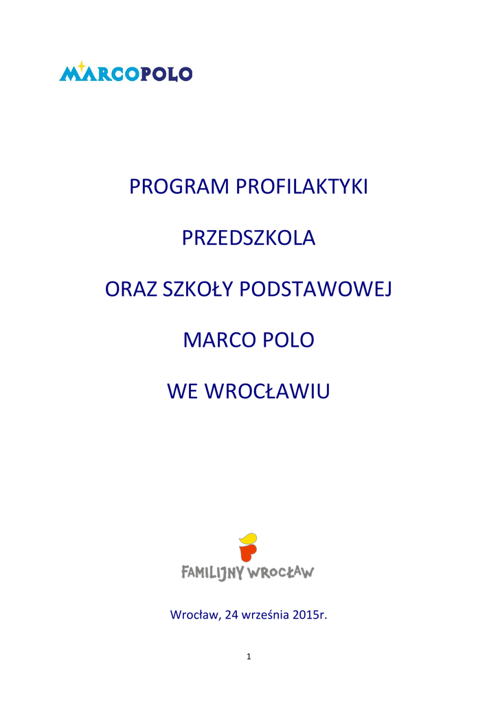 PROGRAM PROFILAKTYKI PRZEDSZKOLA ORAZ SZKOŁY PODSTAWOWEJ MARCO POLO WE WROCŁAWIU Wrocław, 24 września 2015r. 1 Podstawa prawna: Rozporządzenie MEN z dnia 27 sierpnia 2012 r. w sprawie podstawy programowej wychowania przedszkolnego oraz kształcenia ogólnego w poszczególnych typach szkół. Rozporządzenie MENiS z dnia 31 stycznia 2003r. w sprawie szczegółowych form działalności wychowawczej, zapobiegawczej wśród dzieci i młodzieży zagrożonych uzależnieniem Rozporządzenie Ministra Edukacji Narodowej z dnia 21 maja 2001 r. w sprawie ramowych statutów publicznego przedszkola oraz publicznych szkół (Dz. U. z 2001r. Nr 61, poz. 624 z późn. zm.) CEL I ZADANIA SZKOLNO - PRZEDSZKOLNEJ PROFILAKTYKI Działalność edukacyjna naszej szkoły i przedszkola określana jest przez zestaw programów nauczania i wychowania, program wychowawczy i program profilaktyki dostosowany do potrzeb rozwojowych uczniów, wychowanków oraz potrzeb środowiska. Nadrzędnym celem profilaktyki szkoły podstawowej i przedszkola jest chronienie ucznia przed zagrożeniami na każdym poziomie jego rozwoju. Ponadto należy rozwijać u ucznia, wychowanka umiejętności nawiązywania kontaktu, usprawniać relacje interpersonalne. Stwarzać uczniowi sytuacje podnoszące jego poczucie wartości, nakłaniać do pracy nad sobą, wskazywać pozytywne wzorce. Biorąc pod uwagę spostrzeżenia kadry dydaktycznej i specjalistów, motywy negatywnych zachowań uczniów, a także czynniki sprzyjające tworzeniu dobrej sytuacji wychowawczej szkoły i przedszkola należy przyjąć następujące kierunki działań profilaktycznych: A) dbać o bezpieczeństwo uczniów w szkole, przedszkolu i poza nimi B) promować zdrowy styl życia C) zapobiegać przemocy i agresji oraz stresowi D) zapobiegać niepowodzeniom szkolnym i przedszkolnym E) nieść pomoc uczniów z rodzin problemowych i w trudnej sytuacji materialnej realizacja programów zdrowotnych (psychodietetyka) F) wspierać dzieci 6-letnie m.in. z uwagi na obniżenie wieku szkolnego 2 OKREŚLENIE KWESTII I KRYTERIÓW SZKOLNO - PRZEDSZKOLNEGO PROGRAMU PROFILAKTYKI NA PODSTAWIE OCENY POTRZEB I ZASOBÓW SZKOŁY, PRZEDSZKOLA SKOMPONOWANO PROGRAM PROFILAKTYKI OBEJMUJĄCY PONIŻSZE BLOKI TEMATYCZNE (OBSZARY ). Psyche Zdrowie Bezpieczeństwo Bezpieczeństwo Zapobieganie niebezpieczeństwom w szkole i w przedszkolu Osłabienie czynników ryzyka Wczesna interwencja w sytuacji zaistniałego ryzyka Diagnoza zagrożeń i niebezpieczeństwa w szkole, przedszkolu Zwiększenie samoświadomości uczniów, wychowanków co do niebezpieczeństwa i zagrożeń Zapobieganie zachowaniom agresywnym 3 Zdrowie Zdrowe odżywanie Mleko w szkole Warzywa i Owoce w szkole Profilaktyka uzależnień (klasy IV-VI) Psyche Dbanie o wszechstronny rozwój dziecka i dobro uczniów, wychowanków, Wyrównywanie szans edukacyjnych uczniów przez przeciwdziałanie niepowodzeniom szkolnym Motywowanie uczniów do nauki, Wspieranie uczniów zdolnych oraz rozwijanie zainteresowań uczniów, Wzmacnianie poczucia własnej wartości, Rozwijanie samoświadomości i akceptacji siebie, Rozwijanie pozytywnego myślenia, Kształtowanie zachowań asertywnych, zapoznanie z podstawowymi informacjami na temat asertywności, Zaznajomienie z pojęciem: emocje, oraz ich rodzajami, Kształtowanie umiejętności radzenia sobie z trudnymi emocjami, Rozwijanie umiejętności wyrażania uczuć i przyznawania się do błędów, Rozwijanie umiejętności współpracy, budowanie zaufania, Przełamywanie onieśmielenia, współpraca i integracja Kształtowanie odpowiedzialności za siebie i innych, Rozwijanie postaw życzliwości, szacunku i zrozumienia, Rozwijanie poczucia przynależności do rodziny, grupy, klasy, społeczności lokalnej, Kształtowanie umiejętności rozumienia własnych ról społecznych, Rozwijanie umiejętności odróżniania dobra od zła, Kształtowanie poczucia tożsamości i przynależności do danego miejsca, Kształtowanie pojęcia tolerancji Metody pracy Ankiety Burza mózgów Pogadanki, dyskusje Warsztaty Drama Gry i zabawy 4 REALIZOWANE PROJEKTY W RAMACH PROGRAMU PROFILAKTYKI: - JAK RADZIĆ SOBIE ZE STRESEM ( ZAŁĄCZNIK NR 1) - URZECZYWISTNIANIE MARZEŃ, JAK DOTKNĄĆ GWIAZD? CZYLI WZMACNIANIE POCZUCIA WŁASNEJ WARTOŚCI (ZAŁĄCZNIK NR 2) - STOP DYSKRYMINACJI (ZAŁĄCZNIK NR 3) - DBAMY O ZDROWIE - BEZPIECZEŃSTWO W INTERNECIE (W RAMACH PROGRAMU „CHRONIMY DZIECI”) - TYDZIEŃ TOLERANCJI (LISTOPAD) ZADANIA PROFILAKTYCZNE Zadania profilaktyczne nauczycieli szkoły i przedszkola. • • • • • informowanie na bieżąco wychowawców o niewłaściwym zachowaniu ich wychowanków zarówno przez nauczycieli dyżurujących, jak pozostałych nauczycieli i pracowników szkoły, obserwacja zachowania uczniów w miejscach publicznych i zwracanie uwagi na przejawy agresji, palenia papierosów, spożywania alkoholu czy niszczenia mienia. wdrażanie do świadomego unikania zagrożeń oraz kształtowanie umiejętności odmawiania i negocjacji, natychmiastowa, zgodna ze Statutem Szkoły/Przedszkola reakcja na przejawy agresji rówieśniczej, przemocy i zachowania dyskryminacyjne. dawanie przykładów odpowiedzialności, sumienności, umiejętności rozwiązywania konfliktów, radzenia sobie w trudnych sytuacjach. Zadania profilaktyczne wychowawców klasowych, grup przedszkolnych. • • • • • • pomoc uczniom w rozwiązywaniu trudności życiowych i rodzinnych, uruchomienie akcji informacyjnej mającej na celu uświadomienie uczniom możliwości zwrócenia się z problemem do konkretnej osoby w szkole: wychowawcy, pedagoga, psychologa, dyrektora szkoły, podnoszenie poziomu kultury osobistej uczniów - godziny wychowawcze dotyczące zachowania się w stosunku do rówieśników, osób dorosłych, w miejscach publicznych (kino, teatr, itp.), współpraca z rodziną- inicjowanie spotkań mających na celu omawianie problemów wysuwanych przez rodziców, np. wywiadówki profilaktyczne, realizacja programów 