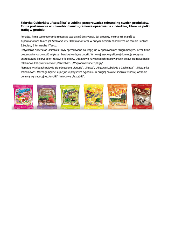 Fabryka Cukierków „Pszczółka" z Lublina przeprowadza rebranding swoich produktów. Firma postanowiła wprowadzić dwustugramowe opakowania cukierków, które na półki trafią w grudniu. Ponadto, firma systematycznie rozszerza swoją sieć dystrybucji. Jej produkty można już znaleźć w supermarketach takich jak Stokrotka czy POLOmarket oraz w dużych sieciach handlowych na terenie Lublina: E.Leclerc, Intermarche i Tesco. Dotychczas cukierki od „Pszczółki" były sprzedawana na wagę lub w opakowaniach stugramowych. Teraz firma postanowiła wprowadzić większe i bardziej wydajne paczki. W nowej szacie graficznej dominują soczyste, energetyczne kolory: żółty, różowy i fioletowy. Dodatkowo na wszystkich opakowaniach pojawi się nowe hasło reklamowe Fabryki Cukierków „Pszczółka" - „Wyprodukowane z pasją". Pierwsze w sklepach pojawią się odnowione „Jogusie", „Musss", „Miętowe Lubelskie z Czekoladą" i „Mieszanka Imieninowa". Można je będzie kupić już w przyszłym tygodniu. W drugiej połowie stycznia w nowej odsłonie pojawią się tradycyjne „Kukułki" i miodowe „Pszczółki".