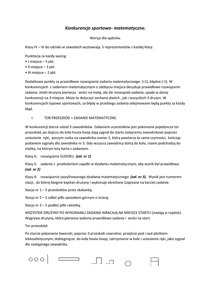 Konkurencje sportowo- matematyczne. Wersja dla sędziów. Klasy IV – VI do udziału w zawodach wystawiają 5 reprezentantów z każdej klasy. Punktacja za każdy wyścig • I miejsce – 5 pkt. • II miejsce – 3 pkt. • III miejsce – 2 pkt. Dodatkowe punkty za prawidłowe rozwiązanie zadania matematycznego (+1), błędne (-1). W konkurencjach z zadaniem matematycznym o zdobyciu miejsca decyduje prawidłowe rozwiązanie zadania. Jeżeli drużyna pierwsza wróci na metę, ale źle rozwiązała zadanie, spada w danej konkurencji na 3 miejsce. Może to dotyczyć zarówno dwóch , jak i wszystkich 3 drużyn. W konkurencjach typowo sportowych, za błędy w przebiegu zadania odejmowane będą punkty za każdy błąd. I. TOR PRZESZKÓD + ZADANIE MATEMATYCZNE. W konkurencji bierze udział 3 zawodników. Zadaniem uczestników jest pokonanie pojedynczo tor przeszkód, po dojściu do koła houla-hoop dają sygnał do startu kolejnemu zawodnikowi poprzez uniesienie ręki, poczym czeka na zawodnika numer 2, który powtarza te same czynności, kończąc podaniem sygnału dla zawodnika nr 3. Gdy wszyscy zawodnicy dotrą do koła, razem podchodzą do stolika, na którym leży karta z zadaniem. Klasy 6: rozwiązanie SUDOKU (zał. nr 1) Klasy 5: zadanie z przełożeniem zapałki w działaniu matematycznym, aby wynik był prawidłowy (zał. nr 2) Klasy 4: rozwiązanie zaszyfrowanego działania matematycznego (zał. nr 3). Wynik jest numerem stacji, do której biegnie kapitan drużyny i wykonuje określone (zapisane na karcie) zadanie. Stacja nr 1 – 5 przeskoków przez skakankę. Stacja nr 2 – 5 odbić piłki sposobem górnym o ścianę. Stacja nr 3 – 5 podbić piłki rakietką. WSZYSTKIE DRUŻYNY PO WYKONANIU ZADANIA WRACAJĄ NA MIEJSCE STARTU (siadają w rzędzie). Wygrywa drużyna, która pierwsza wykona prawidłowo zadanie i wróci na start. Tor przeszkód: Po starcie pokonanie ławeczki, poprzez 3 przeskoki zawrotne; przejście pod i nad płotkiem lekkoatletycznym; dobiegnięcie do koła houla-hoop; zatrzymanie w kole i uniesienie ręki, jako sygnał dla następnego zawodnika. II. WYŚCIG KAPSLI DODAWANY. 5 zawodników. Kolejno uczestnicy biegną do ławeczki na której leży kapsel. Jednym „pstryknięciem” palców przesuwa kapsel po ławce. Jeżeli spadnie (każdorazowo) zawodnicy rozpoczynają od początku ławki. Po czym biegnie dalej i omija pachołek. Następnie wraca jak najszybciej do drużyny. Kolejny zawodnik powtarza zadanie. Wygrywa drużyna, której uda się przesunąć kapsel na koniec ławki, za wyznaczoną linią (ale kapsel nie może spaść na ziemię). W takim przypadku kolejno rozpoczynają od początku ławki. III. WYŚCIG WĘŻÓW + TANGRAM. 3 zawodników. Trzymając się za ręce (ustawienie w szeregu), zespół pokonuje slalom między pachołkami, dobiegając do stanowiska z zadaniem. W kopercie znajduje się tangram. Z wyciętych puzzli (figur geometrycznych) mają ułożyć określony na tangramie rysunek (zał. nr 4). Wygrywa drużyna, która pierwsza prawidłowo ułoży tangram i wróci slalomem (wąż) na start. IV. MARSZ Z UTRUDNIENIEM DO PIRAMIDY. 3 zawodników. Jeden zawodnik przechodzi trasę po polach/stopkach układanych przez 2 pozostałych zawodników, którymi są 2 koła houla-hoop. Pokonują trasę do stanowiska z zadaniem, gdzie losują z rozłożonych kartek liczbę. Z podanej liczby układają w wyznaczonym miejscu piramidę klocków. Po czym wracają na start w podany jak wyżej sposób. Wygrywa drużyna, która pierwsza wykona zadanie a piramida nie przewróci się. V. PRZENIEŚ PIŁKĘ + ODSZUKAJ LICZBY PODZIELNE PRZEZ 2,3,7. 5 zawodników. Kolejno zawodnicy biegną do piłki lekarskiej ułożonej na ringu i przenoszą na następne. Dobiegają do tablicy z zadaniem (zał. nr 5), w którym mają znaleźć liczbę podzielną przez: 4 klasy – 2 5 klasy – 3 6 klasy – 7 Zakreślają jedną ze znaleziony liczb i wracają na metę przenosząc ponownie piłkę lekarską. Każdy zawodnik odnajduje i zakreśla TYLKO jedną liczbę. Wygrywa drużyna, która pierwsza wykona prawidłowo zadanie. Za każdą właściwą odpowiedź: +1pkt., złą: -1pkt. 22 9 30 VI. DRUŻYNOWE PRZESKOKI PRZEZ SKAKANKĘ. 5 zawodników. Każda drużyna ma za zadanie zespołowo wykonać przeskoki przez skakankę w trzech próbach. Największa ilość skoków bez „skuchy” jest wyznacznikiem końcowej kwalifikacji. Dopuszczone są miejsca "ex aequo". Dodatkowe konkurencje: - kręcenie houla-hoop na czas - „sadzenie ziemniaków” - skoki z miejsca dodawane - rzuty piłką lekarską z miejsca dodawane Załącznik nr 1. SUDOKU: Gra polega na wypełnieniu diagramu w taki sposób, aby w każdym poziomym wierszu, w każdej pionowej kolumnie i w każdym czteropolowym kwadracie 2x2 znalazły się cyfry od 1 do 4. Cyfry w kwadracie, kolumnie i wierszu nie mogą się powtarzać. 3 2 1 4 4 1 2 3 1 3 4 2 2 4 3 1 Załącznik nr 3 A) Rozwiąż zaszyfrowane działanie matematyczne. Wynik jest numerem stacji, do której biegnie kapitan drużyny i wykonuje określone (zapisane na karcie) zadanie. = 8 = 10 = 1 - + = 3 Załącznik nr 3 B) Rozwiąż zaszyfrowane działanie matematyczne. Wynik jest numerem stacji, do której biegnie kapitan drużyny i wykonuje określone (zapisane na karcie) zadanie. = 9 = 4 = 6 + - = 1 Załącznik nr 3 C) Rozwiąż zaszyfrowane działanie matematyczne. Wynik jest numerem stacji, do której biegnie kapitan drużyny i wykonuje określone (zapisane na karcie) zadanie. = 2 = 7 = 3 - + = 2 Stacja nr 1 5 przeskoków przez skakankę. Stacja nr 2 5 odbić piłki sposobem górnym o ścianę. Stacja nr 3 5 podbić piłki rakietką. Załącznik nr 4. Z wyciętych puzzli (figur geometrycznych) ułóż określony na tangramie rysunek. Załącznik nr 5. Klasy IV Znajdź liczbę podzielną przez 2. 7 27 14 56 22 21 186 15 63 28 30 9 Klasy V Znajdź liczbę podzielną przez 3. 7 27 14 56 22 21 186 15 63 28 30 9 7 27 14 56 22 21 186 15 63 28 30 9 Klasy VI Znajdź lic